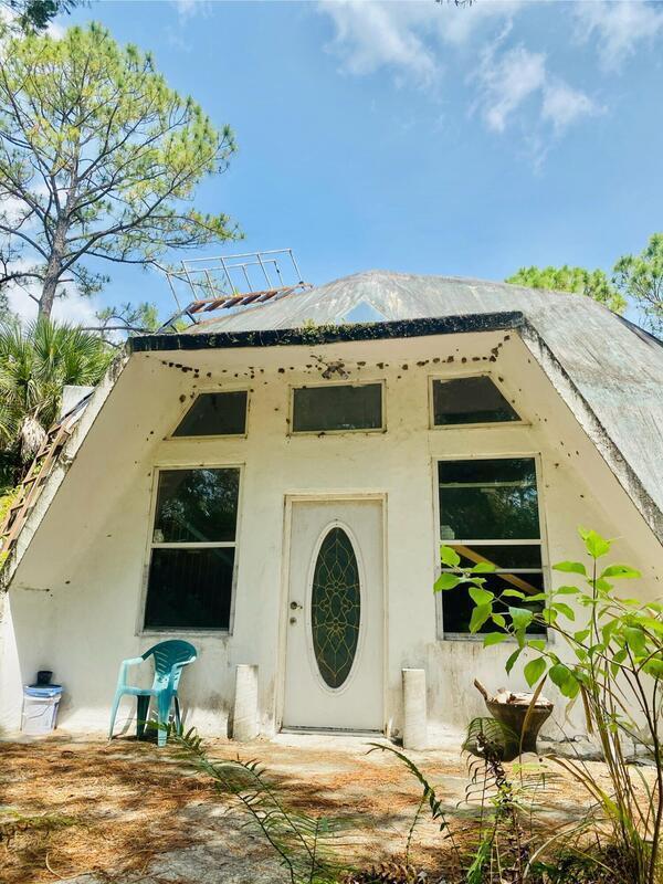 CASH ONLY no owner financing. Taking the simple life outdoors! Prepper Paradise on a freshwater canal! Remote off the grid homestead. Ideal for the hobbyist fisherman, or hunters. Geodesic dome has Certificate of occupancy. Dome is steel reinforced concrete, self supporting. It is not finished on the interior. Sold ''as is''. It is going to need a lot of work.(Seller estimates 50-100K BUT the bones are good. No kitchen, plumbing is in place. This handyman special: Needs a good stucco coating & the right elastomeric coating. Upstairs finished, needs flooring, Kitchen downstairs needs to be finished & it needs drywall repair, Upstairs bathroom components are not in place. Needs new well pump $700-800. Dock is marginal. Property is fenced. Septic located SE of property.