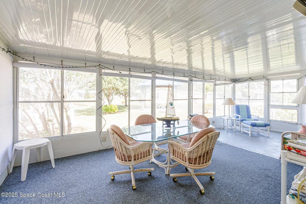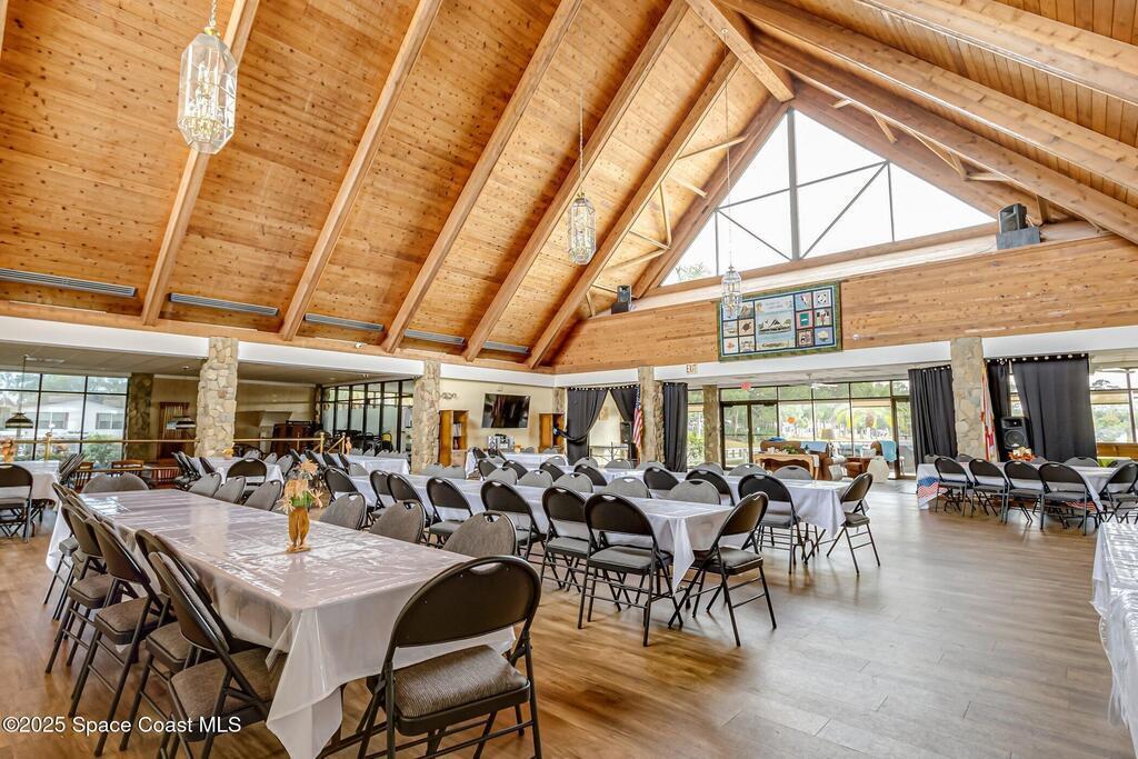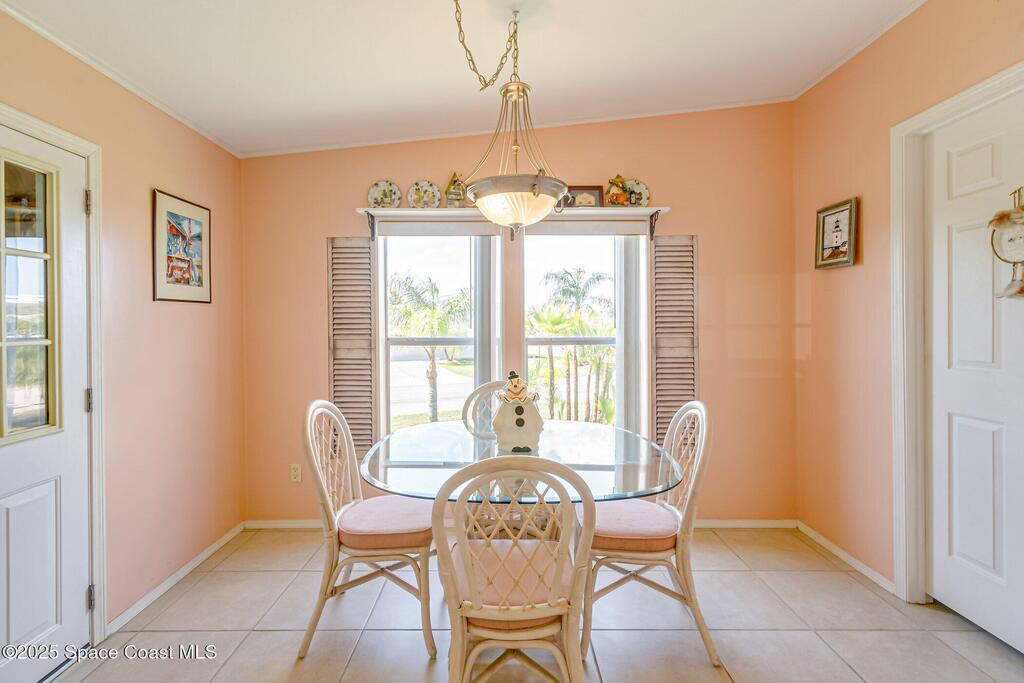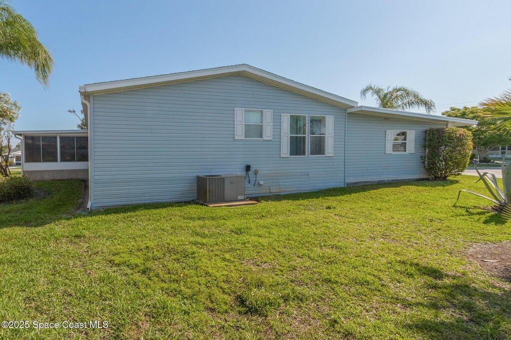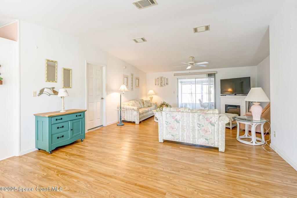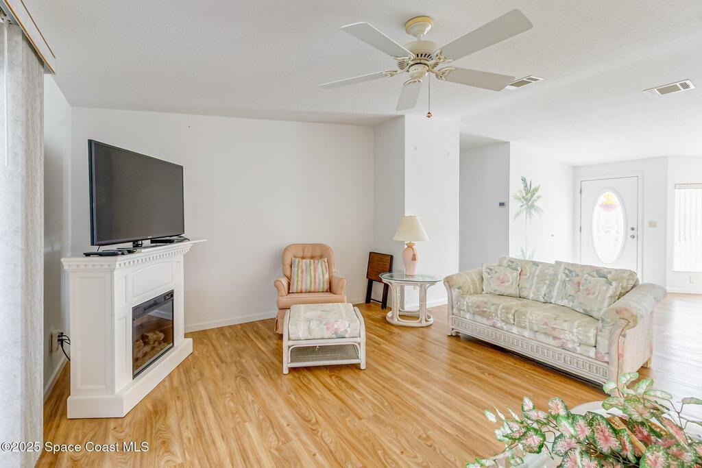 A coveted home in this Community 3/2 with a garage and waterview.Open floor plan with an extra large patio make this home perfect for family and friends to enjoy a party. extra parking spaces as well as a garage on a lovely corner lot make this home memorable' Dining for 8 on the patio as well as seating areas to view the sunset. Front door faces East for a perfect view of Rocket launches.You Own The Land and hoa covers lawncare.security cable and internet.