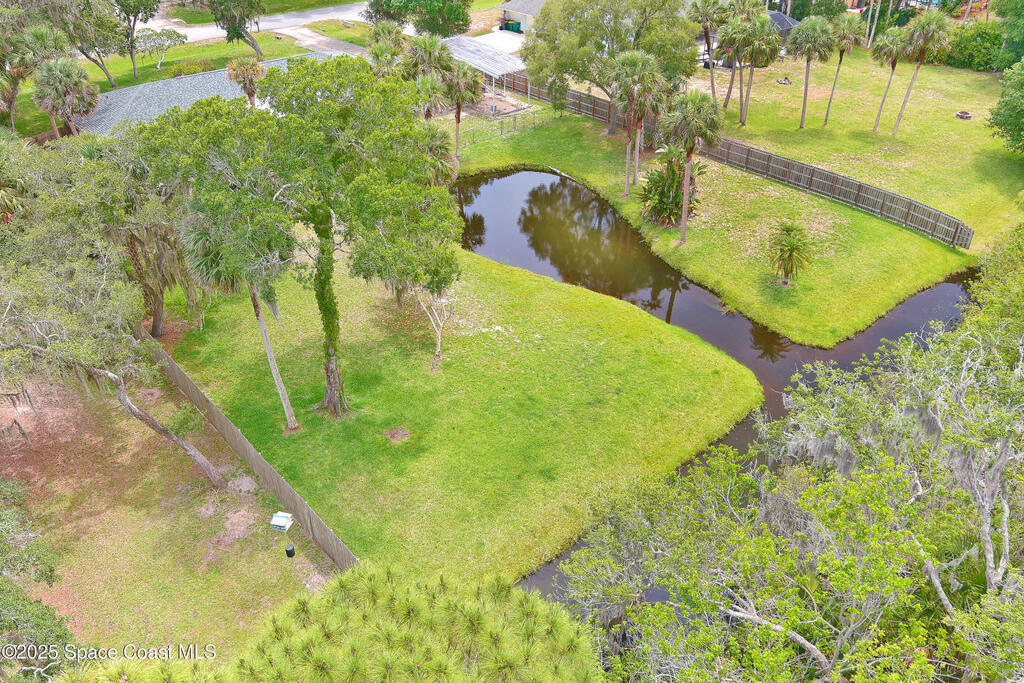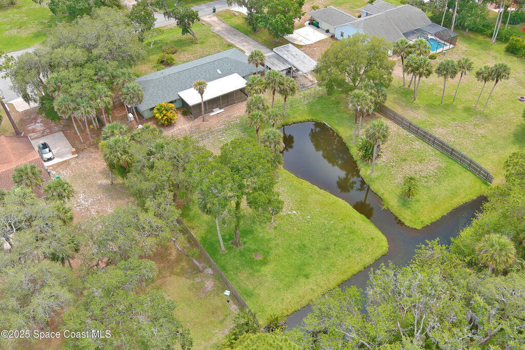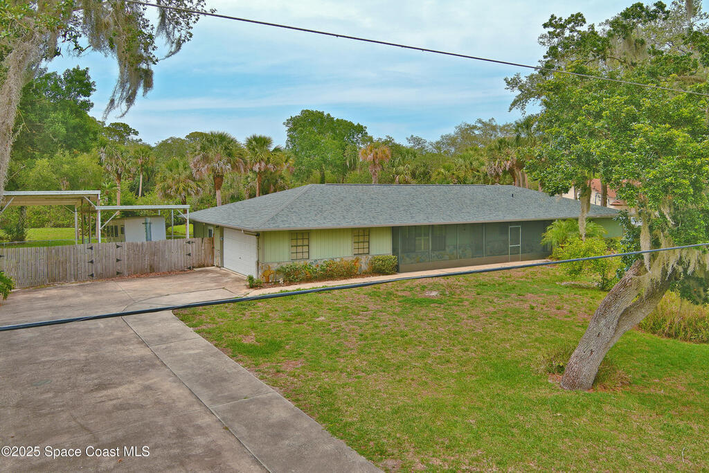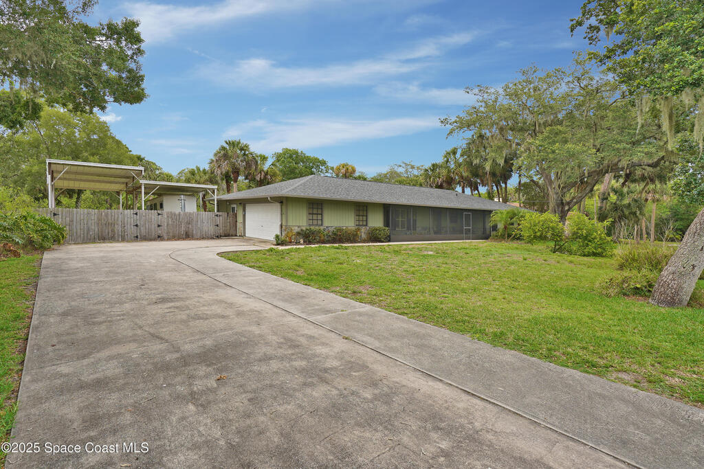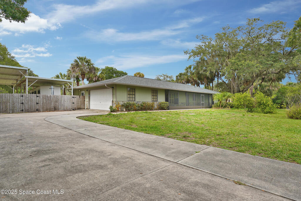 What an opportunity to own a treasure of a home on an acre in North Merritt Island on a pond. Enter through the large screen enclosed front porch to 3 bedrooms, 2 1/2 bathrooms, a bright living room with fireplace, a large dining area with view to the screened back porch and extra large yard. There's a separate laundry room with a sink and more storage cabinets and a utility room next to that. Additionally there is a spacious 2 car garage with plenty of room on the drive way as well as an RV/boat pole barn and an additional carport for trailer or vehicle storage. The large back yard is surrounded by wood and chain-link fences and there is a pond and stream. New roof in 2023 and brand new Generac 26Kw propane standby generator. This friendly cull-du-sac neighborhood is very close to shopping, churches, schools and restaurants, and conveniently located just 14 minutes to Cape Canaveral and the beaches and 40 minutes to Orlando.