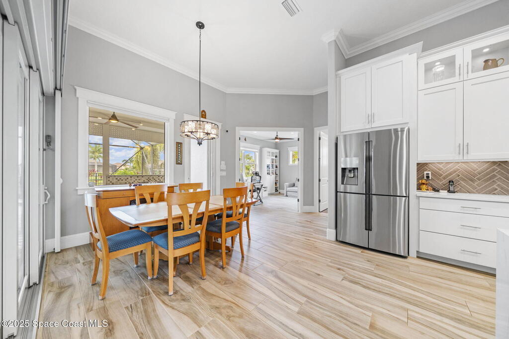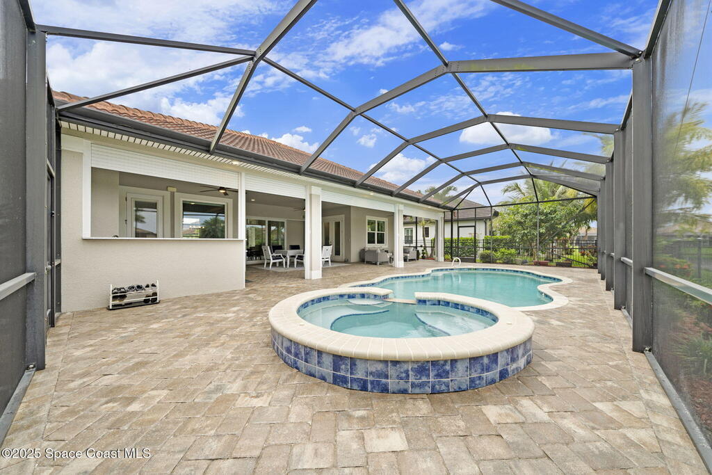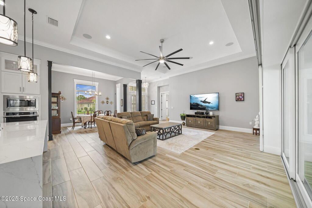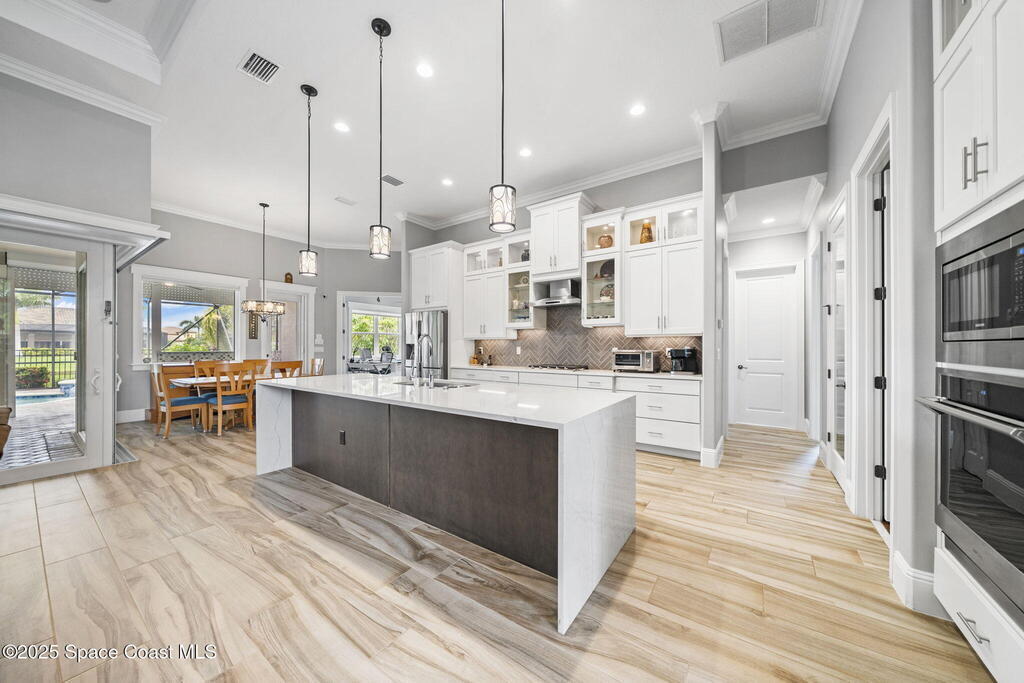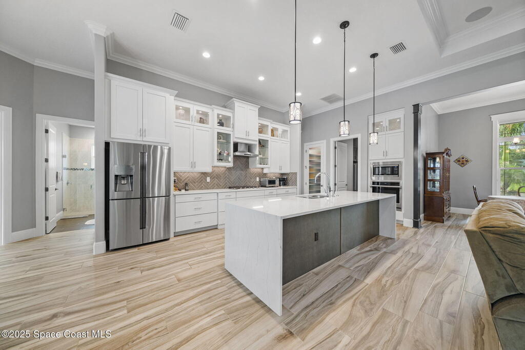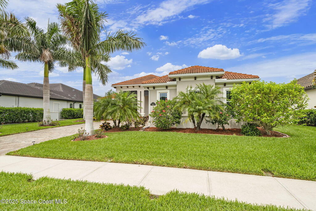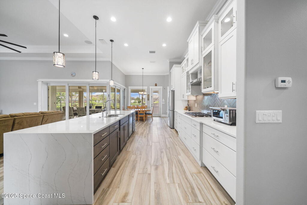 Welcome to luxury living in the heart of Viera! Located in the exclusive gated community of Seville at Addison Village, this stunning 3-bed, 3-bath, pool home with a flex room/office and 3-car garage is the epitome of Florida elegance and comfort! Built in 2018, this home boasts an impressive open-concept layout with soaring ceilings, elegant crown molding, and custom oversized baseboards. The designer kitchen is a showstopper, featuring crisp white shaker cabinetry, quartz countertops, stainless steel appliances, and a large center island perfect for entertaining. Beautiful plank tile flooring flows throughout the entire home, enhancing the home's clean and cohesive style. The spacious primary suite is your private retreat, complete with dual quartz vanities, a large glass-enclosed walk-in shower, his & her walk-in closets, and private access to the lanai. Step outside to your personal backyard oasis--a screened lanai and pool area designed for year-round enjoyment. IMPACT WINDOWS