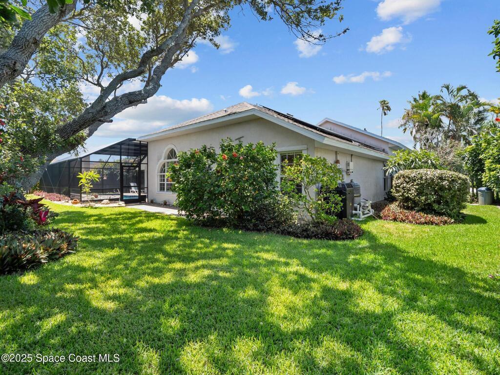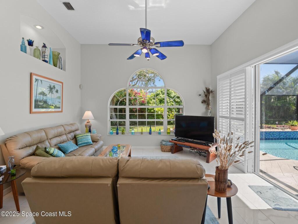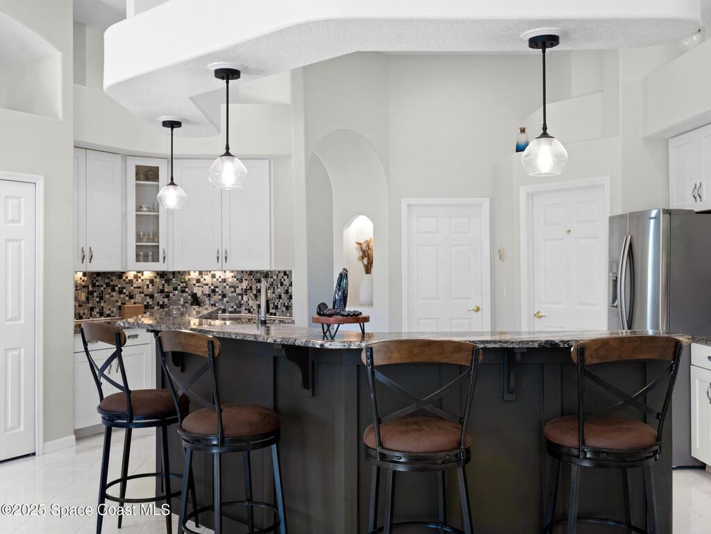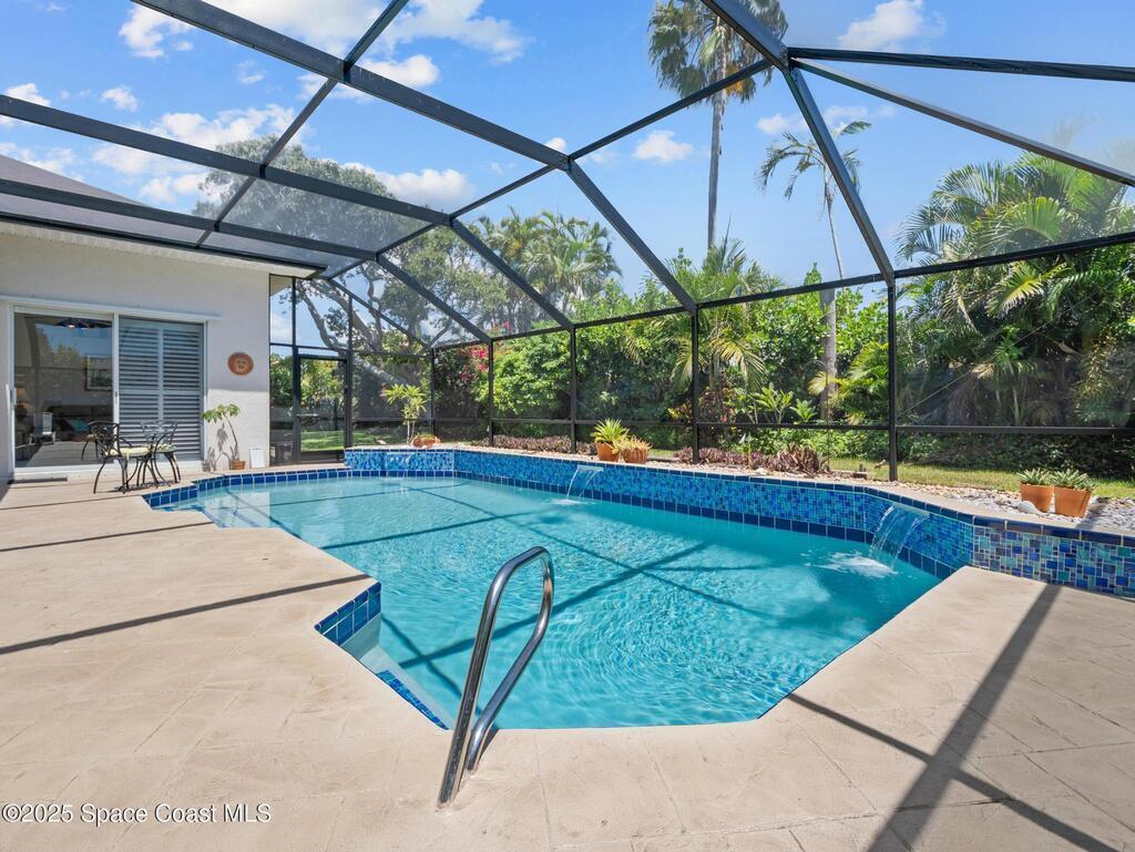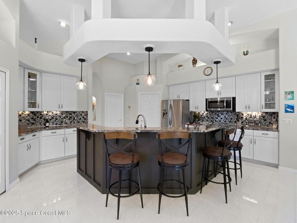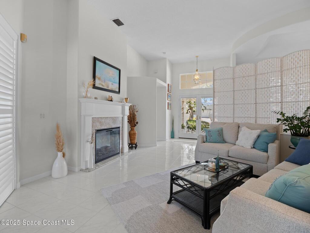 Just one block from the beach with private neighborhood beach access, this stunning, solar-powered home in Melbourne Beach offers the perfect blend of luxury, comfort, and coastal convenience. The bright, open layout features soaring 18-foot vaulted ceilings, glossy porcelain tile flooring, and a beautiful fireplace that enhances the warm, inviting atmosphere. Formal living and dining rooms include a removable privacy wall, while the spacious family room is bathed in natural light. The remodeled kitchen boasts brand-new cabinets, granite countertops, a 5-burner stove with double oven, and generous space for entertaining. The master suite is a true retreat with double vanities, quartz sinks, a soaking tub, separate shower, and his-and-hers walk-in closets. The second and third bedrooms feature vaulted ceilings, large closets, and waterproof cork flooring, while a large upstairs bonus room offers flexible space for a home office, gym, or guest area. Step outside to a saltwater,