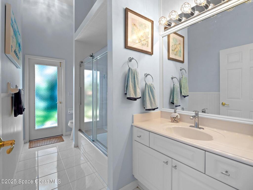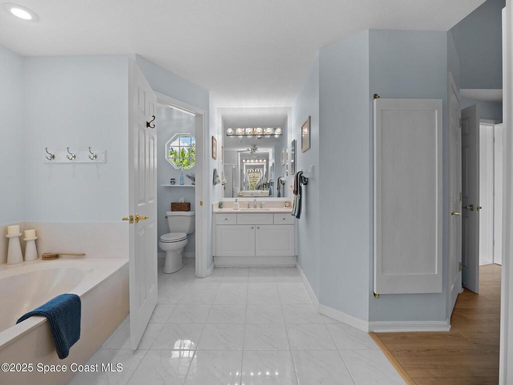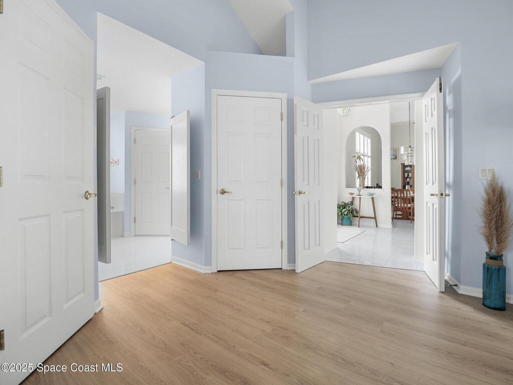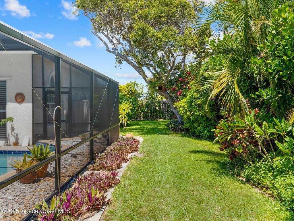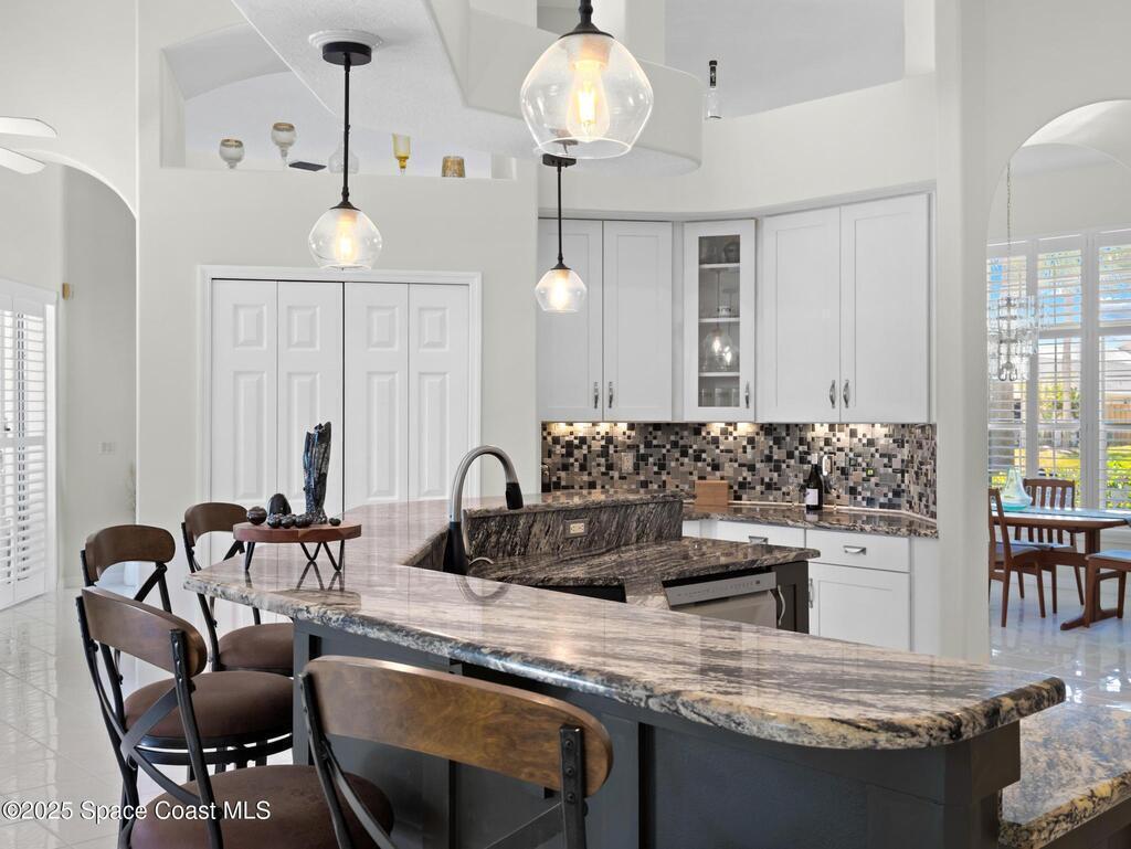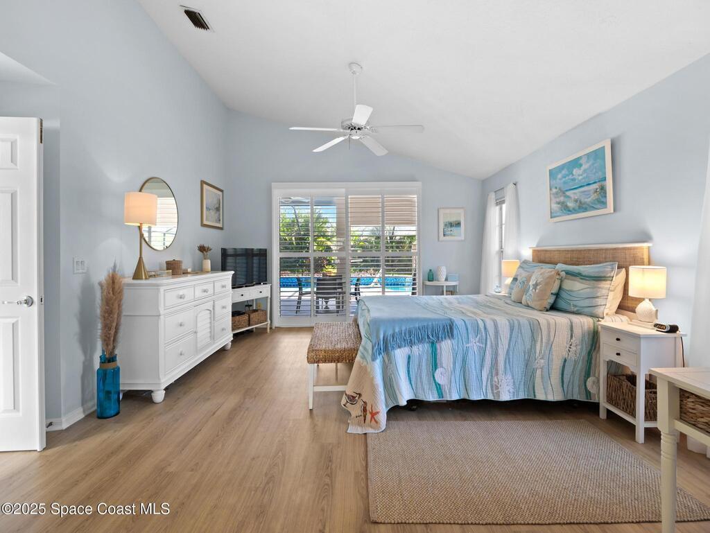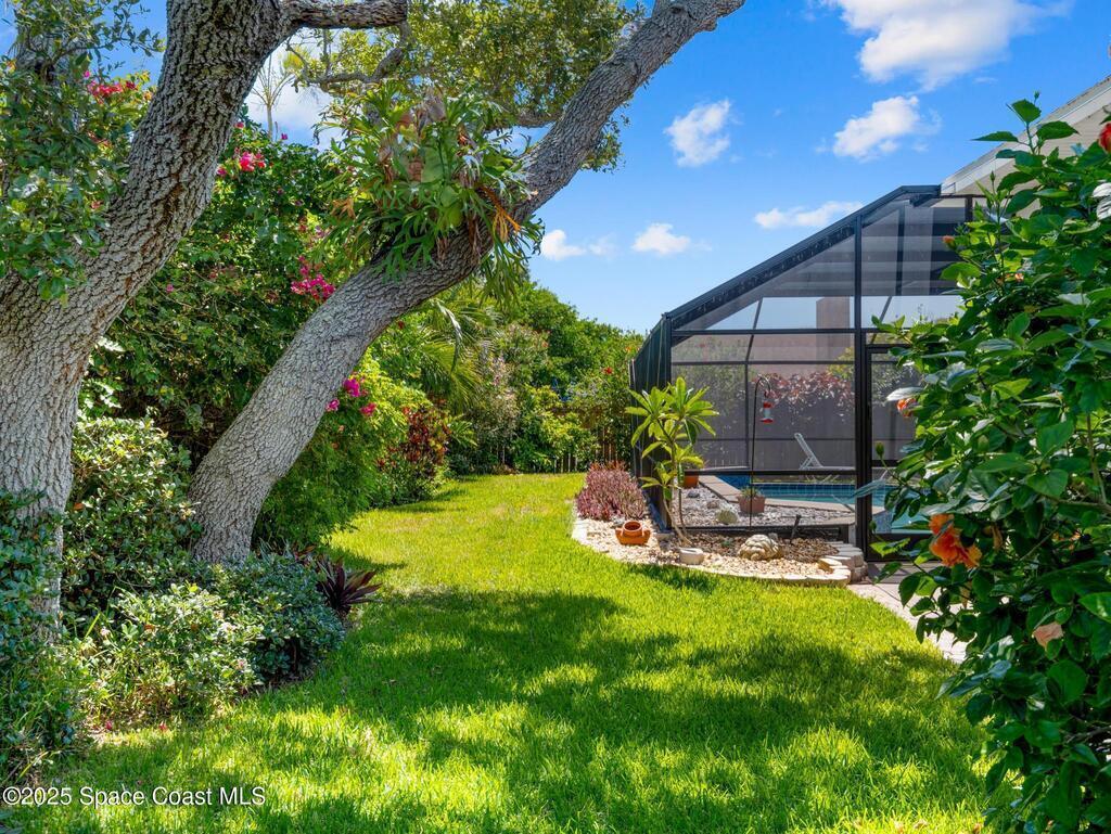 Just one block from the beach with private neighborhood beach access, this stunning, solar-powered home in Melbourne Beach offers the perfect blend of luxury, comfort, and coastal convenience. The bright, open layout features soaring 18-foot vaulted ceilings, glossy porcelain tile flooring, and a beautiful fireplace that enhances the warm, inviting atmosphere. Formal living and dining rooms include a removable privacy wall, while the spacious family room is bathed in natural light. The remodeled kitchen boasts brand-new cabinets, granite countertops, a 5-burner stove with double oven, and generous space for entertaining. The master suite is a true retreat with double vanities, quartz sinks, a soaking tub, separate shower, and his-and-hers walk-in closets. The second and third bedrooms feature vaulted ceilings, large closets, and waterproof cork flooring, while a large upstairs bonus room offers flexible space for a home office, gym, or guest area. Step outside to a saltwater,