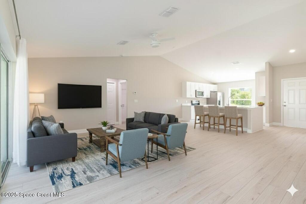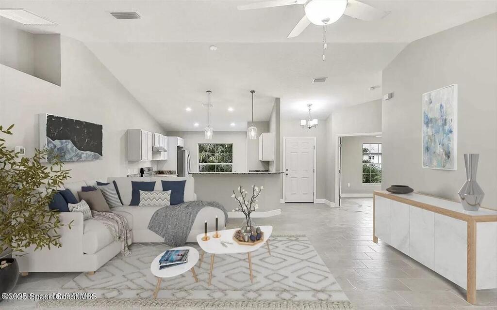 NO CLOSING COST LOANS AVAILABLE. One or more photo(s) has been virtually staged--New Construction. This Luxurious 3/4-bedroom, 2 Bath Property is exquisitely built with all of the upgrades nestled in the heart of Palm Bay. Inside you will find a wonderfully open floor plan perfect for family gatherings and entertaining. The capacious Chef's Kitchen is stylishly equipped with a prep island, solid wood cabinets, stainless steel appliances and ample storage. The contemporary living space is bursting with natural light and a flowing layout that is inviting and relaxing. Luxuriate in the vast Primary Suite that offers a collection of modern conveniences. This beautiful house is full of INCLUDED upgrades: solid wood soft close cabinets in the kitchen and in the bathrooms, luxury vinyl plank flooring (no carpet), tiled bathroom floors and floor-to-ceiling tiles in the showers, bathroom niches, granite countertops in the kitchen and baths, luxury handles, electric garage opener included.