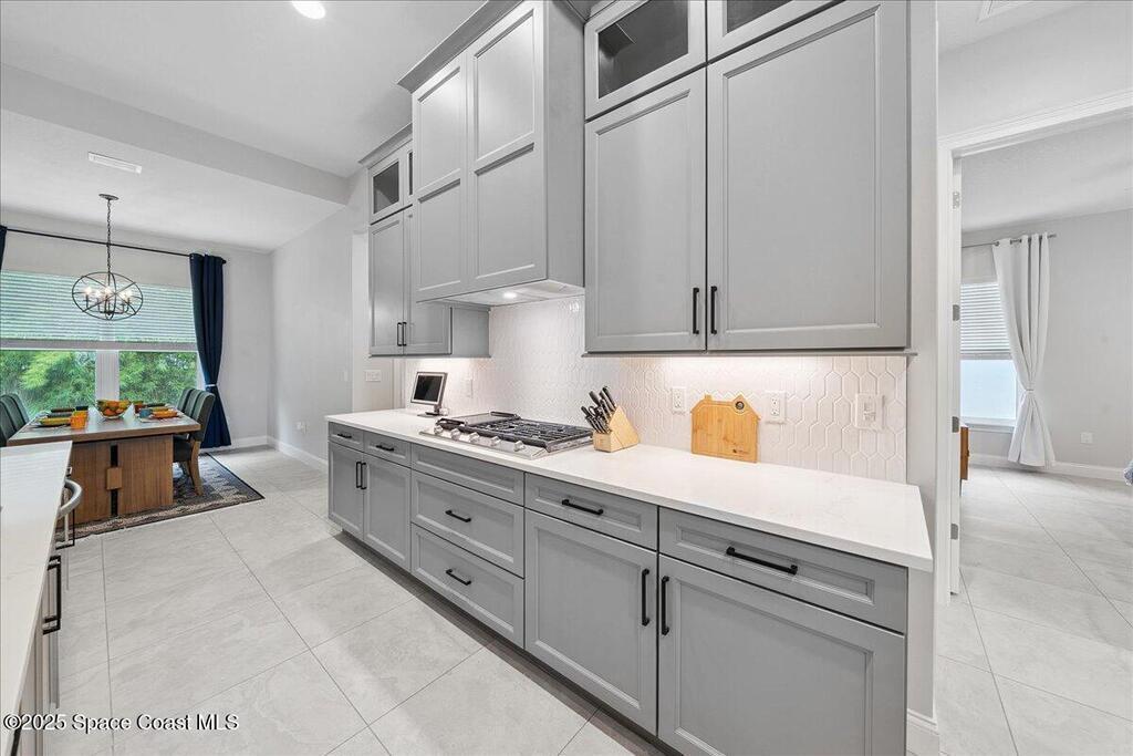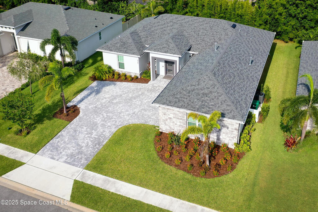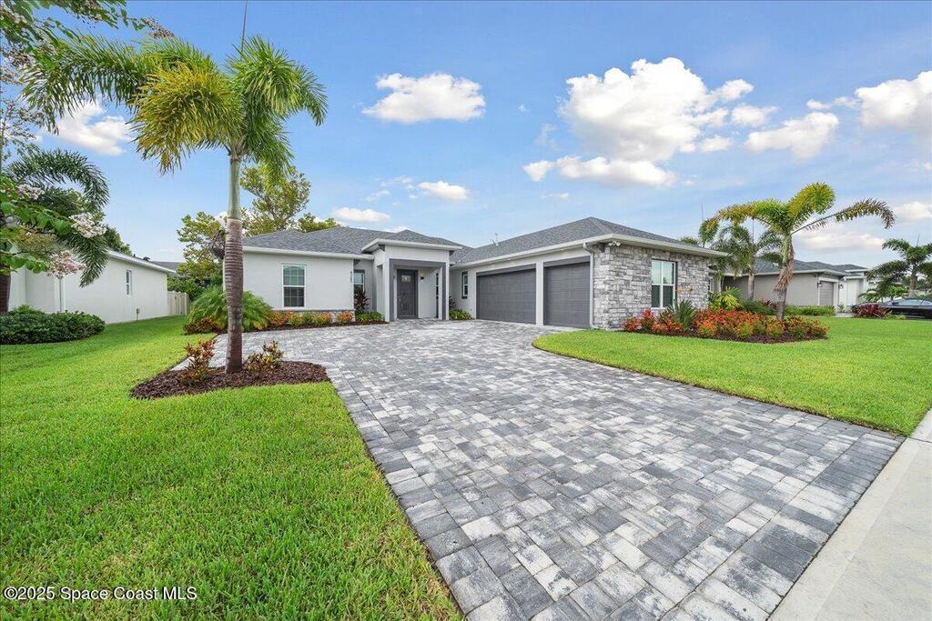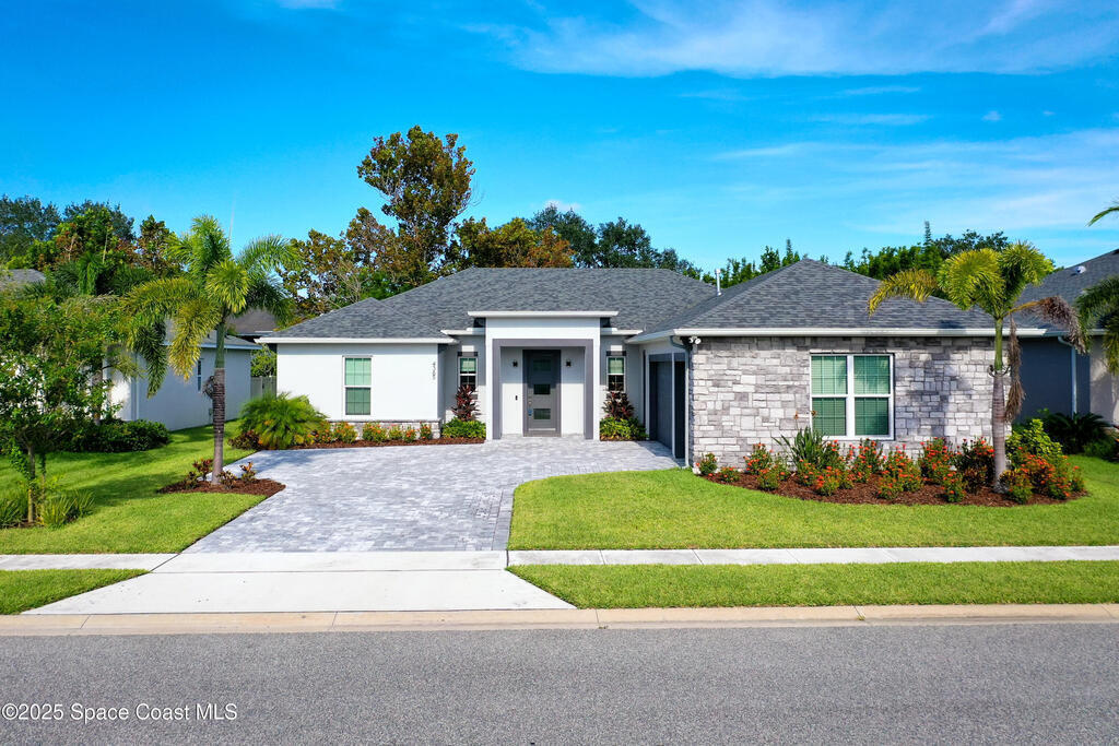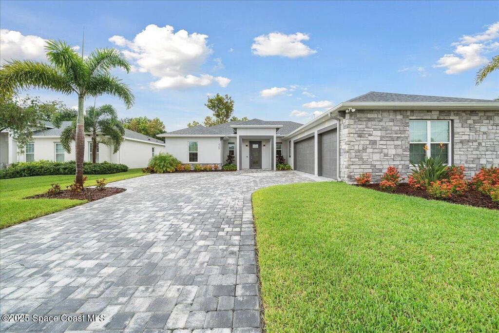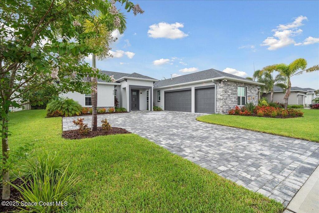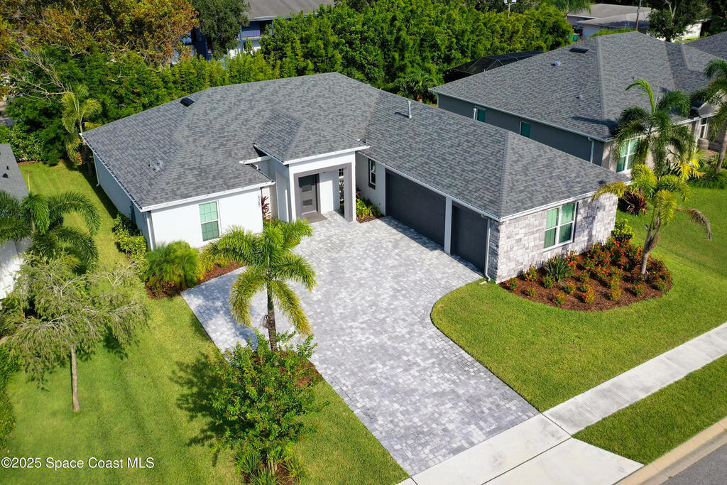 Modern, refined, and packed with upgrades! Located in the prestigious gated community of Laguna Village, this 2023 showstopper of a home is better than new. You'll be greeted by lush, designer landscaping and a beautiful paver driveway as you make your way into the 3 car garage with upgraded shark coating floors. As you step inside, you'll notice this chic home features 10' ceilings, elegant tile flooring, 8' doors, and upgraded window treatments throughout. The chef's kitchen impresses with quartz countertops, upgraded cabinetry, stainless steel appliances, and a natural gas range. Each bedroom includes its own private bath, while the primary suite offers a stunning 11' tray ceiling with crown molding and dual walk-in closets. Expansive sliding glass doors open to a covered patio and yard, pre-plumbed for a summer kitchen--ideal for entertaining. Laguna Village is just minutes away from the beaches, Historic Downtown Melbourne, shopping, dining, and major local employers.
