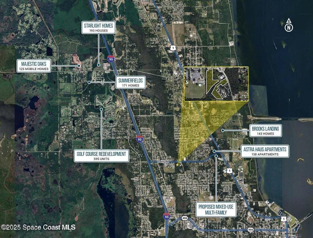 This prime 10.18+/- acre corner parcel at Dairy Road and Singleton Avenue in Titusville offers an exceptional opportunity for commercial or mixed-use development in one of the most rapidly expanding areas of North Brevard. Zoned Community Commercial, the site permits a wide variety of uses including retail, medical, office, QSR, daycare, schools, assisted living, self-storage, and mixed-use residential/commercial development. The property is fully surveyed, with approximately 3.5 acres of field-verified wetlands and 5-6 acres of usable uplands, offering strong flexibility for layout and design. Water/ sewer/ electric are available along both road frontages, and a shared driveway is already in place with the adjacent retail store. Located within walking distance of Oak Park Elementary, Madison Middle School, Astronaut High School, and Eastern Florida State College, the site is ideally situated to serve both residential & student populations. Adjacent to a busy Winn-Dixie shopping plaza.