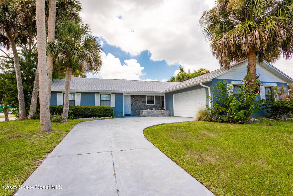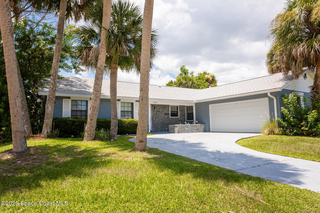 Completed UPDATED 4 bedroom house with 1740 sq ft in the perfect location. Updates include.... brand new kitchen from top to bottom with a huge breakfast bar opening to the living & dining rooms, granite counter tops, stainless steel appliances, new luxury waterproof vinyl flooring & NO CARPET. Both bathrooms updated with walk in shower in the master & double sinks in both bathrooms. NEW ROOF in 2023, water heater only 4 years old & a new hurricane rated garage door. Convenient roll down hurricane shutters, huge private back porch and 3/4 of yard is fenced in & has a fire pit for lots of fun. Light and bright with vault ceilings, wood burning fireplace and freshly painted inside. Double sliders from living room to the porch and sliders from the master to the porch and guest bath has access to the porch as well. One of the best neighborhoods that's super close to Florida Tech and 10-15 minutes from the beach. Corner lot so plenty of space for parking and a super chill HOA.