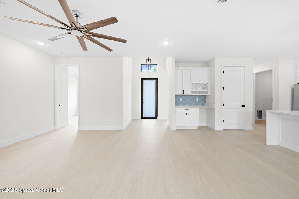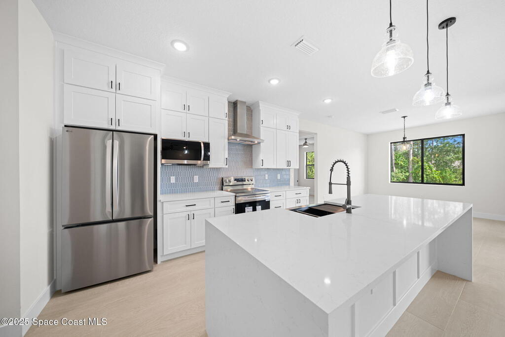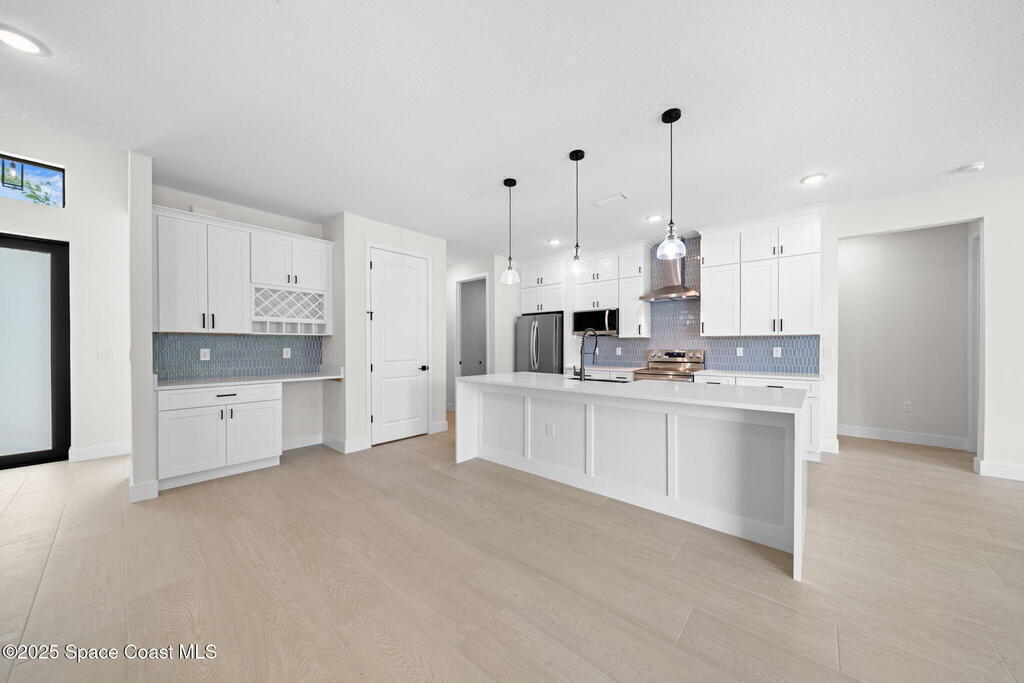 Save Big! Builder will pay closing costs when using the preferred lender. Luxurious new construction offering 4 BED | 3 BATH + OFFICE. IMPACT windows & doors, wood-look porcelain tile, soaring 9'4'' ceilings, and 8' interior doors. Modern open-concept floor plan featuring a kitchen you will fall in love with, complete with a large waterfall quartz island, tile backsplash, & ceiling-height soft-close cabinetry. Thoughtful details include a pull-out spice rack, hidden trash bin, elegant pendant lighting, exterior-vented hood, premium LG appliances with refrigerator included. The kitchen is complemented by a dedicated bar area with a built-in wine rack on one side & dining area on the other, creating an ideal setup for everyday living & entertaining. The 4th bedroom is an in-law suite with it's private entrance. The primary suite offers a spa-like retreat with soaking tub, walk-in shower, dual vanities, and walk-in closet. Enjoy a covered patio pre-plumbed for a summer kitchen.