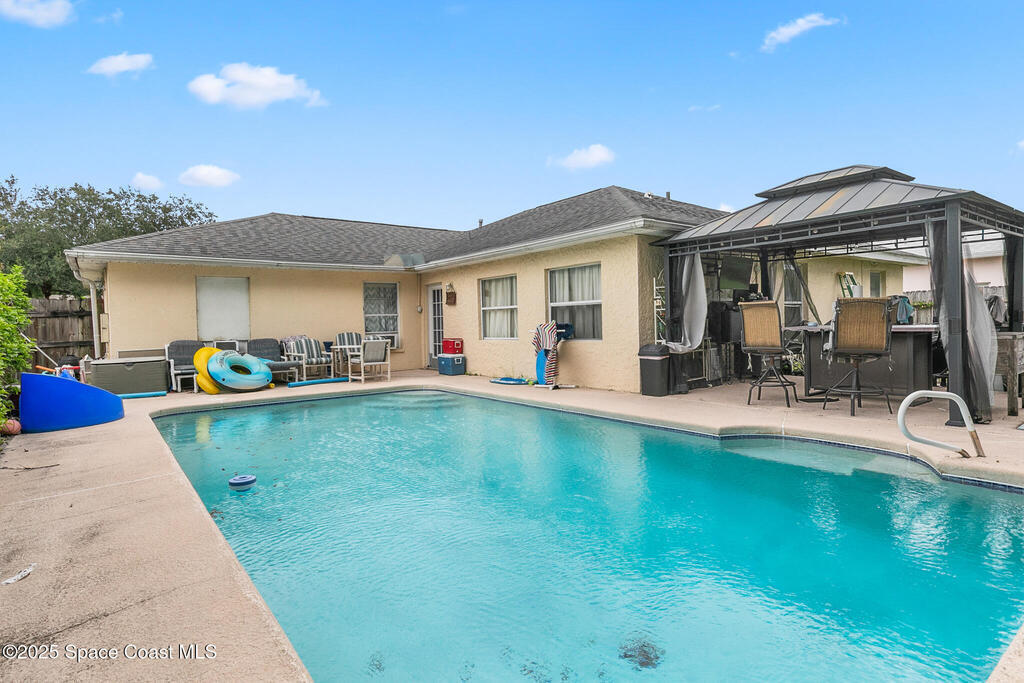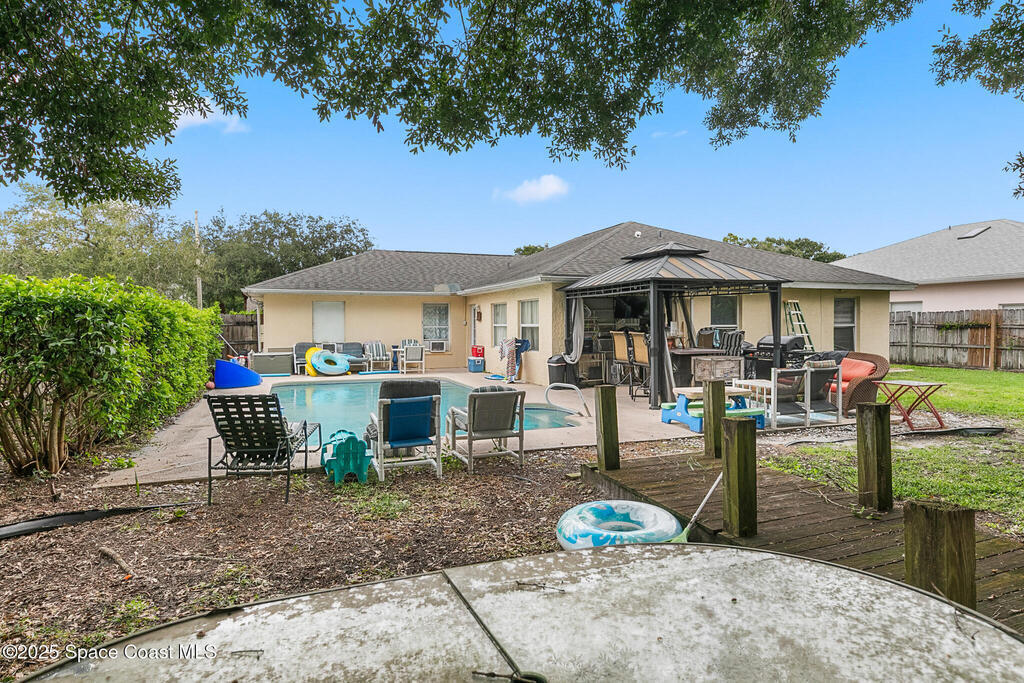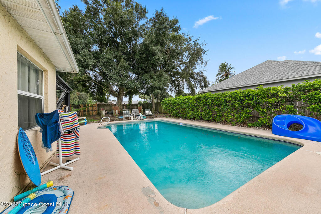 Spacious 4-bedroom pool home on a wooded lot with vaulted ceilings and an open layout. Features a privacy-fenced yard, sparkling resurfaced pool, wood deck shaded by a large oak, and updated kitchen appliances. Wood and tile floors in main areas, carpeted bedrooms, bonus room, and indoor utility room. Conveniently located near I-95, shopping and the airport. New roof 2018. Easy to show.