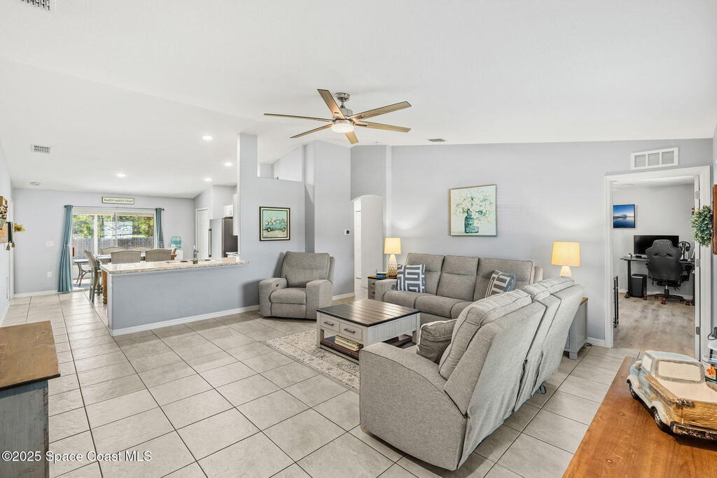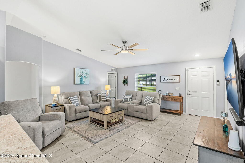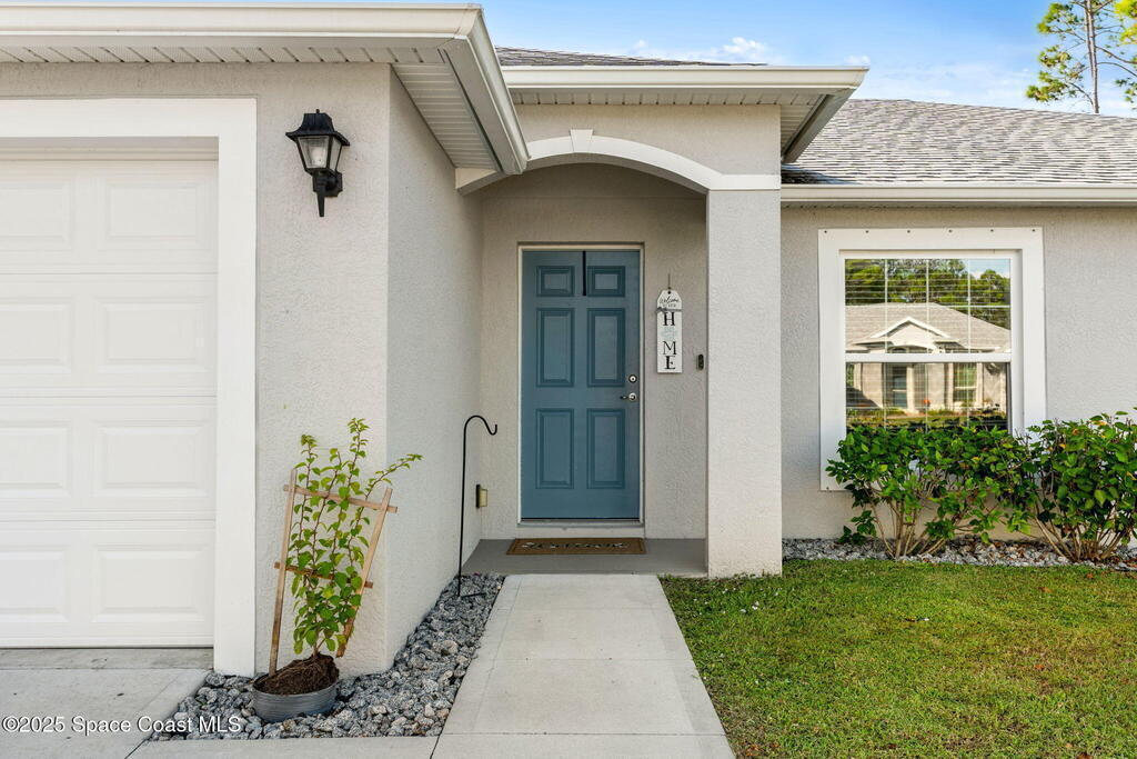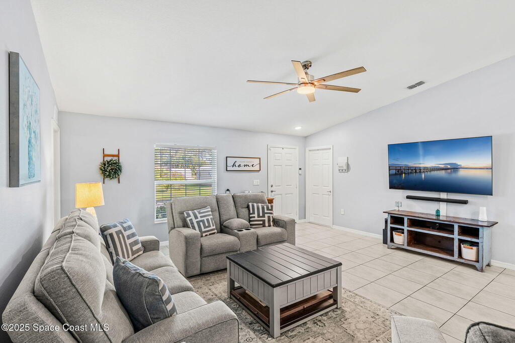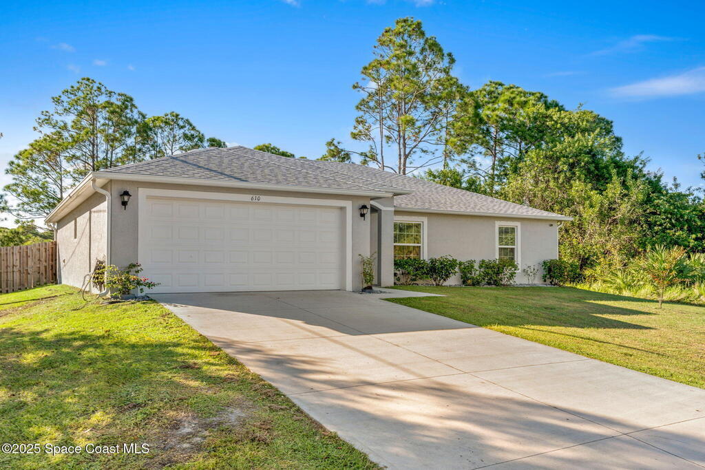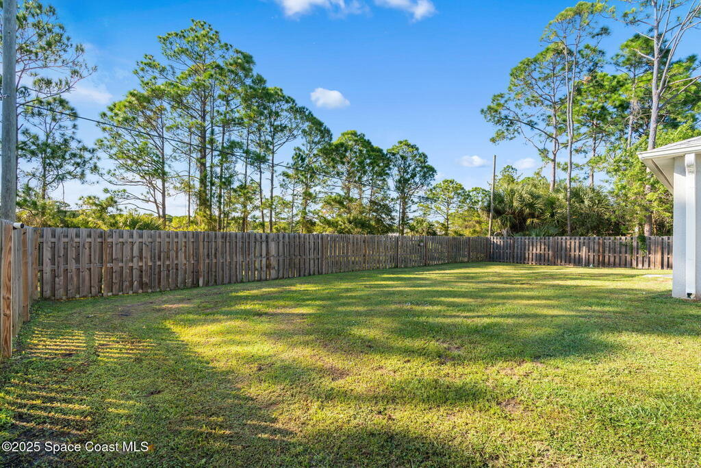 Welcome to Palm Bay! Tucked away on a quiet road and complete with a large fenced-in yard, this beautifully maintained home is ready for its new owner. Boasting over 1700 square feet, a high vaulted ceiling, and an open floorplan, there is ample space to make this house a home. In the primary suite, you'll find an oversized bedroom, a walk-in closet, and a bathroom which features both a shower & tub. The layout was designed with lifestyle in mind - a split plan that provides separation between the main living space and the secondary bedrooms. In addition to the 3 bedrooms, there is a dedicated office that could be used as a 4th bedroom or a den. Stepping outside to the covered porch, you'll enjoy the privacy of the 6-foot fence, neighbored on both sides by unbuilt wooded lots with an open field behind it. Gain the benefits of a new build (Built in 2021, concrete block construction) without high out-of-pocket expenses like a new fence or water softener system. Book your showing today!