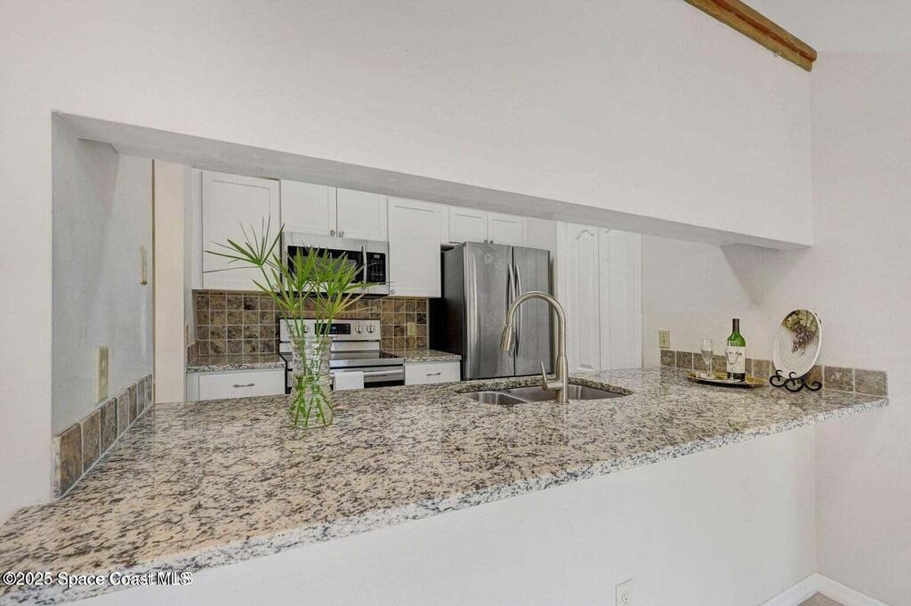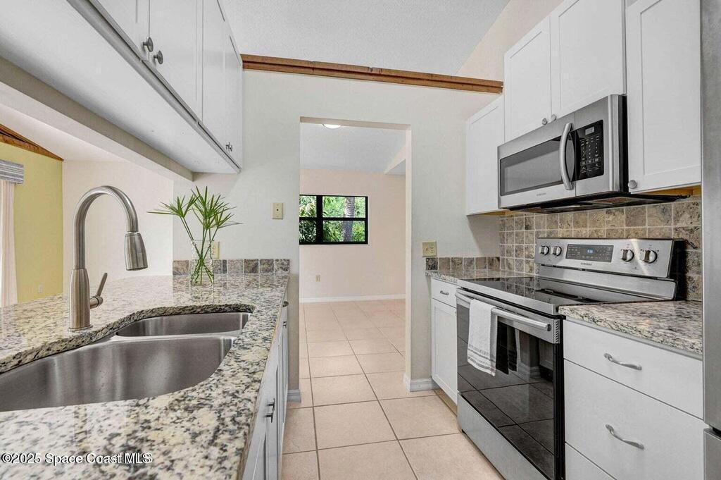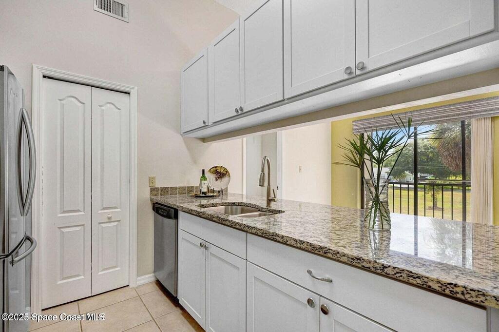 Welcome to this open and airy second floor end unit which is one of the most spacious and inviting floor plans in the entire complex. Originally designed as a three bedroom, two bath, this thoughtfully reimagined two bedroom, two bath layout offers an expansive living area, being ideal for entertaining or simply enjoying the extra breathing room. Step inside to find an interior that has been tastefully updated with east facing plantation shutters, cool and easy-to-maintain tile flooring throughout and a modern kitchen featuring sleek S/S appliances, gleaming granite counter tops and elegant white cabinetry. Both bathrooms carry the same clean and classic fixtures and cabinetry, creating a cohesive and refined look throughout the home. The stackable W/D are tucked away for easy access. This end unit offers natural light flooding in from multiple angles, offering a sense of openness and tranquility. Community pool/spa. 1 car carport and additional assigned parking. See addit. remarks.