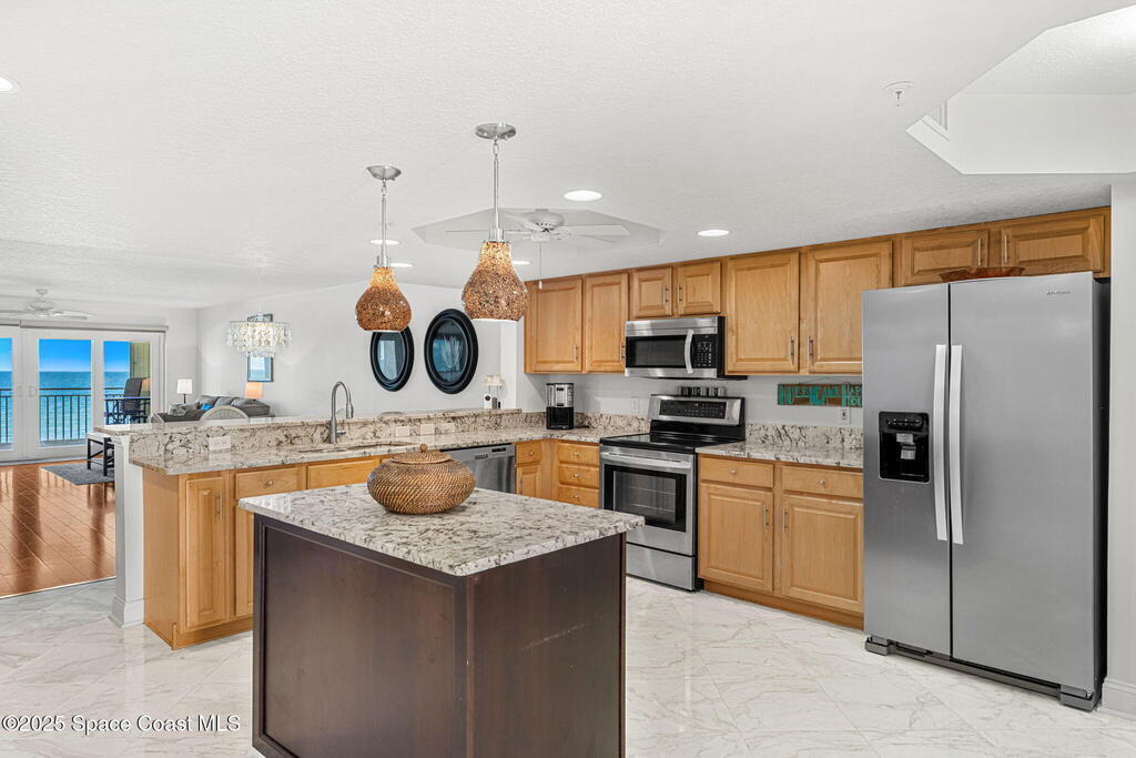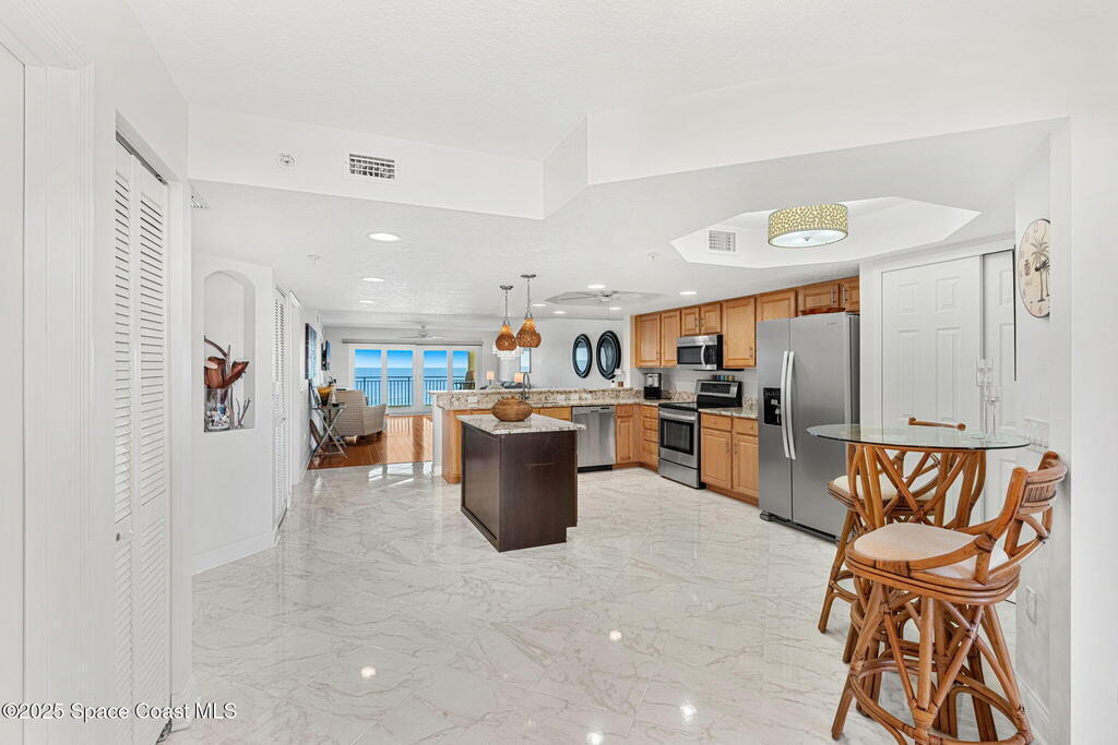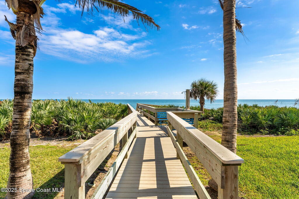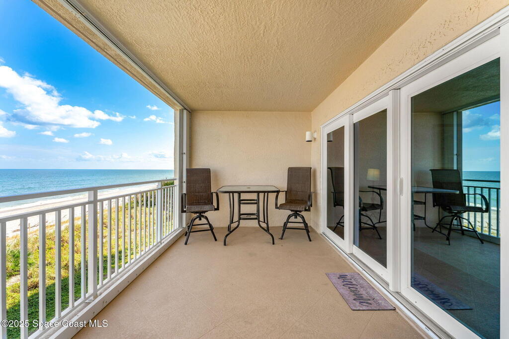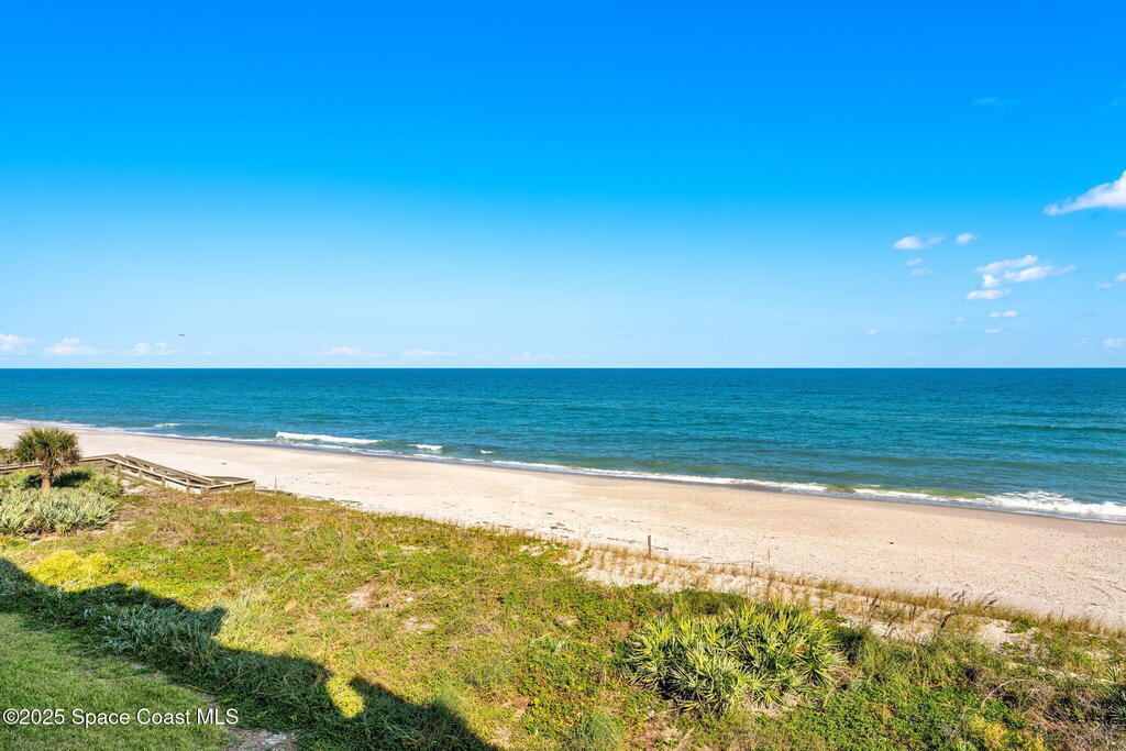 Step into sweeping Atlantic Ocean views the moment you enter this direct oceanfront condo on Florida's Space Coast. This three-bed, two-bath residence offers secured elevator access, a private one-car garage, and additional guest parking. An oversized balcony with storm shutters and impact-rated turtle glass sliders frames the shoreline. The remodeled kitchen showcases elegant granite, a breakfast bar, wine bar, and stainless appliances. French doors open to a flexible third bedroom or office. The primary suite includes a large walk-in shower, soaking tub, and double sinks, while the guest room features an en suite bath with dual access. Wood and marble-look tile floors run throughout. Amenities include private beach access, a heated pool, fitness center, and clubhouse. Two pets up to 35 lbs and 6-month rentals allowed. Recent building updates and all past assessments paid in full. Walkable to dining and all that Indian Harbour offers--true beachside living.
