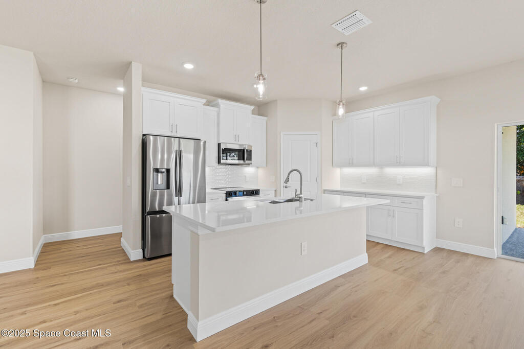 Ask us about our incentives, builder paid closing costs, & no down payment options when financing through the builder's preferred lender. This stunning new construction home exemplifies exceptional craftsmanship with soaring ceilings, a spacious open-concept great room, and a chef-inspired kitchen featuring all-wood shaker cabinets with crown molding, dovetail soft-close drawers and doors, quartz countertops, and a premium Samsung stainless-steel appliance package. Natural light fills the home through large windows and sliders leading to the covered lanai, complemented by luxury vinyl flooring throughout, tile in wet areas (no carpet!), and bathrooms with quartz-top vanities and fully tiled showers--no inserts. If you're searching for superior quality, thoughtful design, and unbeatable value, this is the home for you!