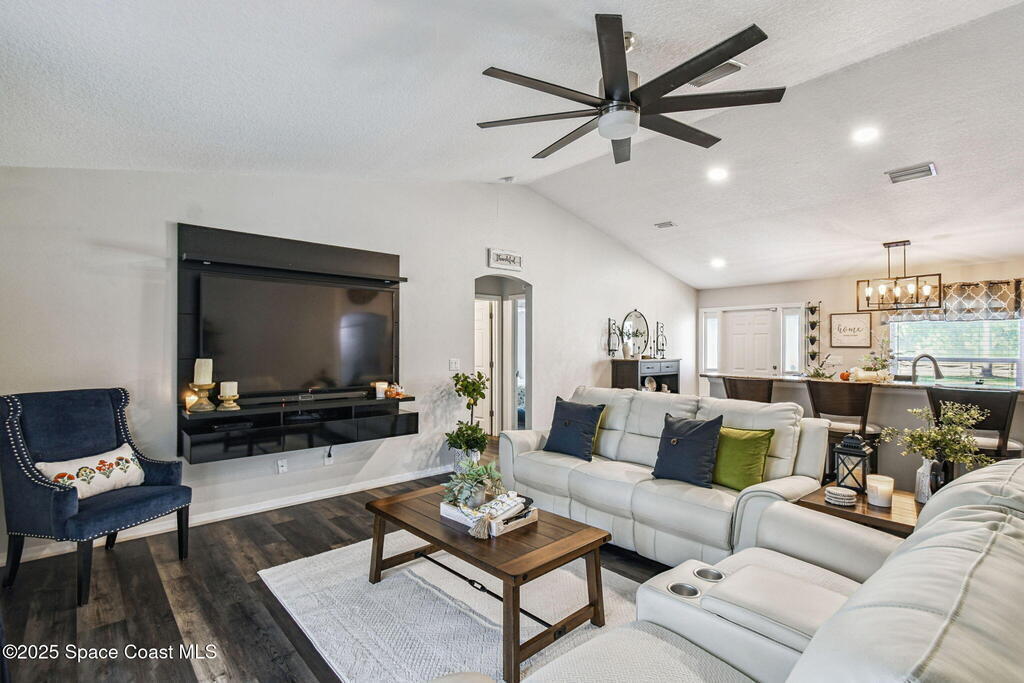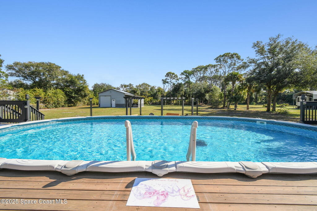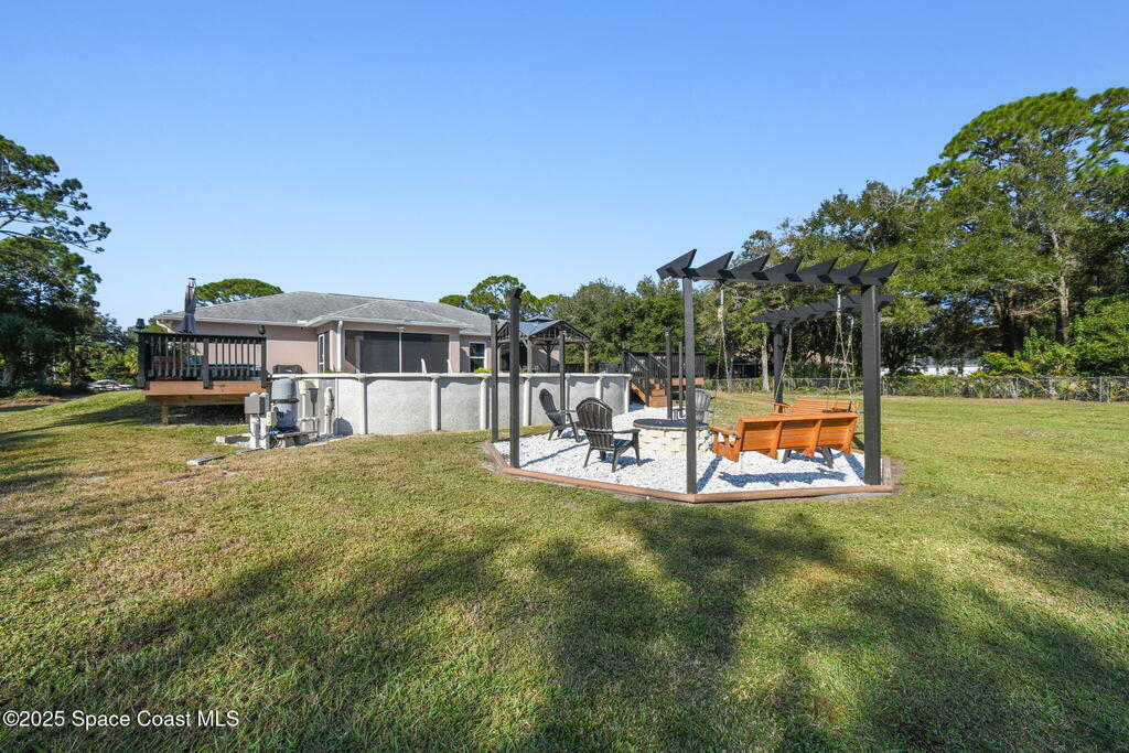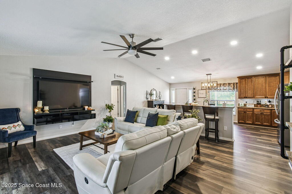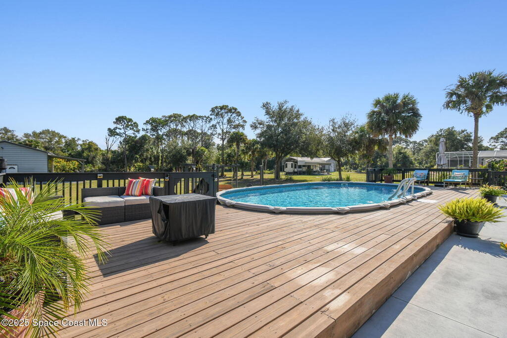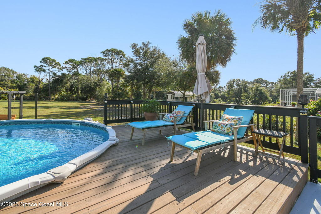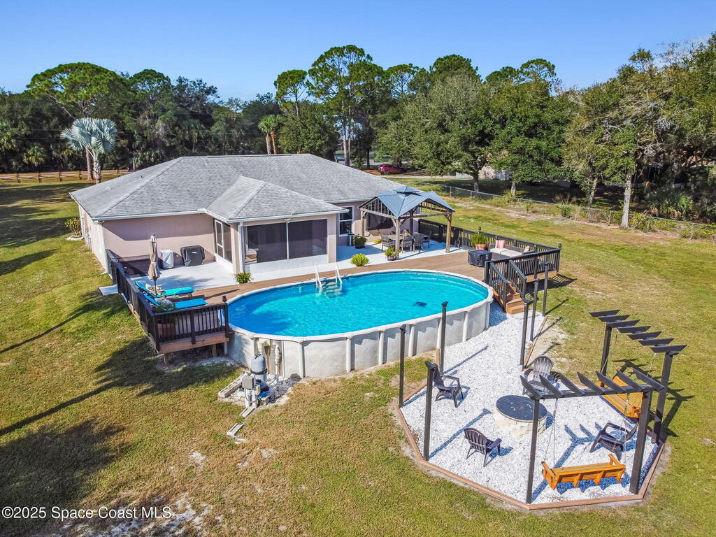 Welcome home to this warm and inviting split floor plan oasis on 1.68 acres--perfect for entertaining and everyday comfort. Bring your RVs, boats, SXS and more! Enjoy an open-concept layout with a cozy living room and upgraded kitchen (2022). The split design offers two guest bedrooms and a full bath on one side and a spacious primary suite with his-and-hers sinks and walk-in closet. Step through the screened patio to a tropical 18x33 saltwater pool (2023) with a large deck, solar-powered gazebo with TV cabinet, and a magazine-worthy firepit. The 24x36 workshop with 12' lean-to (2019) provides space for hobbies, storage, or potential MIL suite. Home features double insulation, RV hookups, pineapple trees, a new solar gate, and full alarm/camera system. Major updates: Roof 2019, Workshop 2019, Driveway 2019, AC 2020 (+UV 2022), Water heater 2021, Pool/slab/deck 2023, Appliances 2022. Enjoy privacy while being close to beaches, Orlando, shopping, dining, and major highways.