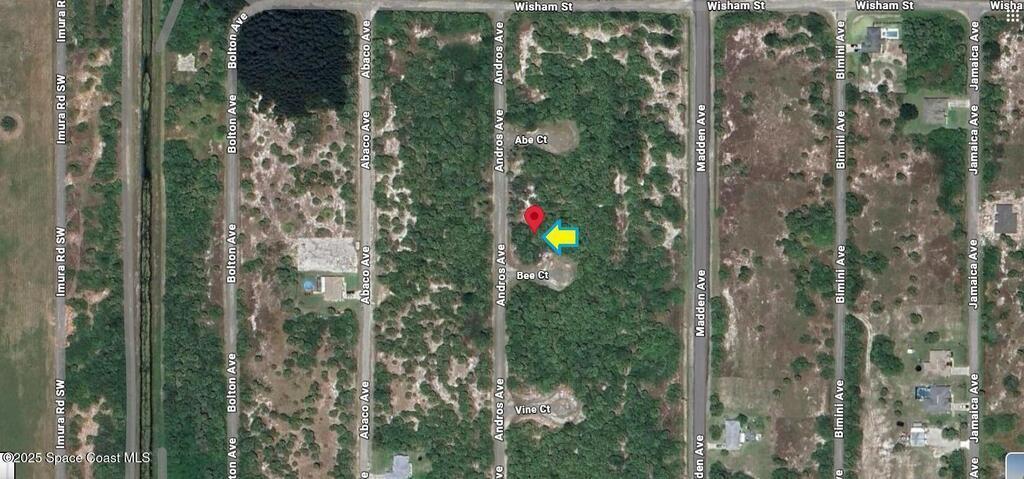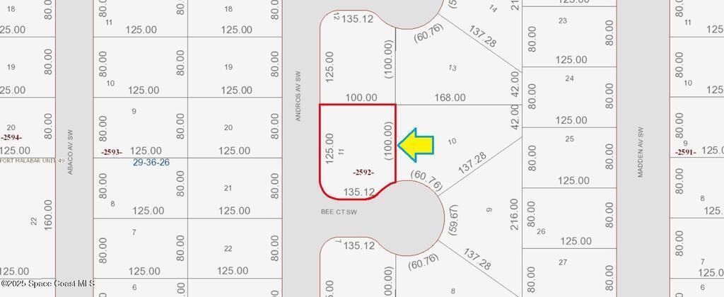 This oversized 0.27 acre residential lot is available in Port Malabar Unit 49 of Palm Bay. Located in the southwest section, it is just 1,7 miles - 5 minutes to Westside Elementary School, 3.5 miles - 9 minutes to the Publix Supermarket, 14.7 miles - 35 minutes to Melbourne Airport, and 20.7 miles - 41 minutes to the beaches of Indialantic. From exit #176 of I-95, go west on Palm Bay Road for .7 miles, left on Minton Road for 3.4 miles, right on Jupiter Boulevard, quick left on DeGroodt Road for 2.5 miles, right on JA Bombardier Boulevard for .9 miles, left on Madden Avenue for .9 miles, right on Wisham Street for .1 mile, and left on Andros Avenue. The lot will be on your left on the northeast corner with Bee Court.