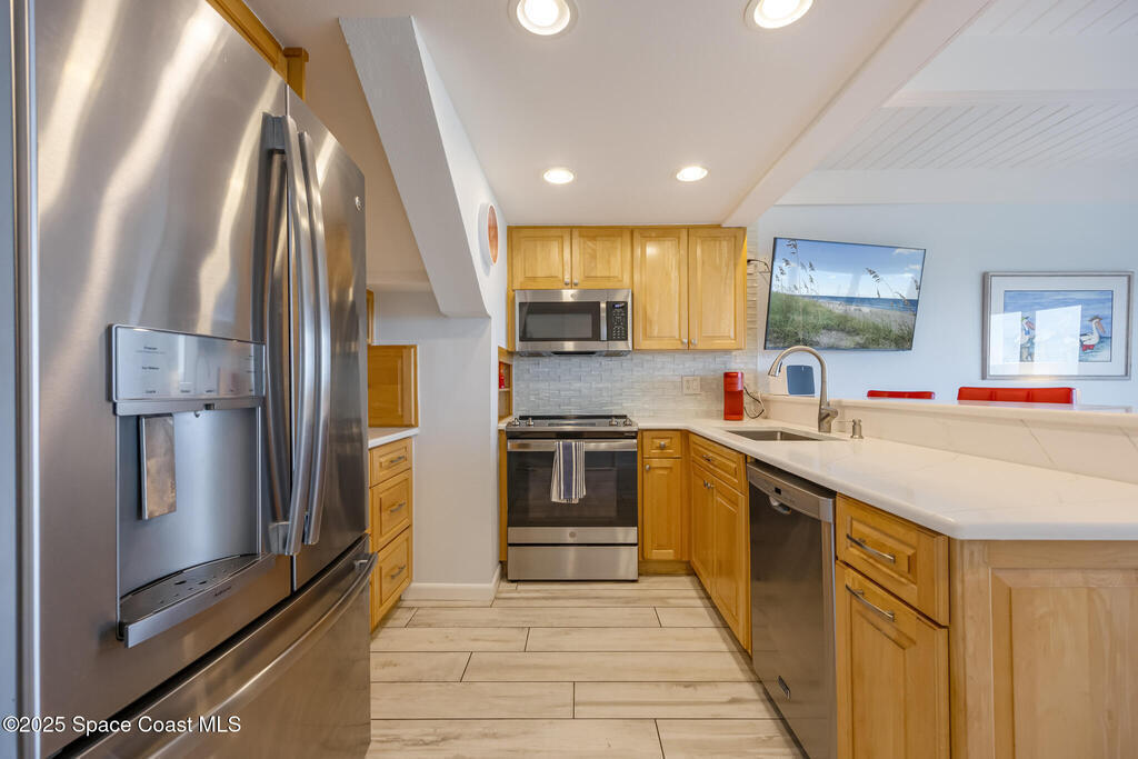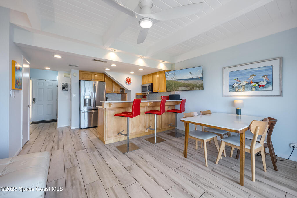 Discover coastal living in this beautifully renovated direct oceanfront, townhouse-style condominium. Thoughtfully updated, this residence offers a seamless blend of modern comfort, designer finishes, and steps to the sand. Ideal as a primary home, seasonal retreat, or lucrative investment with no minimum rental restrictions. A new A/C compressor installed in Oct. 2024 and a replacement air handler from 2017. Bathrooms tastefully remodeled, with the second-floor bath completed in 2024 and primary bath renovated in 2016, complemented by high-end glass shower doors with barn-style rollers added in 2024. The kitchen and baths feature quartz countertops. Interior improvements continue throughout the home with interior freshly painted, stained wood ceiling, in Sept. 2025, and new flooring installed in Oct. 2025. All major appliances have been upgraded: the range and dryer 2023, and the washer 2022.