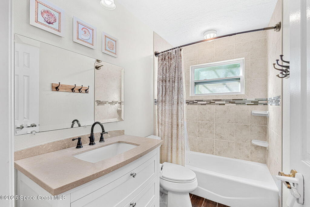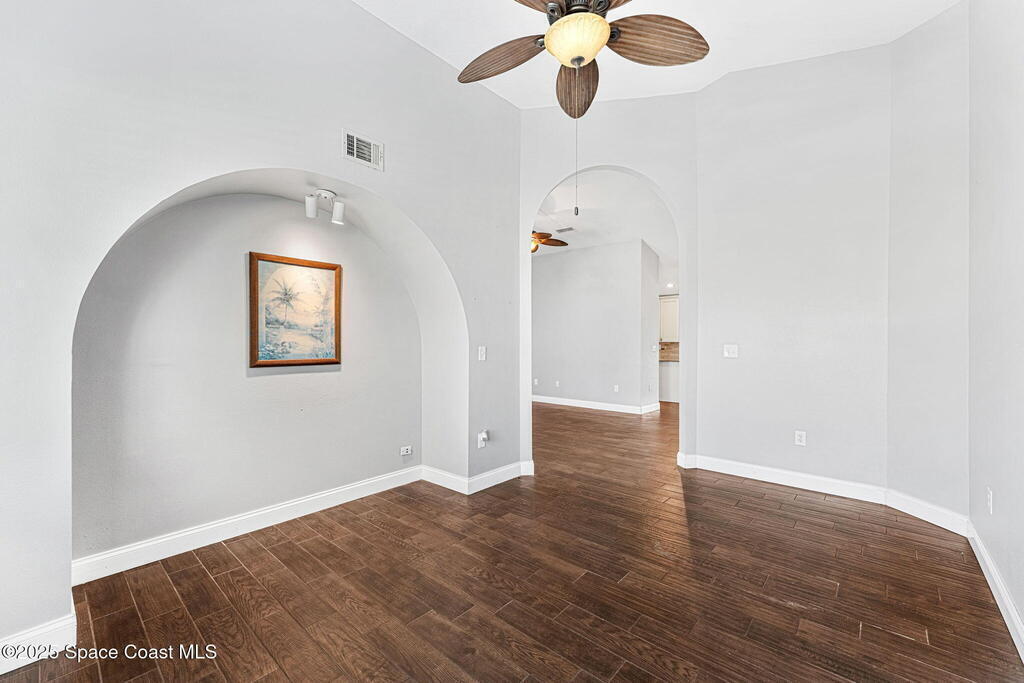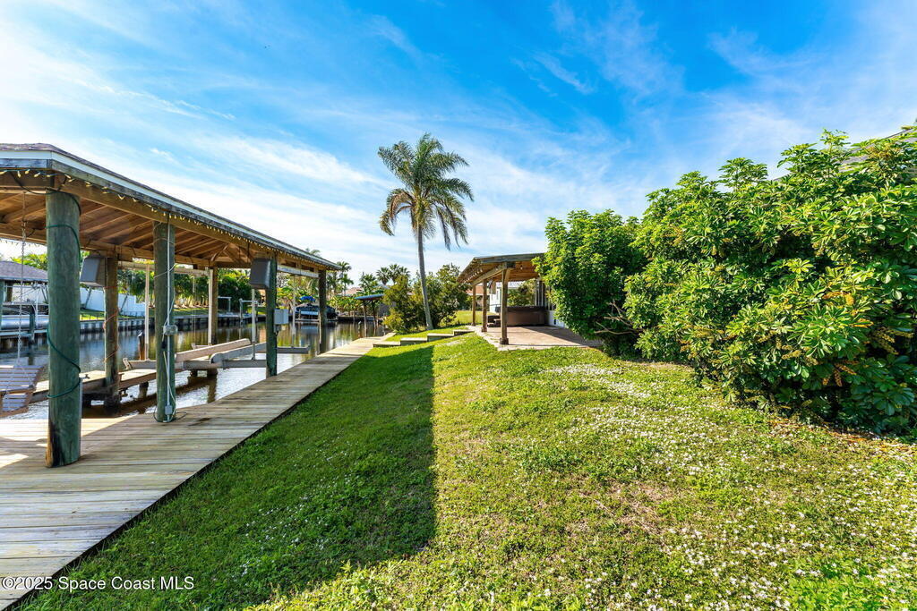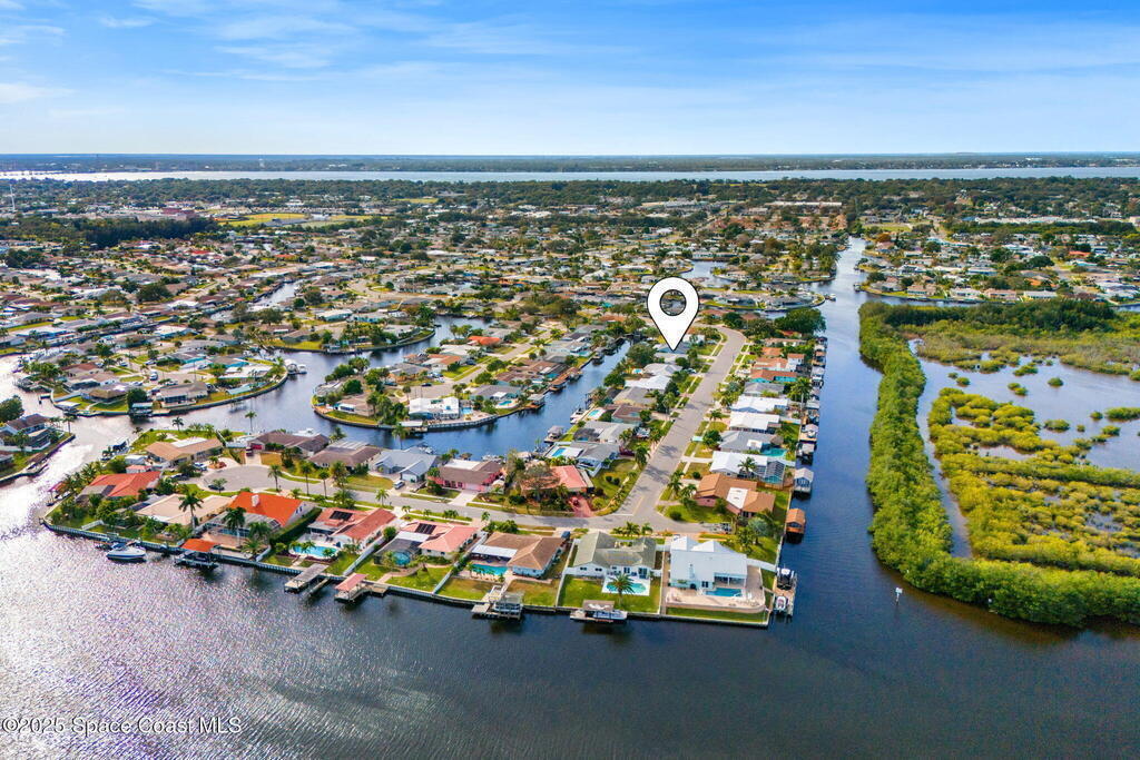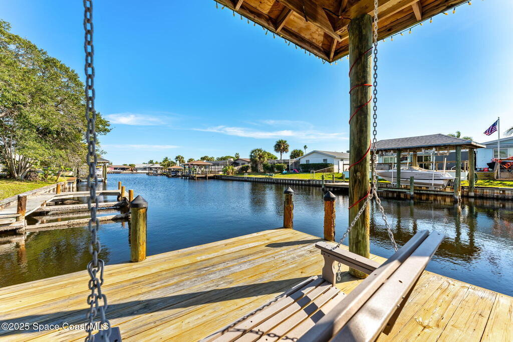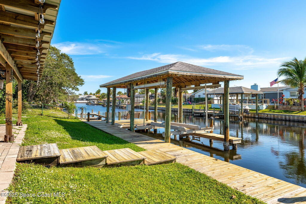 This Diana Shores canal front gem features a 1988 block construction home with high ceilings, no cast iron plumbing, a newer dock with a covered 6,000lbs boat lift, and quick access to Sykes Creek. Inside, modern finishes include wood-look tile throughout the living space, updated designer off-white shaker cabinetry in the kitchen with granite countertops, and stainless appliances. The split floor plan provides a generous primary suite with his and hers walk-in closets, and a sizable ensuite with a dual vanity, water closet, and separate shower and tub. The living space lends itself to multiple uses, with a formal dining area, a den or office off the main living room, a dinette off the kitchen, plus an additional 700 sqft enclosed patio with a mini-split cooling unit. A spacious indoor laundry room offers everyday convenience, and the garage provides ample storage and a newer garage door. Outside, a spacious pavered lanai overlooks your deep water canal. Just 15 minutes from beach!