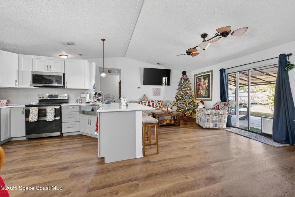 Charming 3-bedroom, 2-bath home with a 2-car garage - READY for new owners! Step inside to an inviting open floor plan featuring vinyl plank flooring throughout the main living areas, a newly RENOVATED kitchen with quartz countertops, and split bedrooms for added privacy. Volume ceilings throughout.. Both bathrooms have been tastefully updated, offering a modern and fresh feel. Major improvements provide peace of mind, including a 2024 Roof, 2025 Water Heater, 2022 AC, and a whole-house filtration system. Outside, enjoy a covered patio, fully FENCED YARD and a 10 x 16 shed with roll-down shutters--perfect for storage, hobbies, or extra workspace. This home blends comfort, style, and functionality in one perfect package. Schedule your showing today!