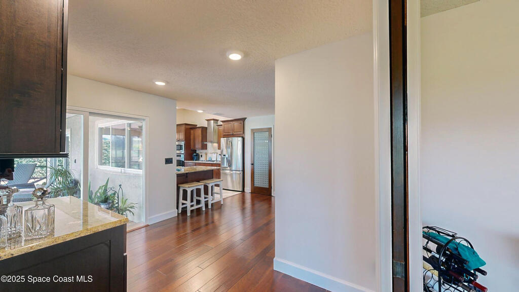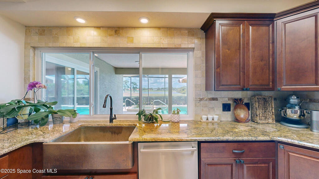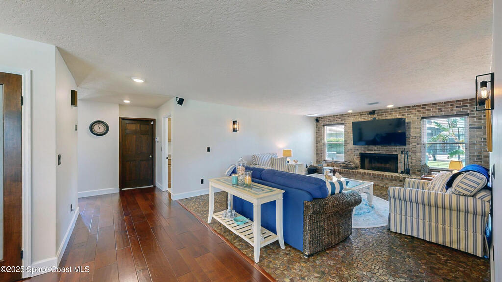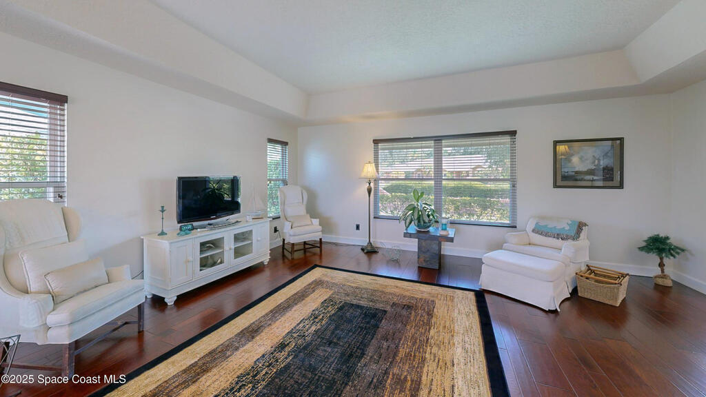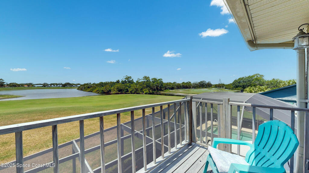 Beautifully situated on the #3 Challenge Course at Suntree Golf Club, this updated pool home offers over 3,000 sq. ft. of living space with exceptional golf course views. The home features a 2023 A/C system, 2021 roof, and 40 solar panels for added energy efficiency(paid off). The kitchen includes cathedral ceilings, granite countertops, stainless steel appliances, a gas range, hammered copper farmhouse sink, and pantry. Additional highlights include skylights,cherry- wood flooring, and a family room with a brick fireplace(wood burning can covert back to gas). The screened, gas-heated salt water pool and spa, along with the covered patio, provide an ideal setting for year-round enjoyment. The upstairs primary suite features a private balcony with sunrise and sunset views! Conveniently located near schools, shopping, dining, and medical facilities.