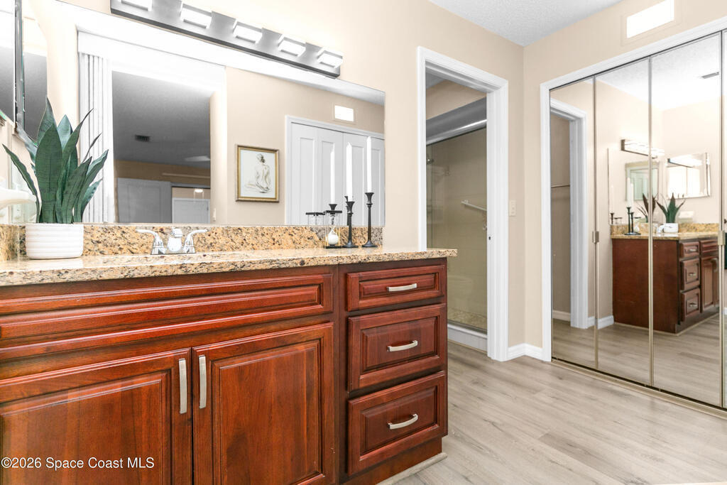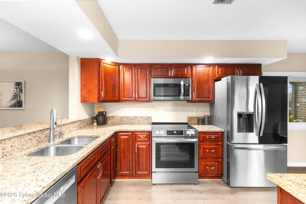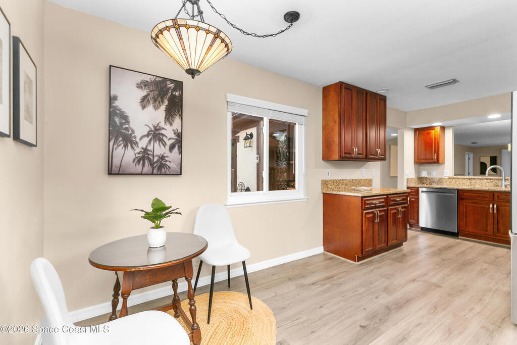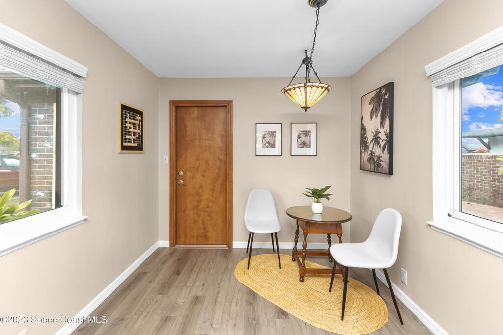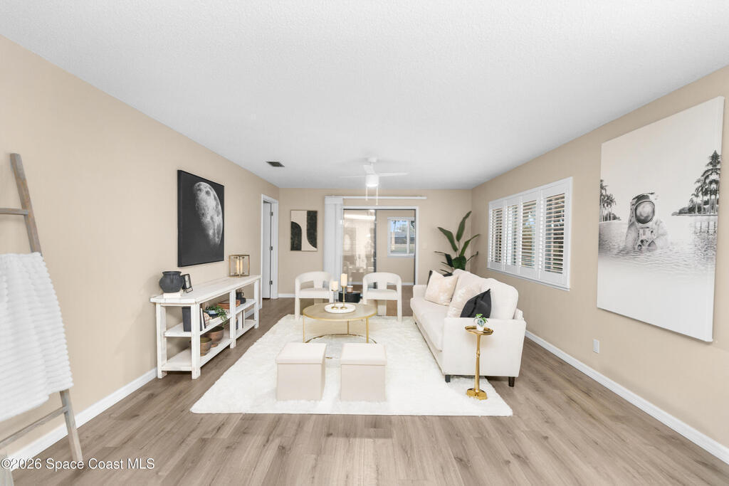 Move-in ready home with major upgrades throughout! This beautifully updated residence features a 2021 roof, new whole-house AC (Aug 2024), new professionally tinted Hurricane impact windows 2025, and luxury vinyl plank flooring with double padding throughout--including bathrooms. The kitchen has been fully refreshed with all new appliances (stove, microwave, refrigerator, dishwasher, garbage disposal, faucet) plus an under-sink reverse osmosis filtration system. Both bathrooms offer modern updates including bidet toilets, new light fixtures, added storage cabinetry, and a guest bath conversion with new shower enclosure. Additional improvements include a new washing machine and updated dryer vent system - 2025. Exterior highlights include professionally landscaped front, side, back, and courtyard areas. Convenient Titusville location near shopping, dining, and major roadways. A must-see!