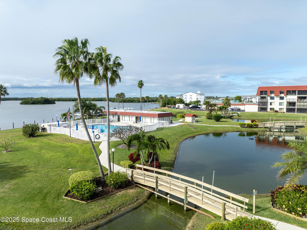 Navigable BANANA RIVER! This complex overlooks the Thousand Island Preserve! Enjoy AMAZING sunsets from your balcony. Beautiful 2 story end unit with 2 bedrooms on the upper level. Granite and stainless steel appliances in this spacious kitchen. Amenities GALORE! Heated riverside pool, clubhouse, boat slips, boat launch and 725 foot boat dock. Storage and private garage. A MUST SEE! A tropical paradise! 3 month min -rental Garage far right in front of unit. New Roof in Jan 2026.
