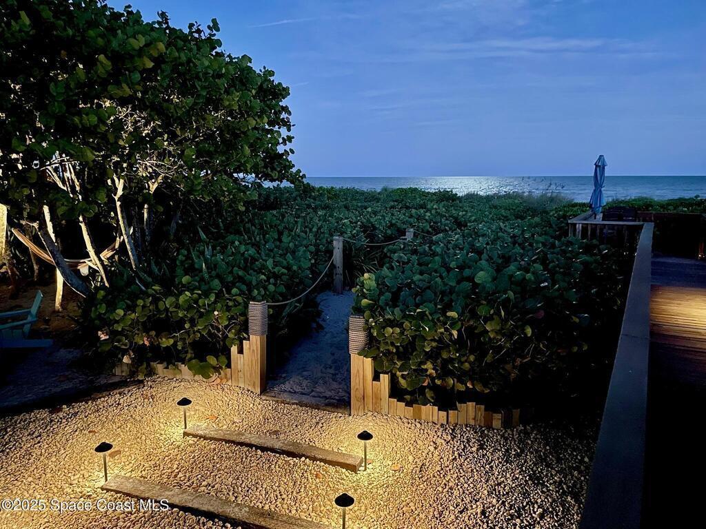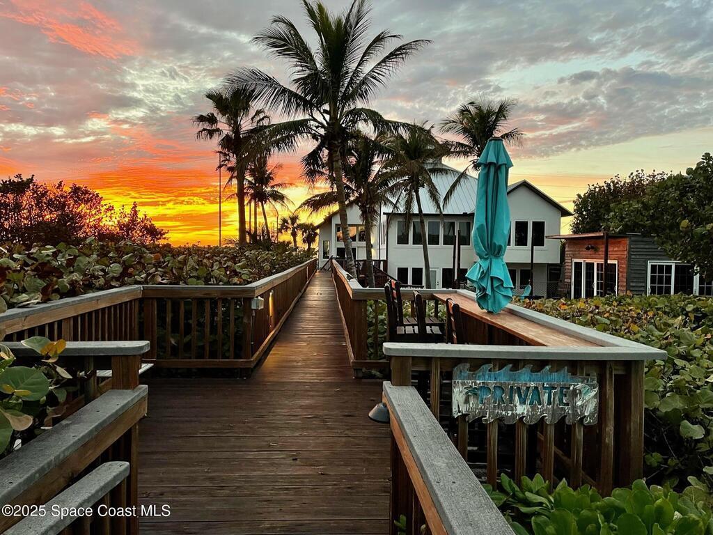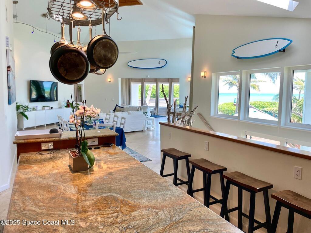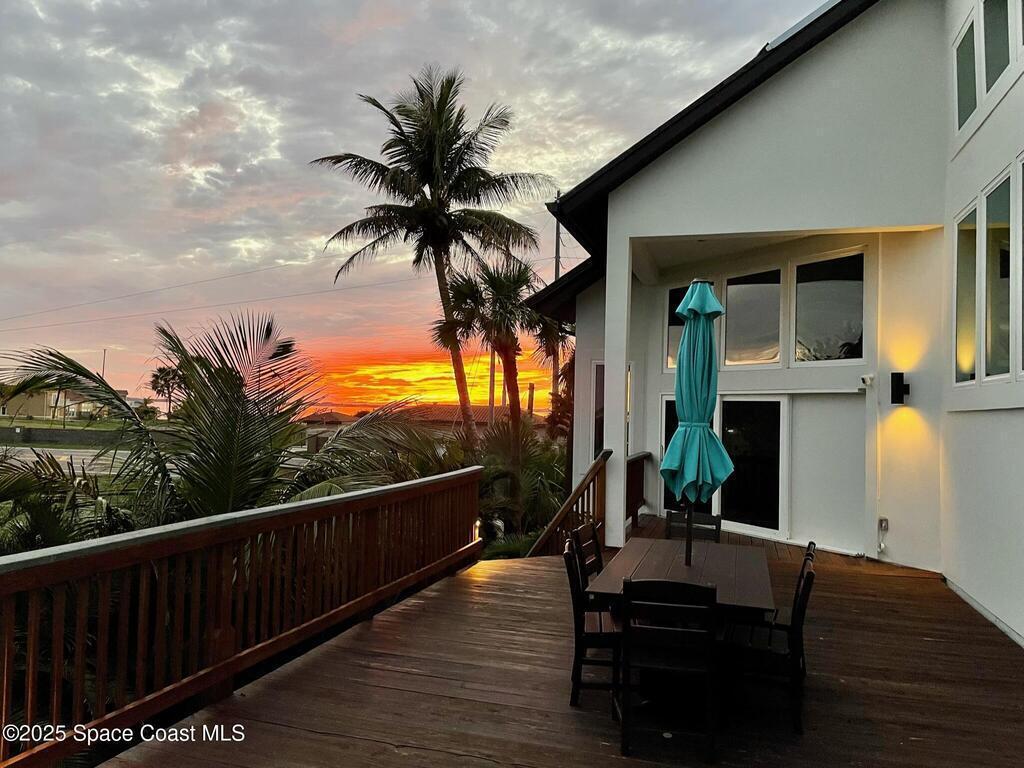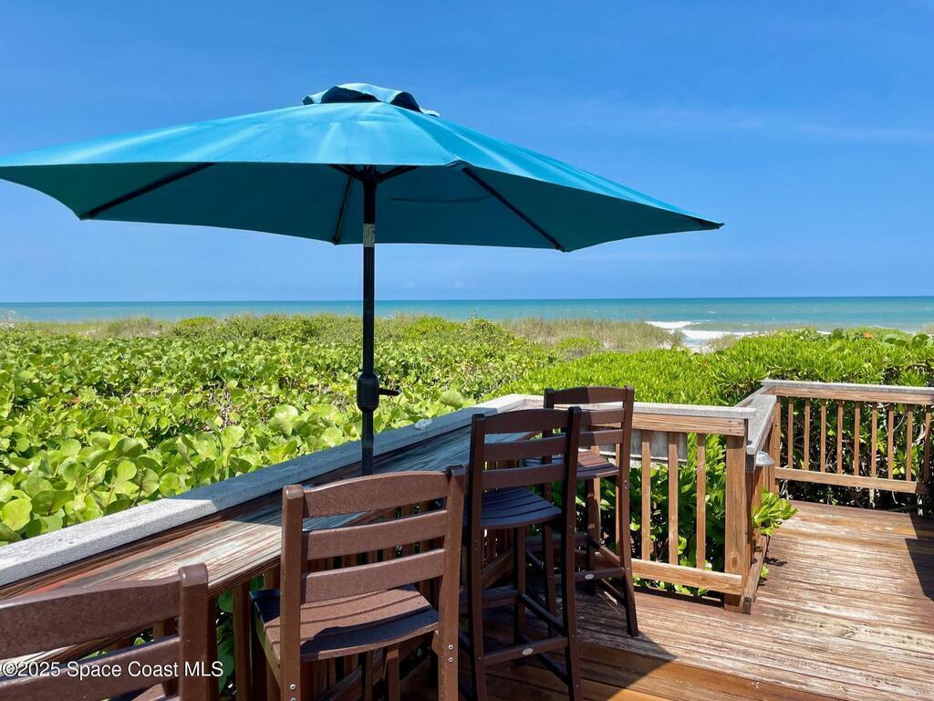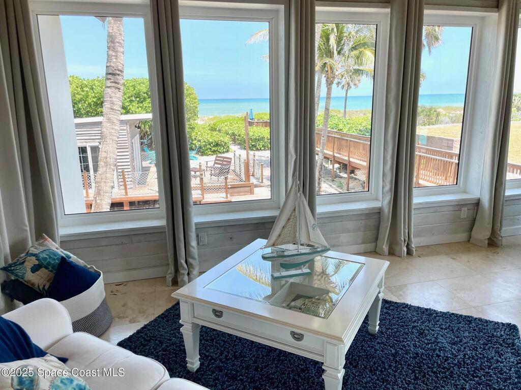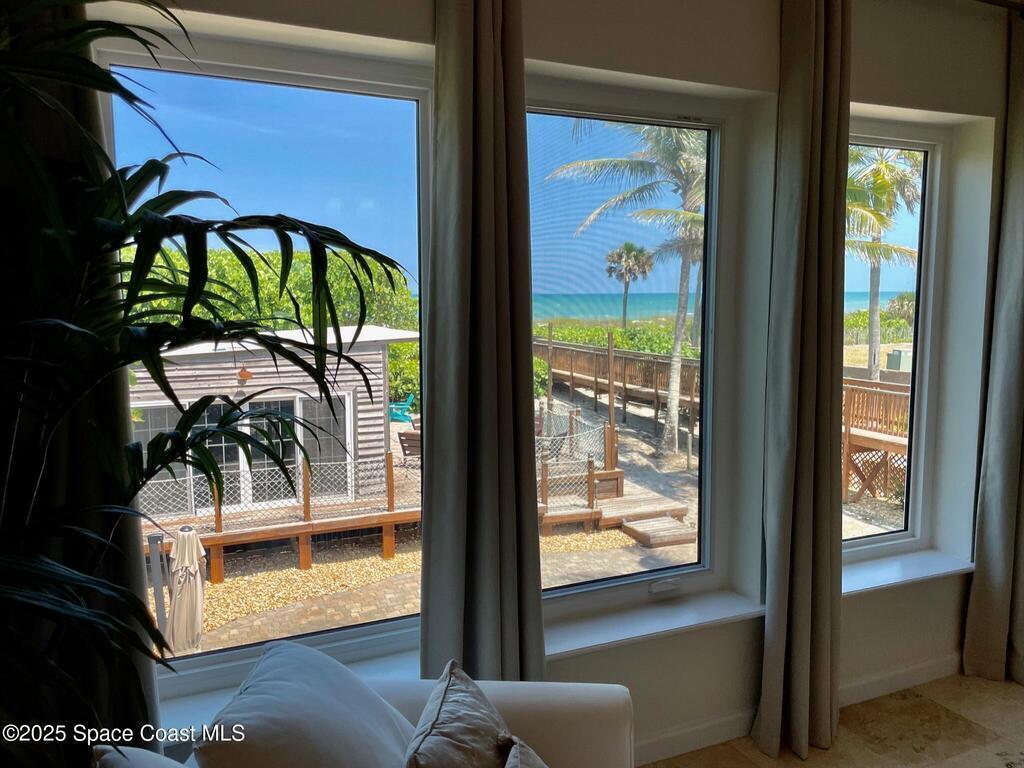 Experience coastal luxury in this exceptional direct oceanfront estate offering approx. 150 ft of private beach frontage. Set on a generous 12,000+/- sq ft lot, this refined retreat features over 4,000 sq ft of living space with 4 bedrooms and 3 baths, designed for both relaxation and entertaining. Three spacious patios with BBQ area create the ideal setting for gatherings, poolside lounging, or enjoying s'mores by the fire pit under the stars. Take in breathtaking sunrises, rocket launch views, and seasonal sea turtle hatchings from your own backyard. The first level includes a private mother-in-law suite with living area and wet bar, perfect for guests. Upstairs, floor-to-ceiling windows showcase sweeping ocean views. The gourmet kitchen is equipped with a Sub-Zero refrigerator, Wolf range with warming drawer, stainless steel appliances, and ample workspace. Additional features include dual split A/C, whole-home water softener, and generator. Live your best life in paradise every day.
