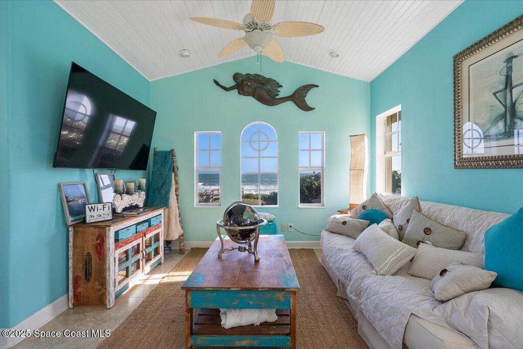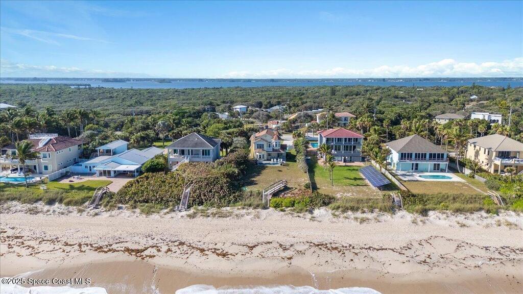As seen on The DIY Network's The Vanilla Ice Project. Welcome to a rare Melbourne Beach opportunity--set on one of the largest oceanfront parcels in the area, this coastal retreat pairs timeless beachside living with modern comfort and tech-forward conveniences. A new roof, 2 new HVAC units in 2023, and a 2018 saltwater pool create peace of mind from day one. Inside, the home feels bright and uplifting with 10' ceilings, airy natural light, and a layout designed to embrace the ocean lifestyle. With 4 bedrooms and 3.5 baths, the floor plan offers flexibility, while multiple exterior doors make it effortless to step outside for sunrise coffee, sunset strolls, or breezy afternoons by the water. The first-floor primary suite provides added versatility, complete with a bonus ''Morning Kitchen'' or workstation area--well suited for a private guest suite or in-law setup. Upstairs, built-ins and a wall of windows frame sweeping panoramic ocean views you won't find anywhere else.