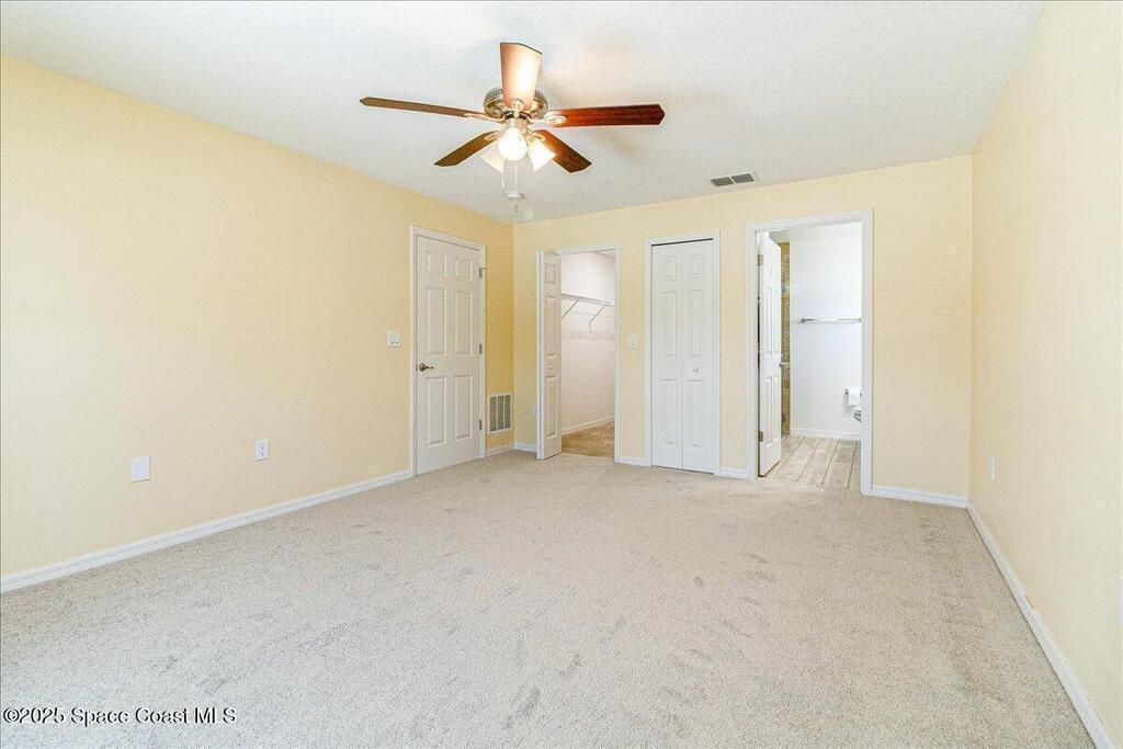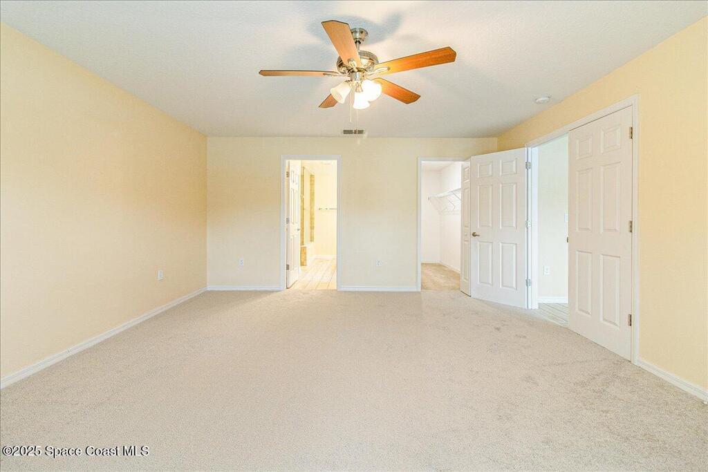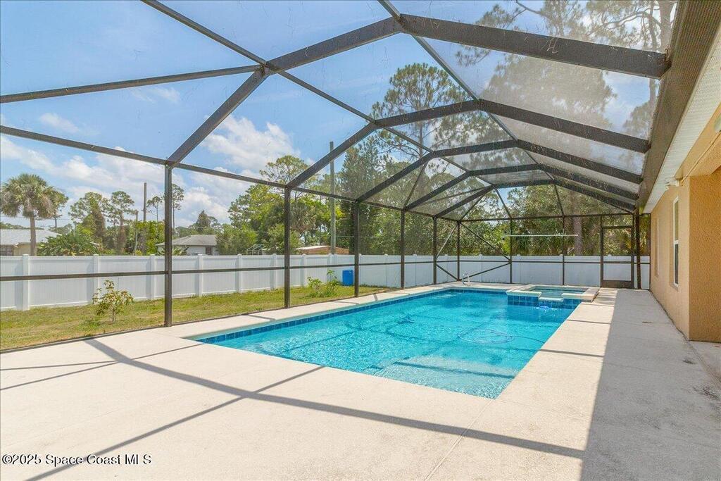 This is a gorgeous, spacious, and fully-upgraded house. Loaded with all the features that you might need. Located in the hottest developing area in Brevard county. It is a 5 bedroom, 3 bathroom, 3 car garage with a 0.5 acre fully-fenced yard and in-ground pool with hot tub on a large screened patio. The 2 Master Suite floor plan is a great opportunity for family living. Wood grain tiles in the living room, kitchen and bathrooms. Bedrooms are carpeted. With ceiling fans in all bedrooms including the living room with vaulted high ceiling. The kitchen has a vented range hood. Granite countertops in kitchen and all baths. Have year round natural lighting with Hurricane Impact windows throughout the whole house. No need to put on and take off shutters during hurricane season. With Tesla solar panel system (which will pay off at closing), deep well water and septic, a whole house water treatment filtration system, and NO HOA you can live off the grid and enjoy your privacy in the suburbs.