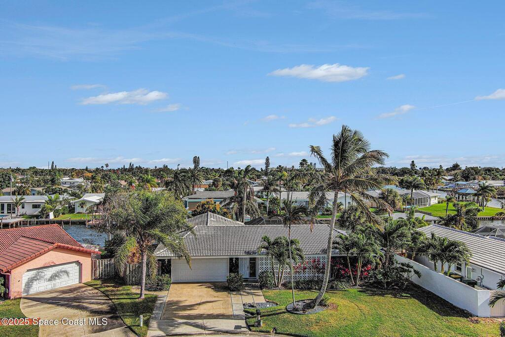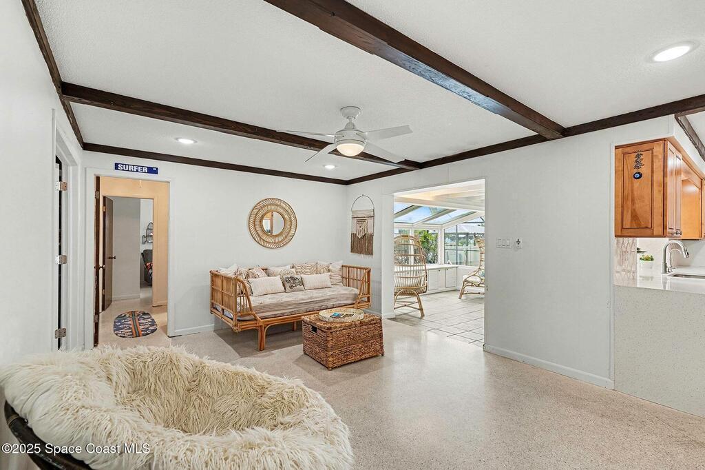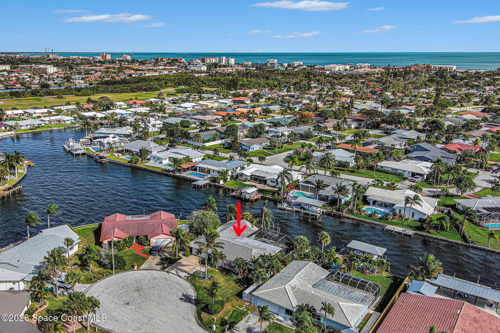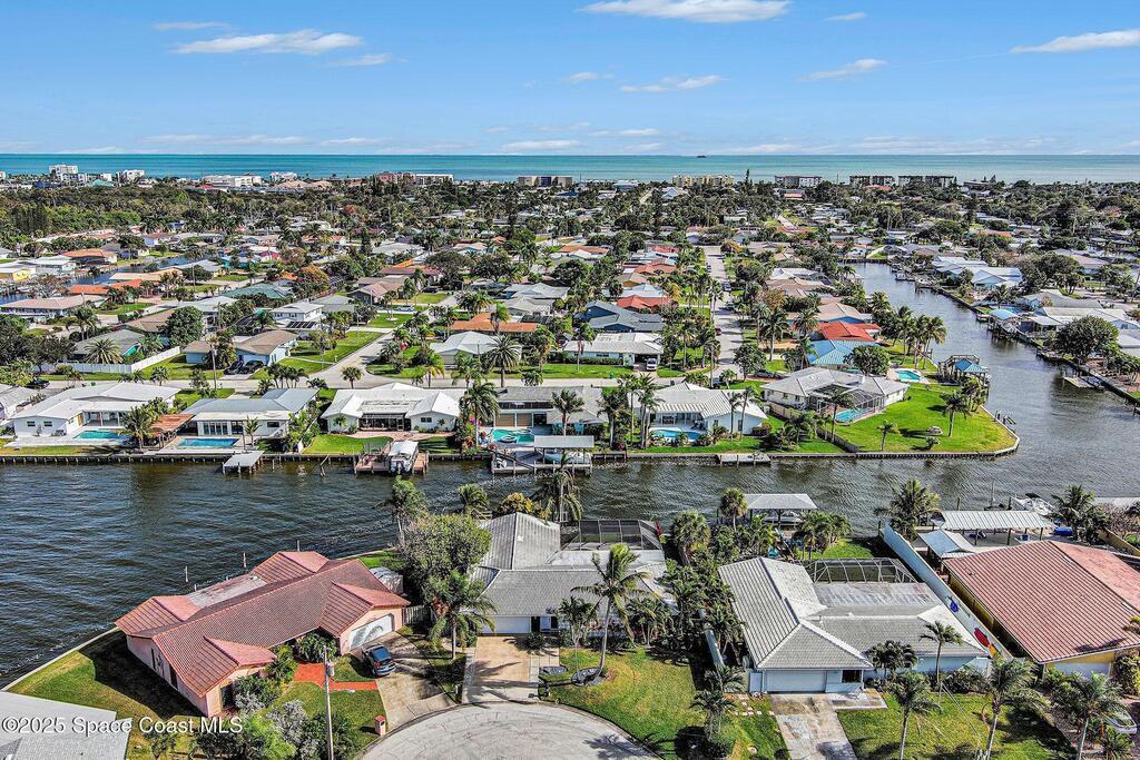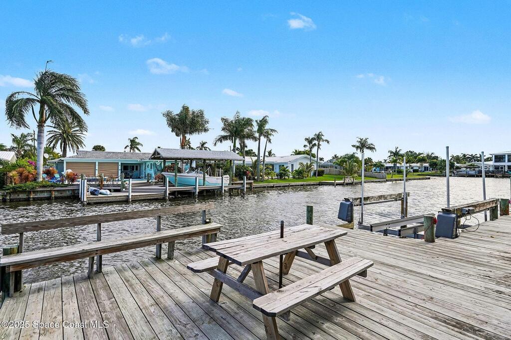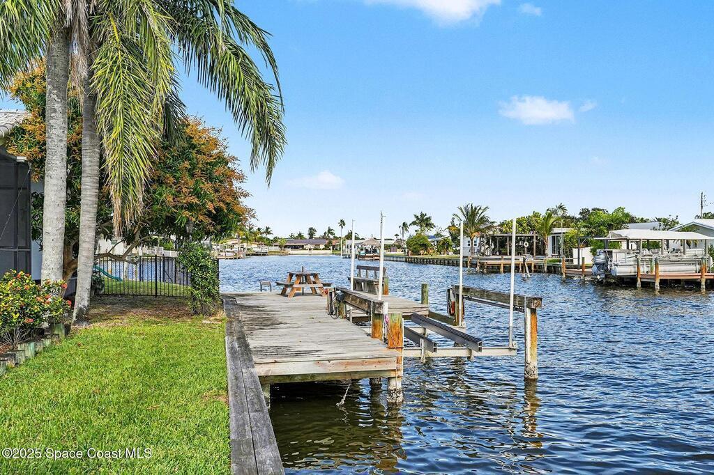 Cocoa Beach waterfront residence seconds from Banana River w/ easy ocean access. Tranquil canal views frame a backyard oasis w/ resurfaced free-form screened pool, gas heater and 2025 pool pump. Dock w/ electric boat lift offering kayaking, paddleboarding, sunset cruising, w/ sightings of manatees and dolphins. The 4BR/2BA split floor plan showcases diamond-polished terrazzo floors, plantation blinds, and Four Seasons hurricane-rated windows and sliders. An upgraded kitchen w/ gas stove and water filtration opens to a sunroom with breakfast bar and nook. Updated bathrooms include a serene primary suite with double sinks, walk-in closet, and screened atrium. Convenient outdoor shower and minutes to beach. Designed for both beauty and livability, the home features a fenced side-yard ideal for children, safely separated from the pool and canal.Striking black volcanic stone accents the exterior and foyer, while a front screened atrium provides privacy, natural light, & cooling breezes.