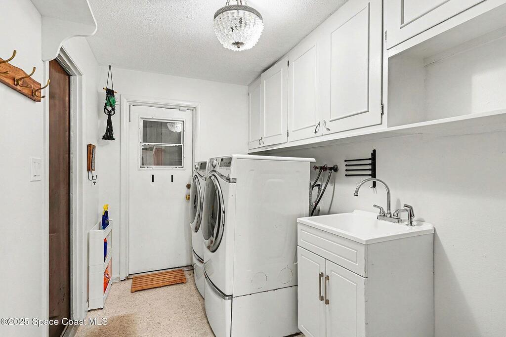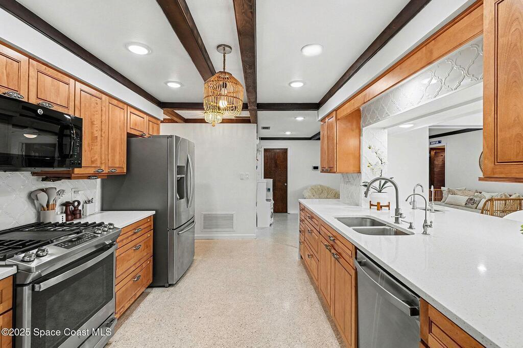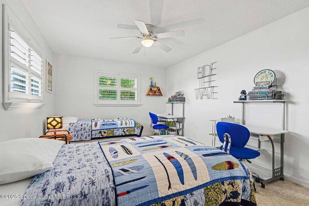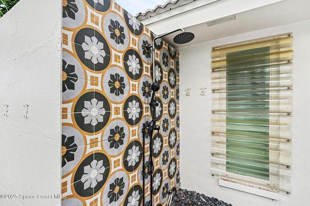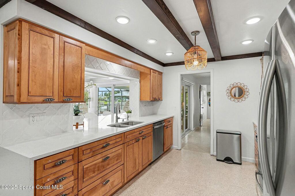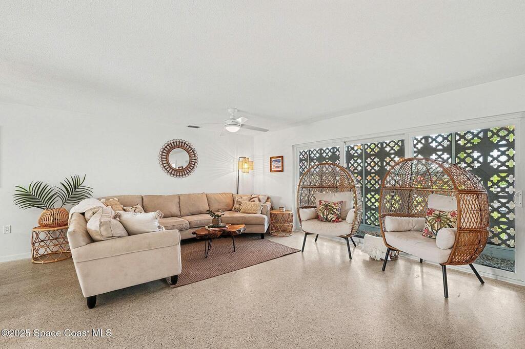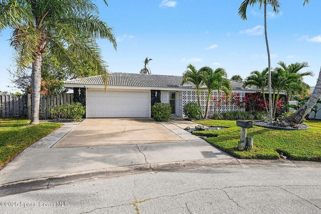Cocoa Beach waterfront residence seconds from Banana River w/ easy ocean access. Tranquil canal views frame a backyard oasis w/ resurfaced free-form screened pool, gas heater and 2025 pool pump. Dock w/ electric boat lift offering kayaking, paddleboarding, sunset cruising, w/ sightings of manatees and dolphins. The 4BR/2BA split floor plan showcases diamond-polished terrazzo floors, plantation blinds, and Four Seasons hurricane-rated windows and sliders. An upgraded kitchen w/ gas stove and water filtration opens to a sunroom with breakfast bar and nook. Updated bathrooms include a serene primary suite with double sinks, walk-in closet, and screened atrium. Convenient outdoor shower and minutes to beach. Designed for both beauty and livability, the home features a fenced side-yard ideal for children, safely separated from the pool and canal.Striking black volcanic stone accents the exterior and foyer, while a front screened atrium provides privacy, natural light, & cooling breezes.