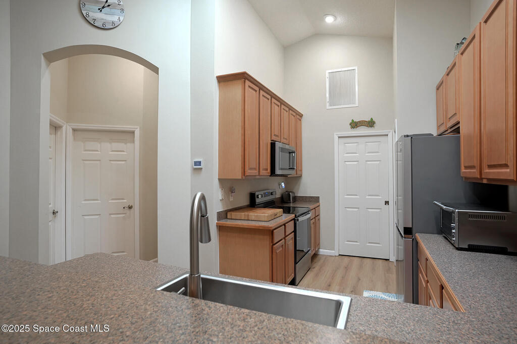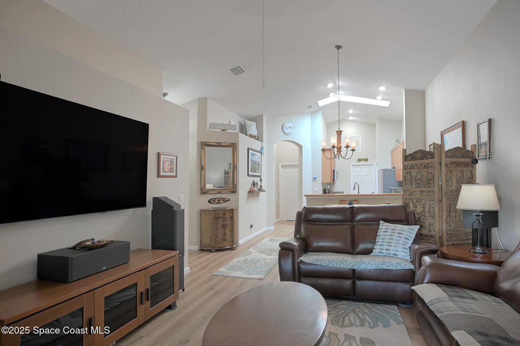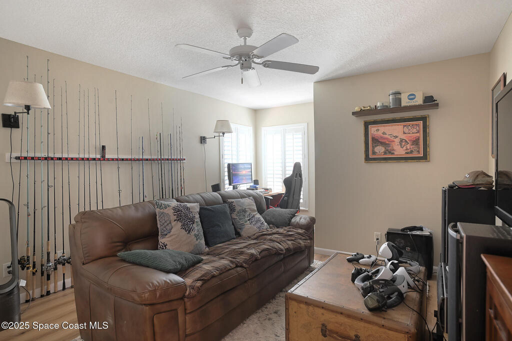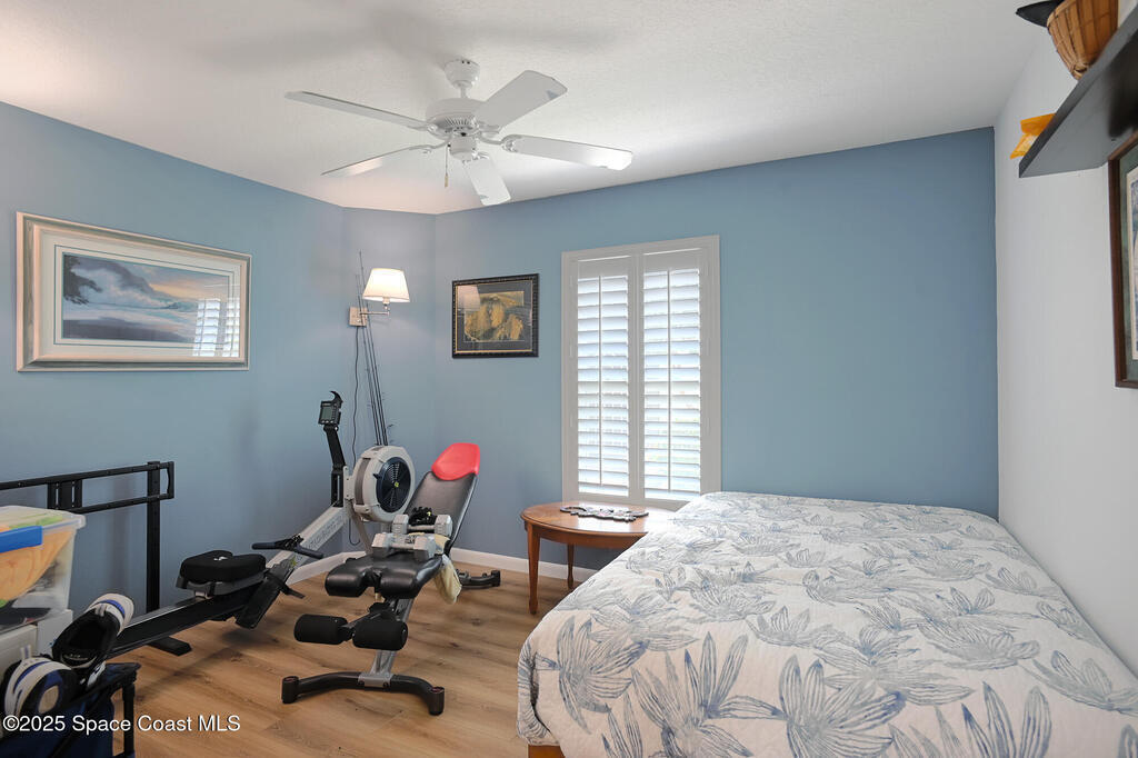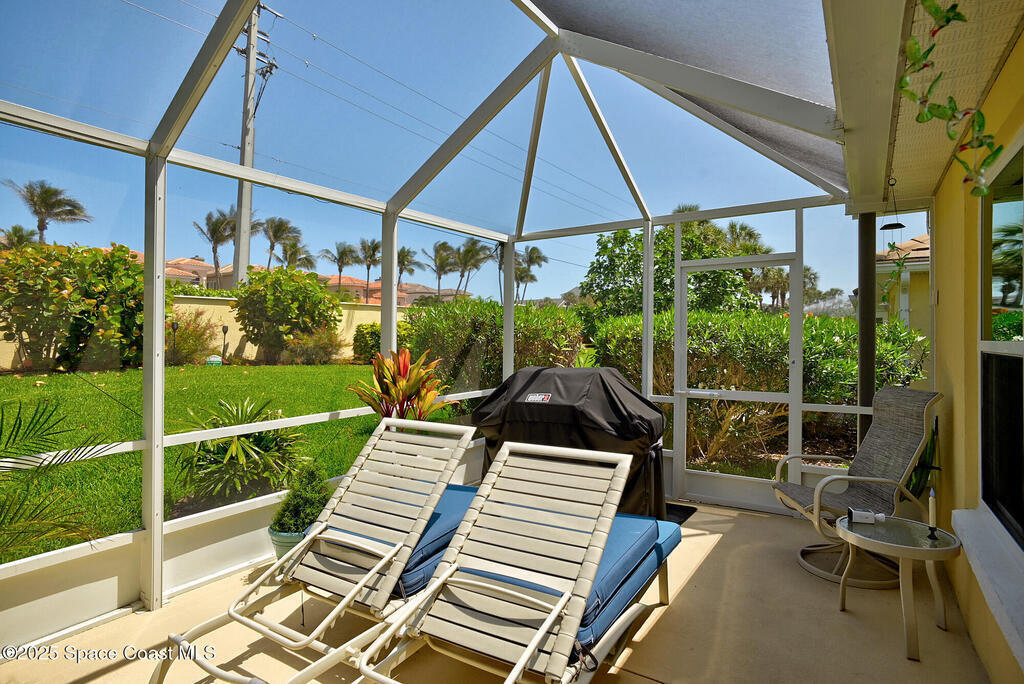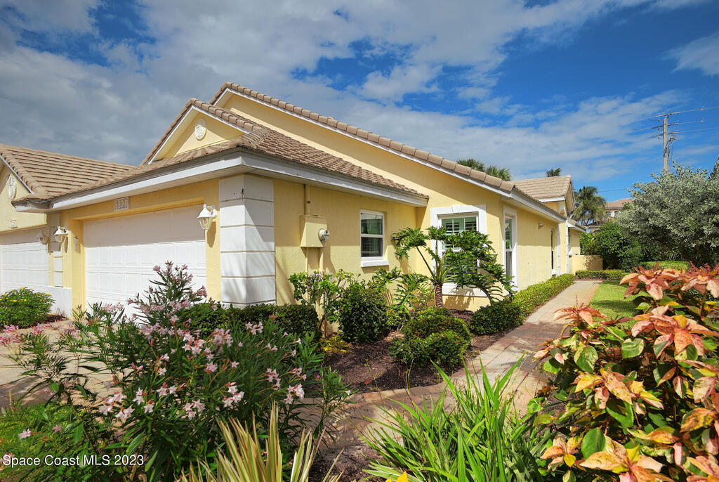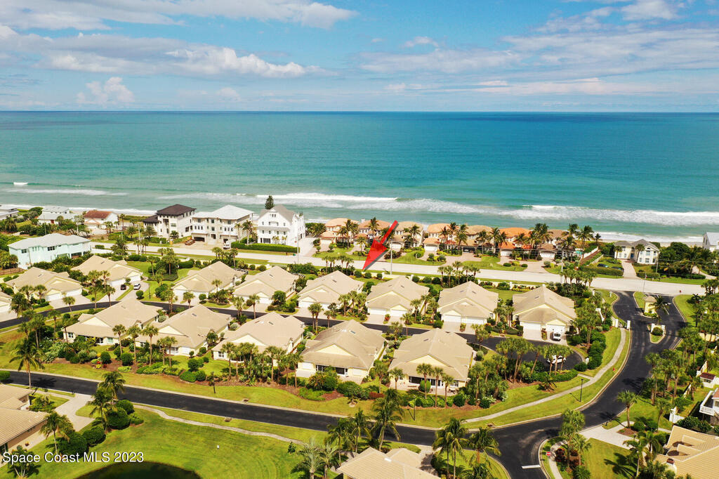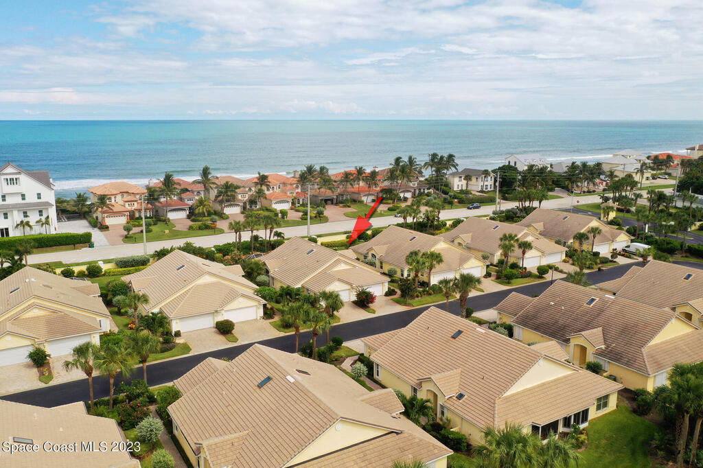 One level, concrete block villa in gated Indian Landing is situated so close to the ocean you can hear the waves! Updates in 2024/2025; luxury vinyl plank flooring with NO transitions, screened in lanai with concrete pad, A/C condenser, S/S appliances, toilets, rain gutters, interior painted with new baseboards and garage shelving added to 2 car garage. The villa has impact windows and slider, along with plantation shutters throughout. Great room concept with vaulted ceilings and kitchen opens to dining/living room. The new screened in lanai allows for grilling or just relaxing. Indian Landing community offers underground electrical and sewer, walk to the private beach access and community heated pool in 3 minutes, access to tennis courts in the neighboring community and private Indian River pier for sunsets is a short walk away. Publix grocery store is 4 miles north on A1A and the Sebastian Inlet is 8 miles south for great fishing.