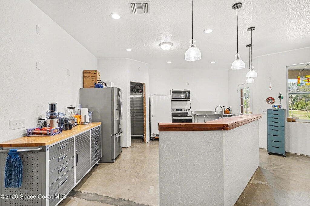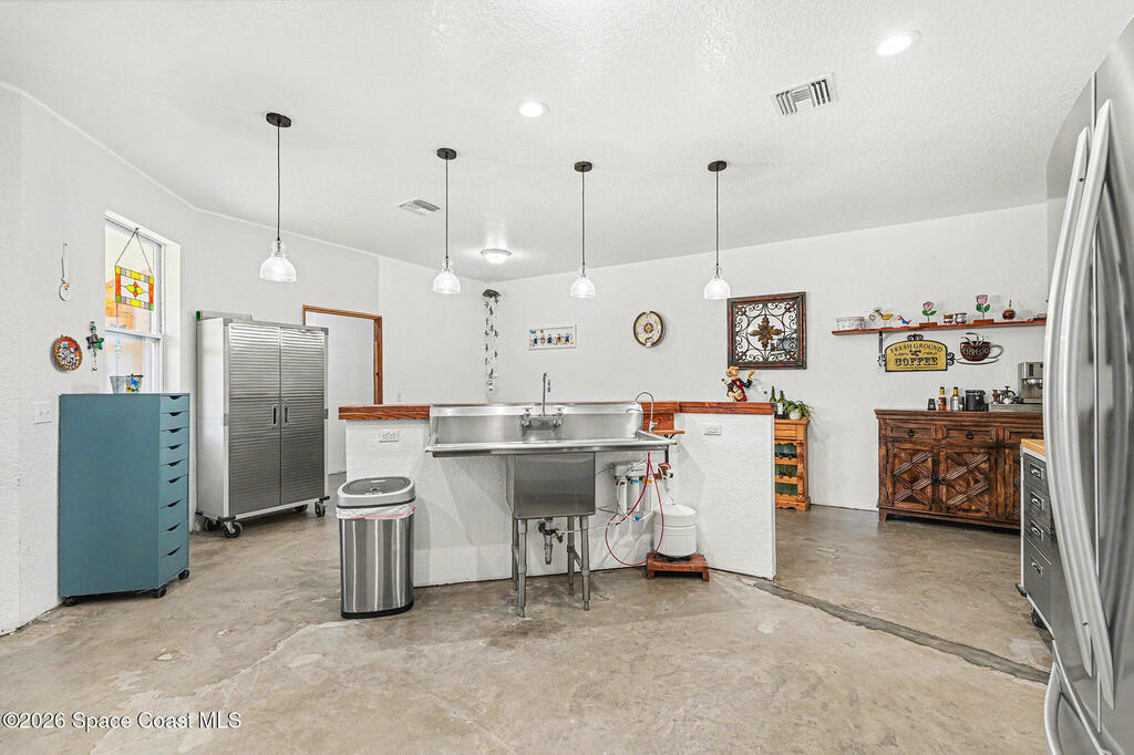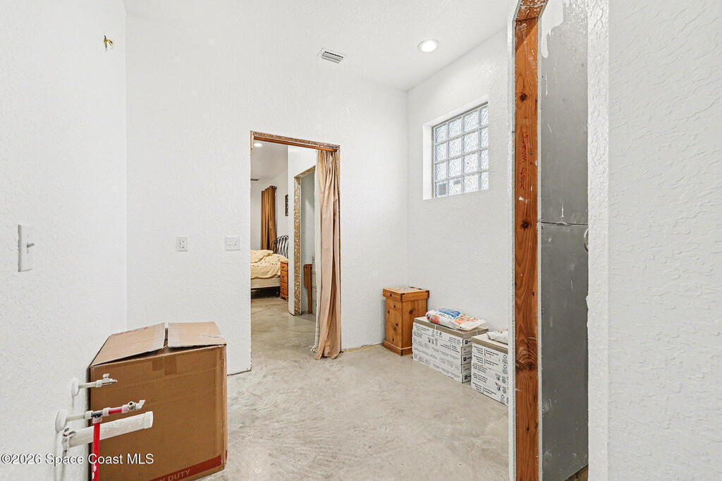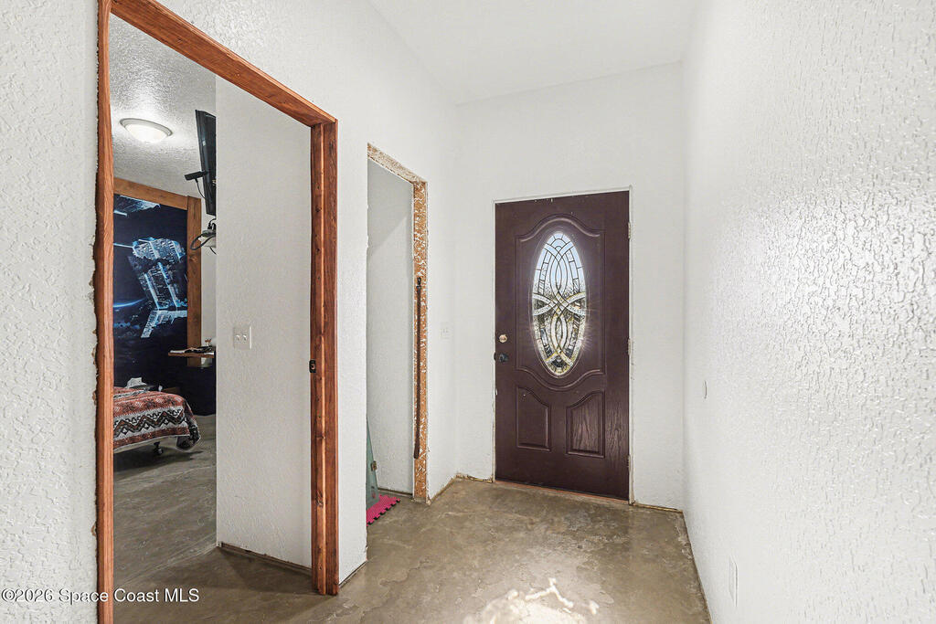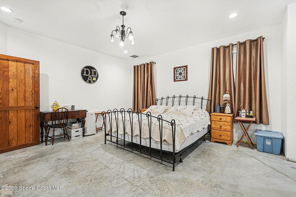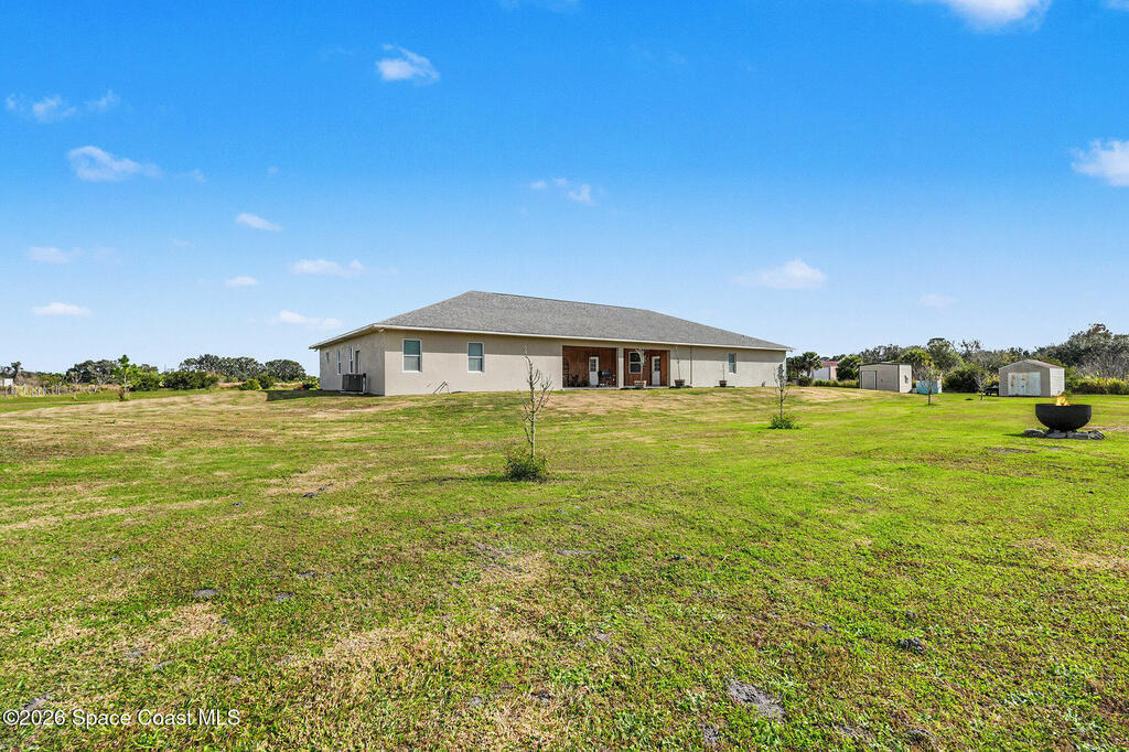 Space Coast living meets flexibility at 4960 Dixie Way, Mims, FL 32754. Built in 2019 and set on nearly 4 acres in Brevard County, this CBS concrete-block home was designed for multi-generational living, guests, or potential rental-style separation--two distinct living areas with private entrances, plus a center entry that connects both wings and the commercial-style garage. Rocket launches visible from the property. Pond with large mouthed bass.Approx. 6,000 SF total (about 3,825 SF under air + 1,800 SF garage- fits 5+ cars w/ auto lift setup + 375 SF porch) with 9'4'' ceilings, concrete floors ready to polish or finish, abundant closet storage and a large patio already plumbed for an outdoor kitchen. The south wing features a family room, 3 bedrooms, 2 baths, an office/guest room, and a spacious kitchen/dining area. The north wing offers a family room with wet-bar connection, 1 bedroom, 1 bath, a bonus room, and its own kitchen/dining. Home has (8) 240v outlets and 4 clean outs.