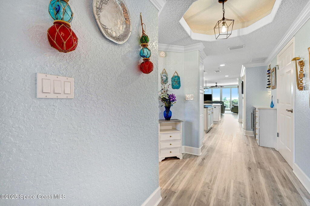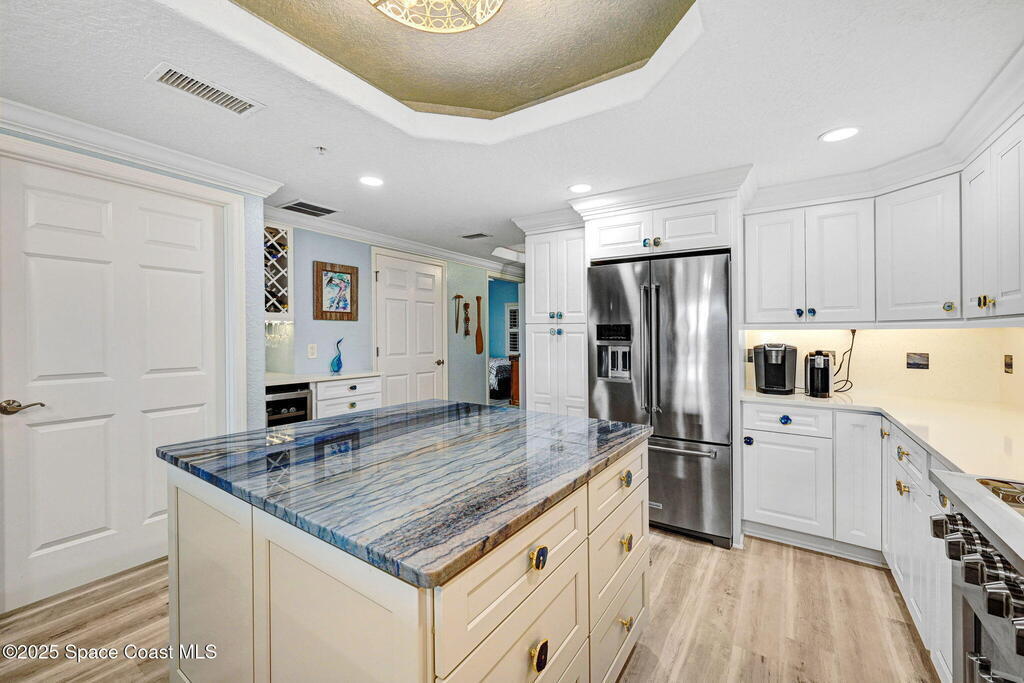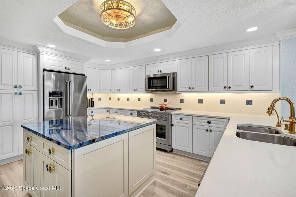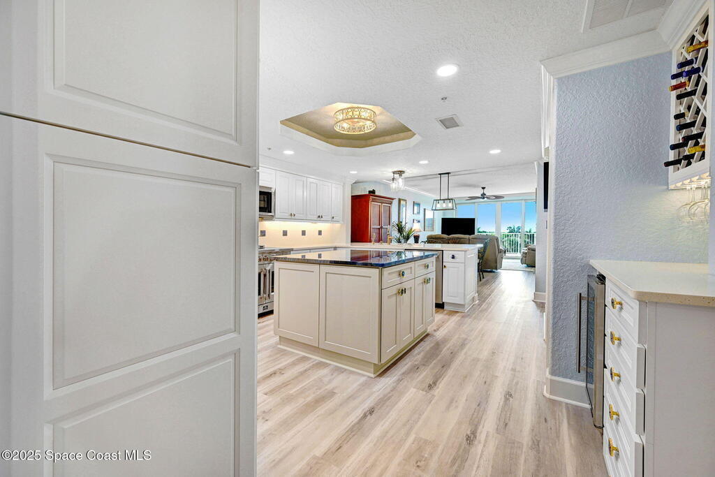 Luxury meets coastal living with a fully renovated oceanfront condo in the heart of Cape Canaveral. SE exposure delivers stunning sunrise and partial Atlantic views from a private balcony. The chef's kitchen features an imported FORNO Italian French-door oven, blue macauba quartzite counters, custom cabinetry, and premium hardware. Refined details include tray ceilings, statement fandoliers, and upgraded KOHLER fixtures. The primary suite offers impact-rated sliders to the balcony and two custom walk-in closets. The spa like bath includes dual macauba quartz vanities, illuminated fog-resistant mirrors, a high tech Japanese commode, walk in tiled shower with seating, and a KOHLER whirlpool soaking tub. Two additional bedrooms and an updated guest bath provide comfort for visitors. Includes oversized one-car garage parking. Seaport Oceanfront Condos offer amenities with pools, tennis, pickleball, direct beach access, and rocket launch views! 5 Mins to 528 and Jetty Park. Must see!