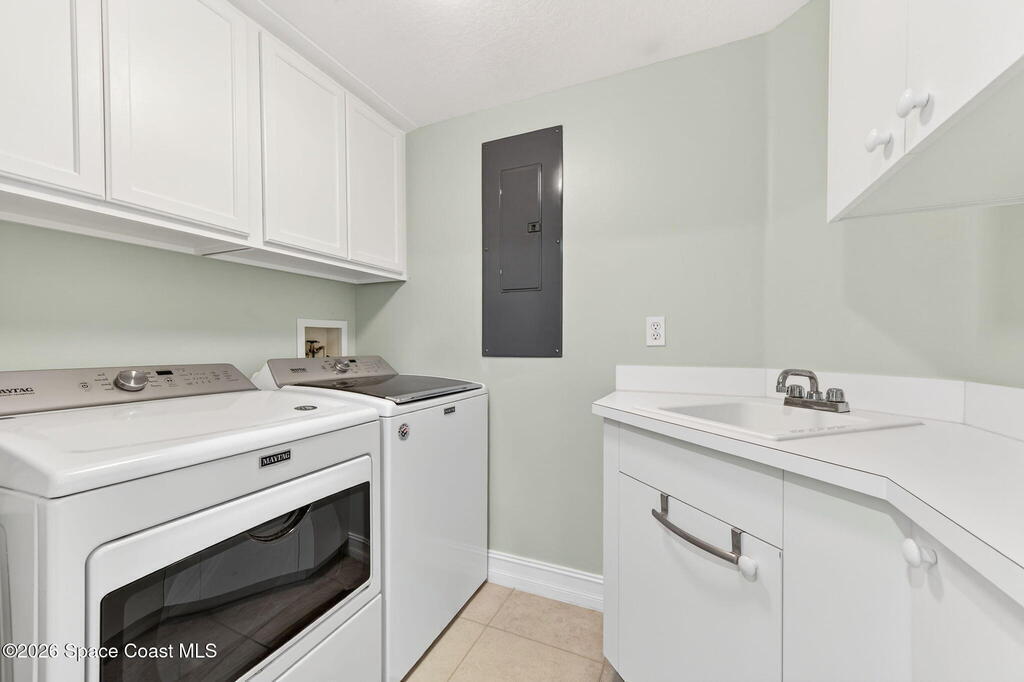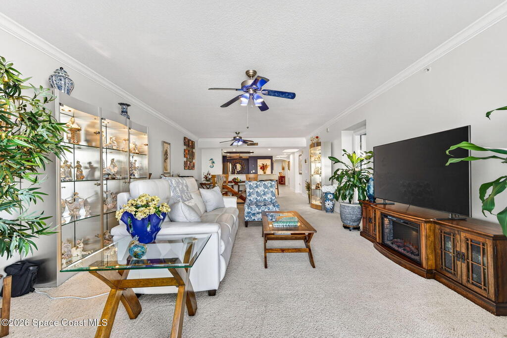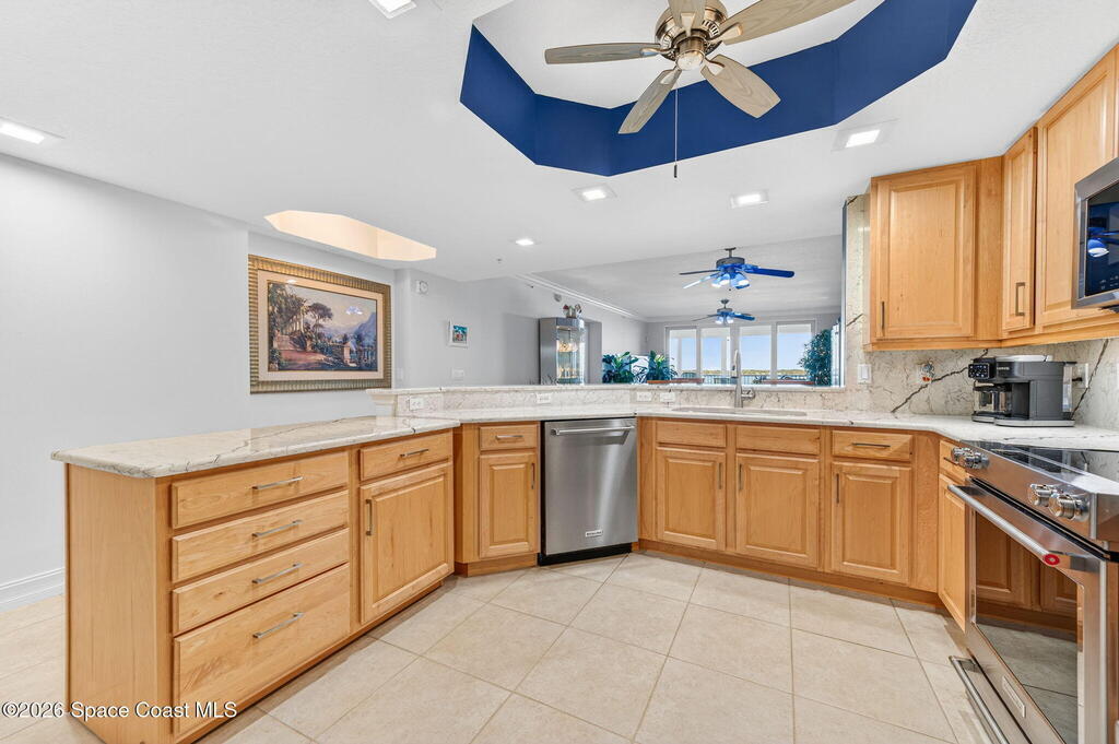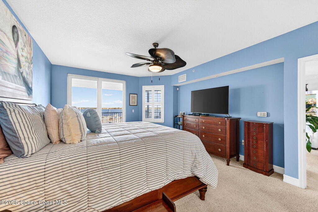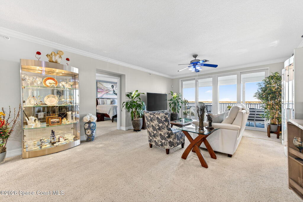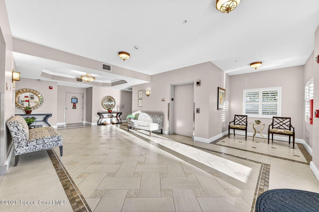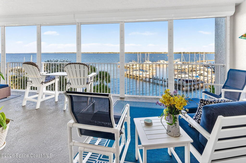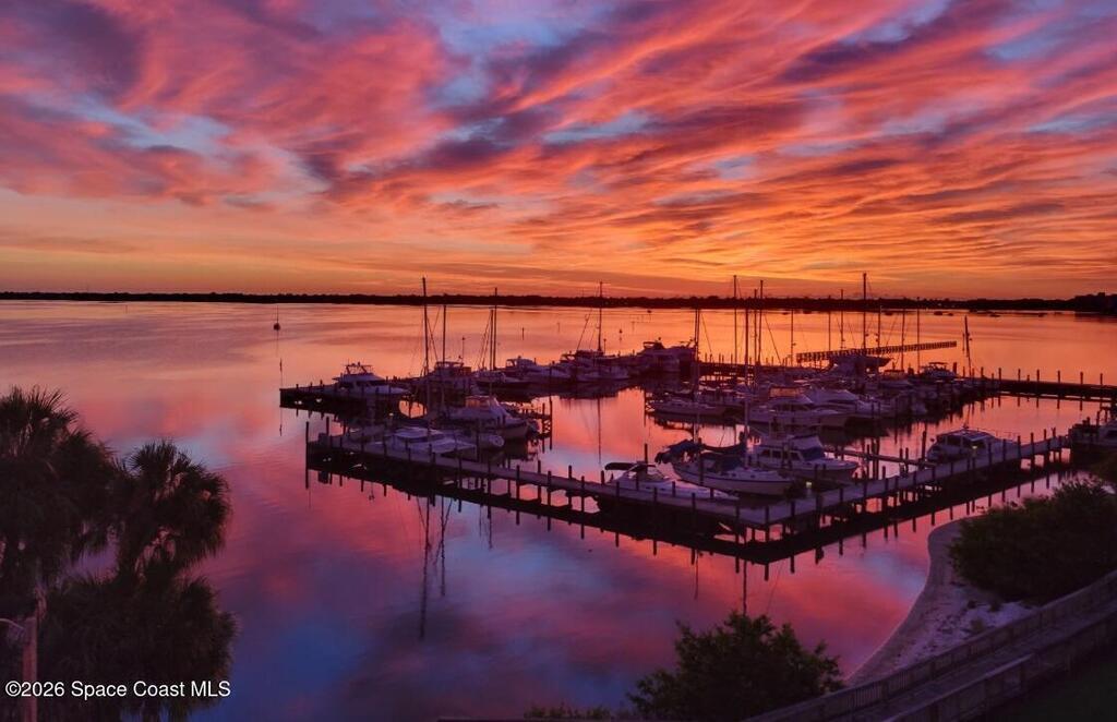 Stunning, renovated 5th floor condo in sought-after Whitley Bay West, just steps from historic Cocoa Village. This move-in-ready unit features a beautifully updated kitchen with custom quartz countertops, top-of-the-line KitchenAid stainless steel appliances, eat-in area, and breakfast bar. Bathrooms and bedrooms updated with custom quartz finishes and painted with coastal colors. The spacious primary suite offers a seamless glass shower enclosure, jetted Jacuzzi tub, double sinks, and breathtaking sunrise views over the Indian River. Enjoy the covered patio with ample space for living and dining, showcasing water, marina and front row rocket launch views. Additional features include plantation shutters, in-unit Maytag washer/dryer, underground dedicated parking garage with additional open/guest parking. Community amenities include a fitness room, clubhouse, resort-style pool and heated spa. Roof 2024. A/C 2023. Maintenance-free resort living with a small-town walk to the village feel