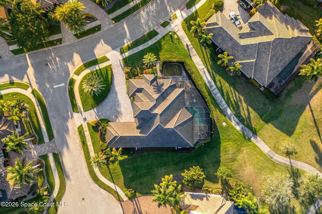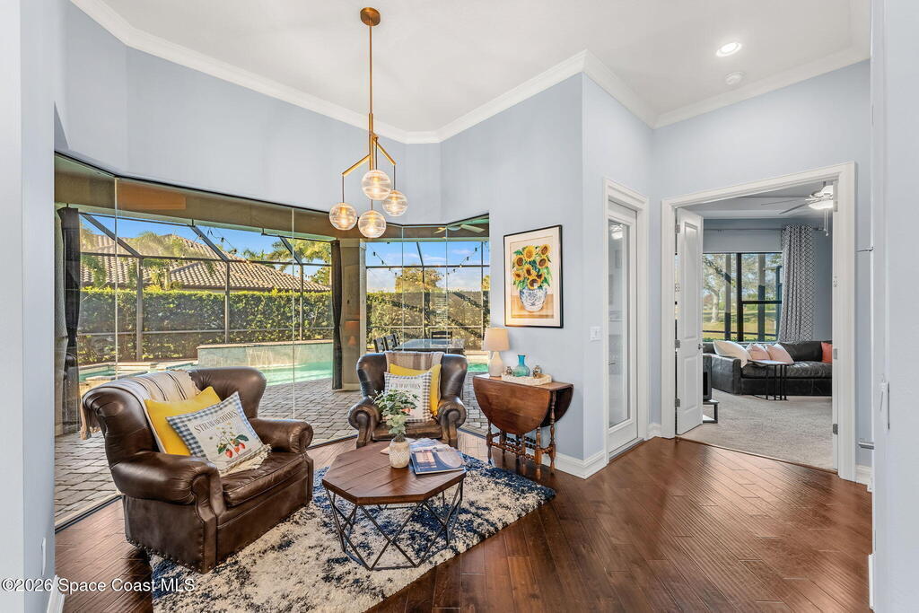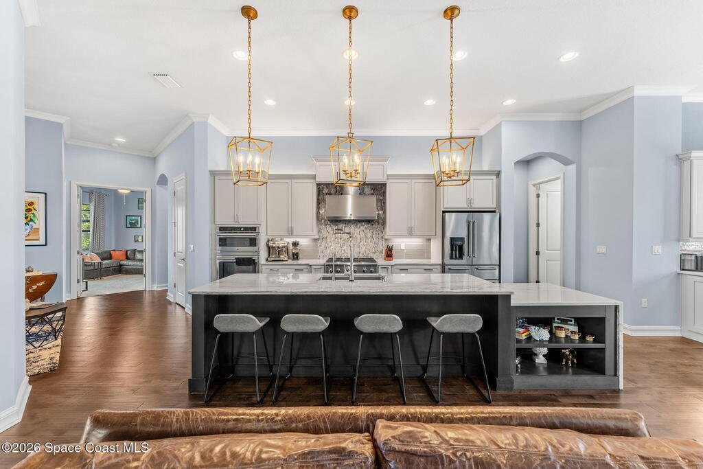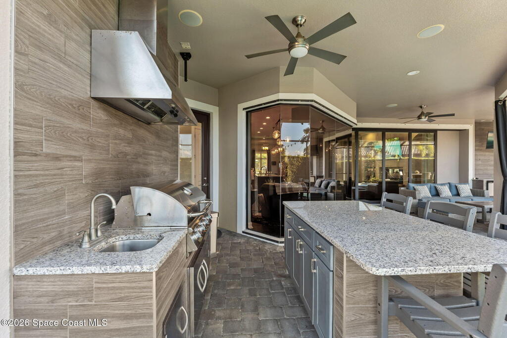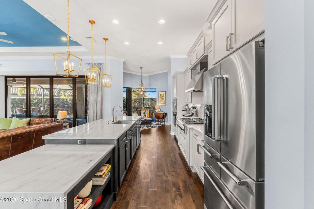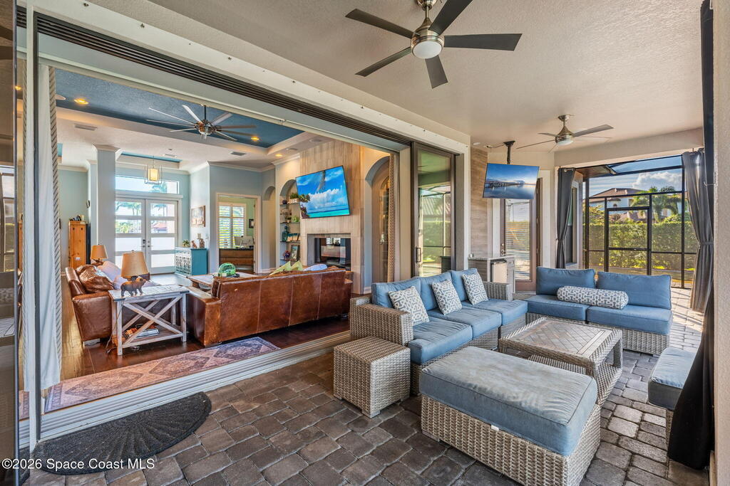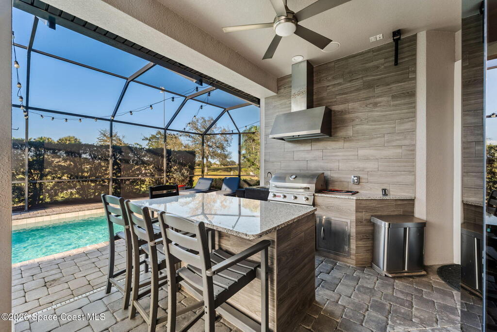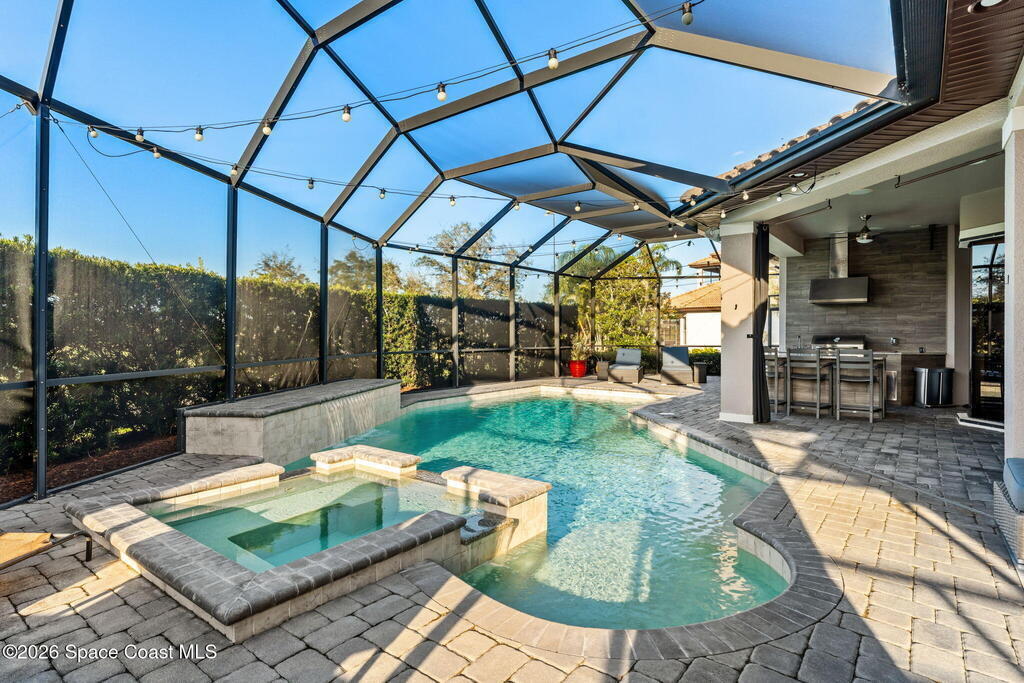 Welcome to Wyndham at Duran, one of Viera's most prestigious gated golf communities, offering 24/7 security, manicured streetscapes, and serene golf course vistas. Ideally positioned on a premium corner lot within a quiet cul-de-sac, this residence blends architectural elegance with modern comfort.This exceptional 4-bedroom + dedicated office, 3.5-bath home showcases wide-plank hardwood floors, a beautifully appointed fireplace, and handcrafted mahogany entry doors. The open-concept design centers around a chef's kitchen featuring a 13-foot quartzite island, GE Cafe appliance suite, natural gas cooktop, vented hood, custom cabinetry, and a walk-in wine room, perfectly curated for both daily living and effortless entertaining.Expansive 9-foot pocket sliders create seamless indoor-outdoor living, opening to a private outdoor sanctuary complete with a fully equipped summer kitchen, large island, and vented hood. The luxurious primary suite offers tray ceilings, dual
