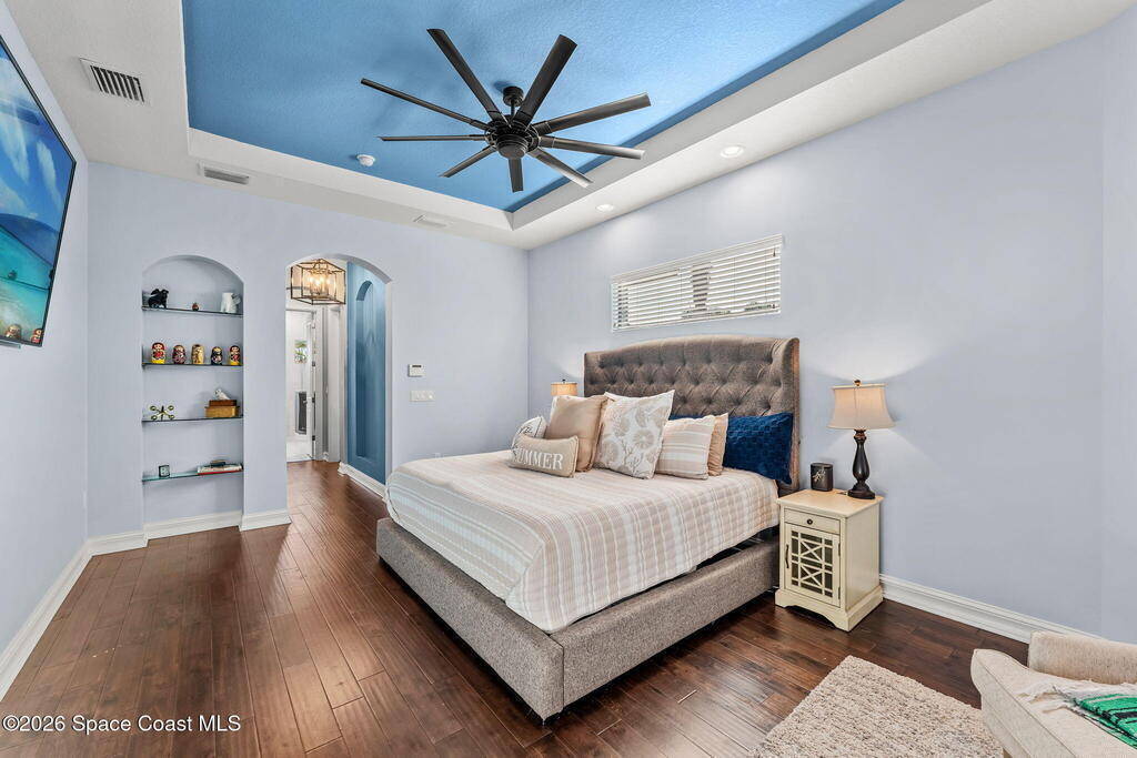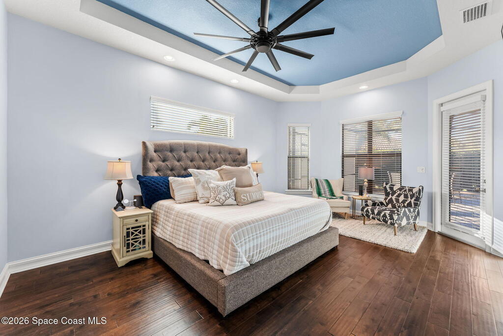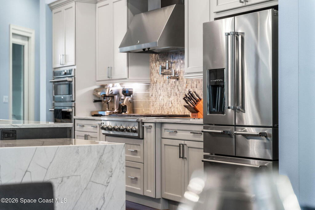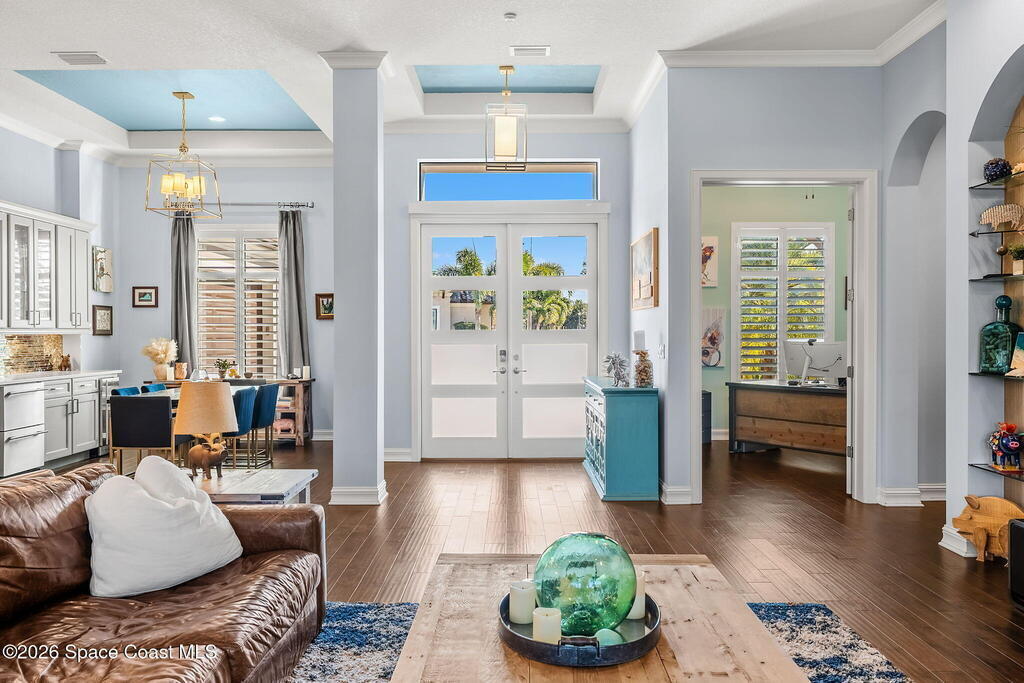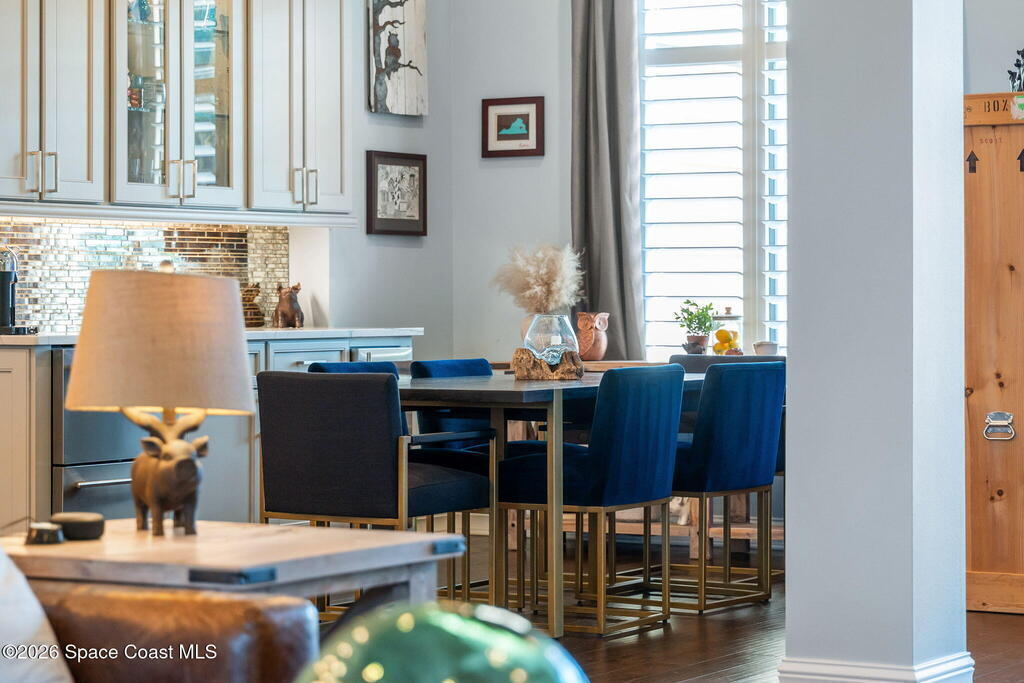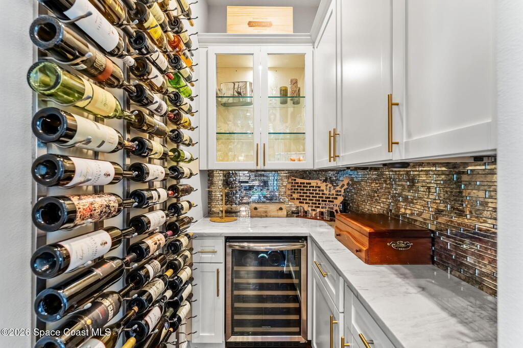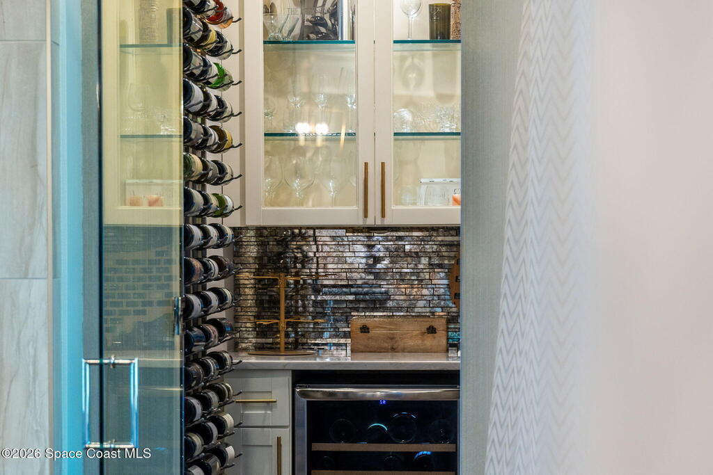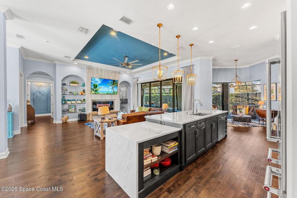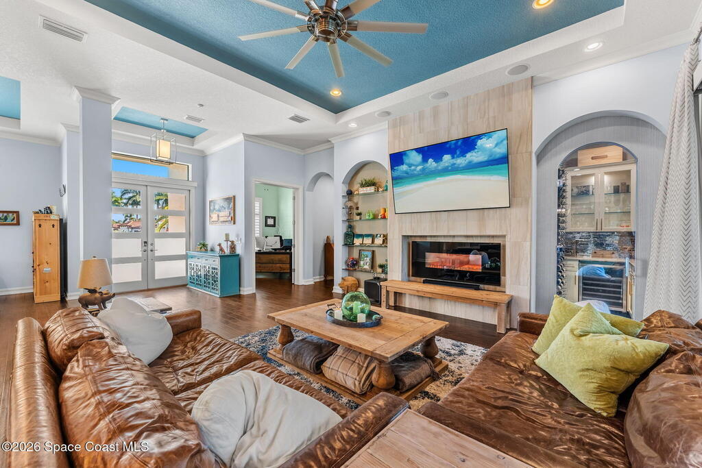 Welcome to Wyndham at Duran, one of Viera's most prestigious gated golf communities, offering 24/7 security, manicured streetscapes, and serene golf course vistas. Ideally positioned on a premium corner lot within a quiet cul-de-sac, this residence blends architectural elegance with modern comfort.This exceptional 4-bedroom + dedicated office, 3.5-bath home showcases wide-plank hardwood floors, a beautifully appointed fireplace, and handcrafted mahogany entry doors. The open-concept design centers around a chef's kitchen featuring a 13-foot quartzite island, GE Cafe appliance suite, natural gas cooktop, vented hood, custom cabinetry, and a walk-in wine room, perfectly curated for both daily living and effortless entertaining.Expansive 9-foot pocket sliders create seamless indoor-outdoor living, opening to a private outdoor sanctuary complete with a fully equipped summer kitchen, large island, and vented hood. The luxurious primary suite offers tray ceilings, dual