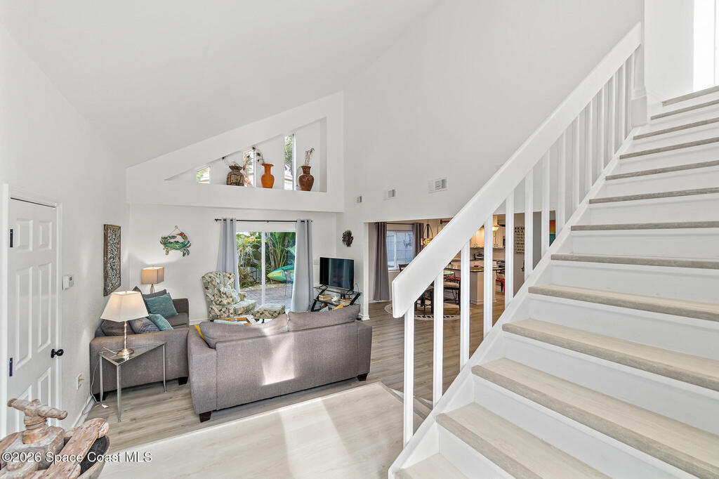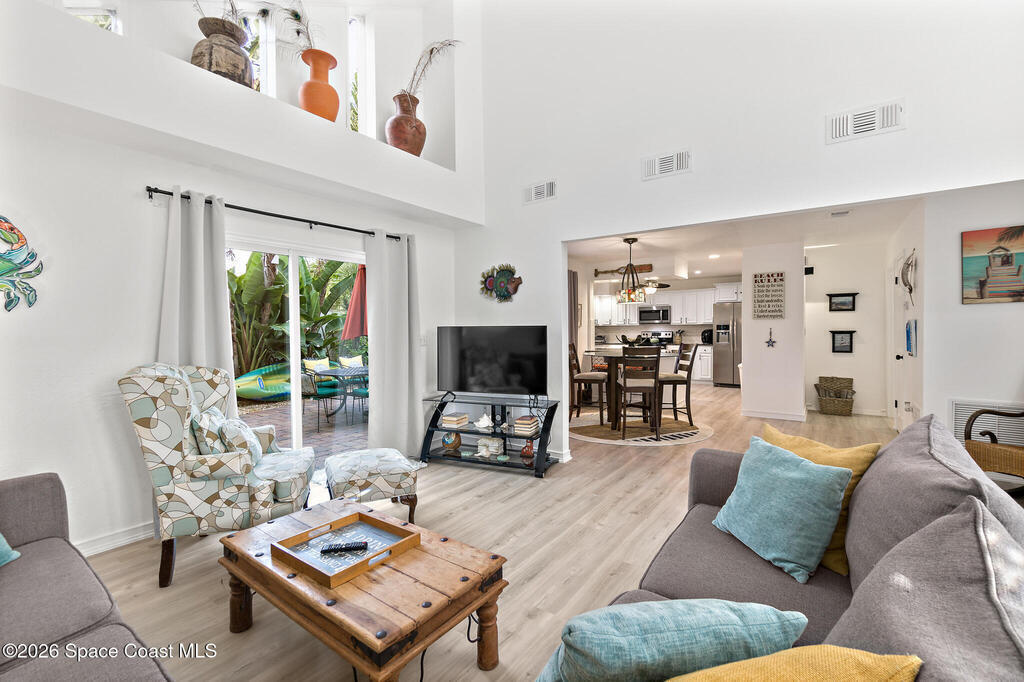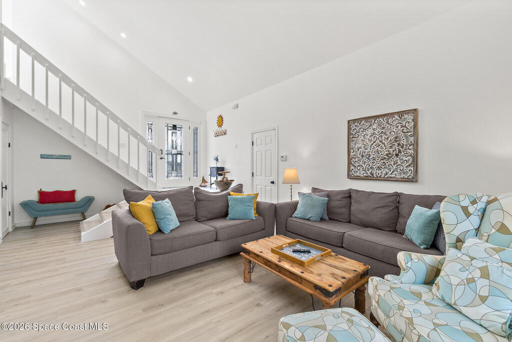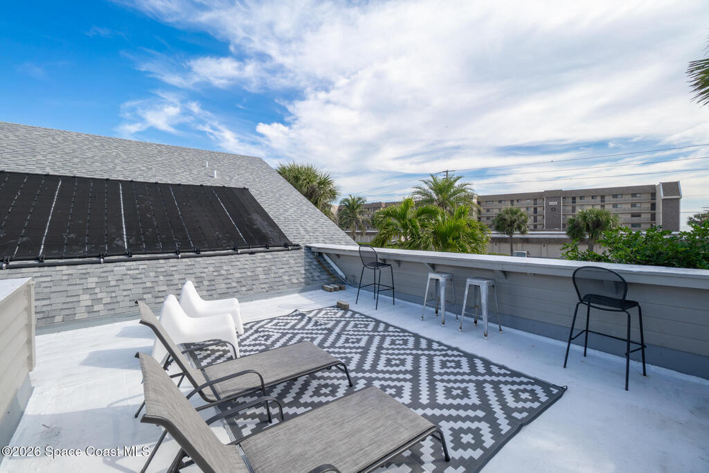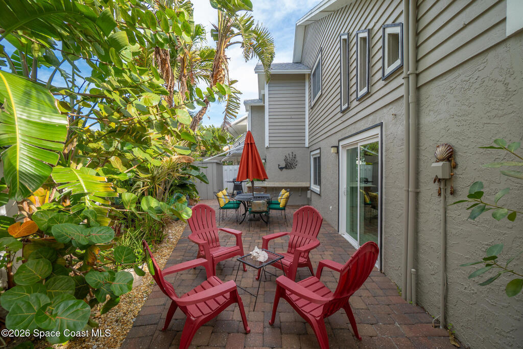 4/4.5 pool home across from the beach in Cape Canaveral. Short term rentals allowed, no HOA, heated pool, furnished, and garage.This two story home offers 2,057 square feet with flexible use for primary living, vacation ownership, or rental income. The main level features vaulted ceilings, an open living and dining area, and a kitchen with granite countertops, stainless steel appliances, and breakfast bar seating. Two first floor bedroom suites provide excellent flexibility, including one with private patio access, plus a convenient half bath near the entry.Upstairs, the primary suite offers separation and privacy with a walk in closet, dual sink bath, and tub with separate shower. A fourth bedroom and additional full bath complete the second level. Outdoor living centers around a heated in ground pool, privacy fenced paver patio, outdoor bar and grilling area, and wraparound outdoor space. A second floor balcony and rooftop deck offer ocean views.