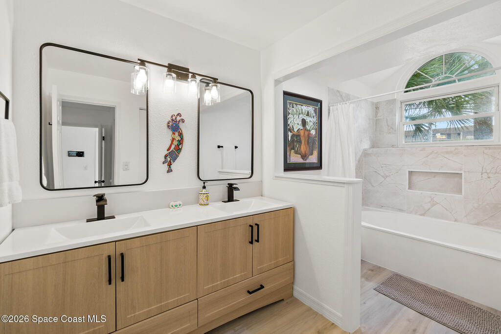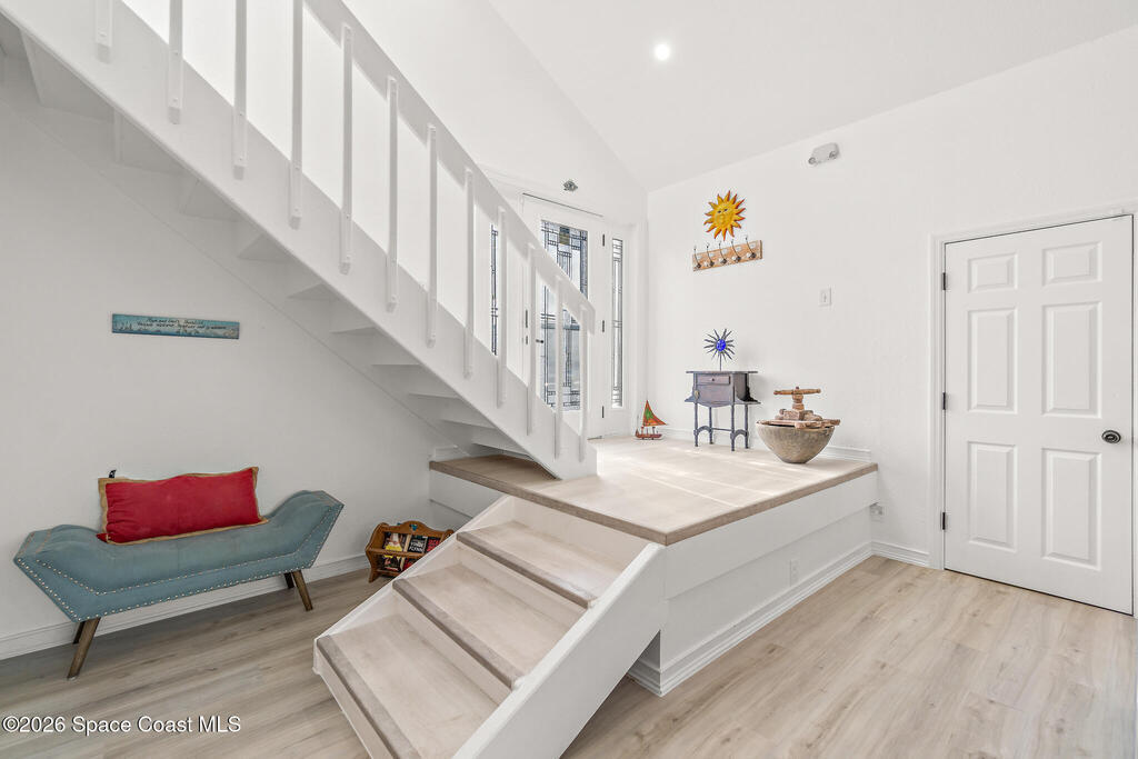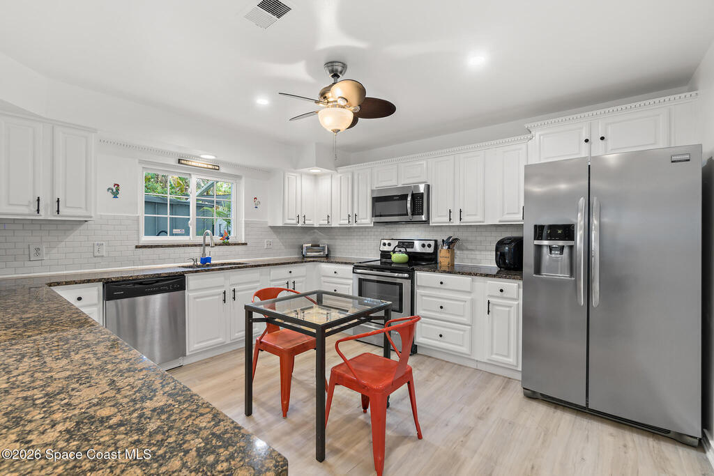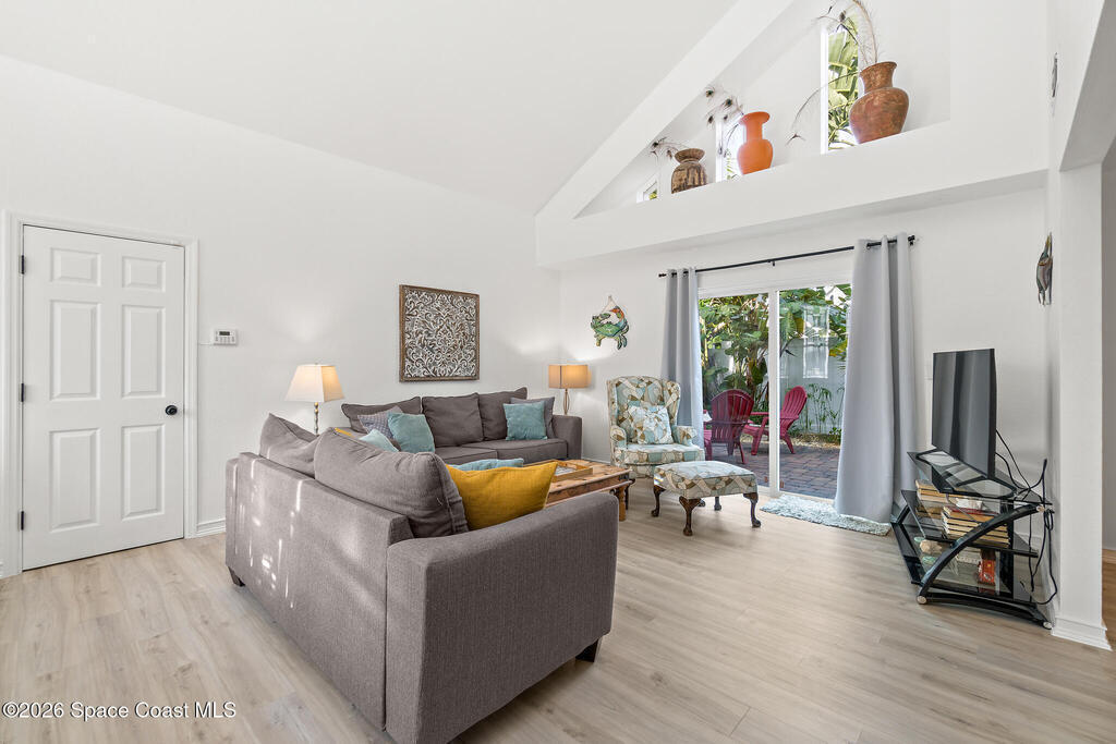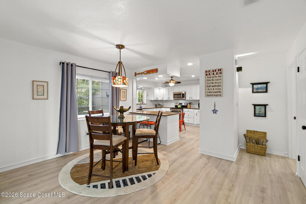 4/4.5 pool home across from the beach in Cape Canaveral. Short term rentals allowed, no HOA, heated pool, furnished, and garage.This two story home offers 2,057 square feet with flexible use for primary living, vacation ownership, or rental income. The main level features vaulted ceilings, an open living and dining area, and a kitchen with granite countertops, stainless steel appliances, and breakfast bar seating. Two first floor bedroom suites provide excellent flexibility, including one with private patio access, plus a convenient half bath near the entry.Upstairs, the primary suite offers separation and privacy with a walk in closet, dual sink bath, and tub with separate shower. A fourth bedroom and additional full bath complete the second level. Outdoor living centers around a heated in ground pool, privacy fenced paver patio, outdoor bar and grilling area, and wraparound outdoor space. A second floor balcony and rooftop deck offer ocean views.