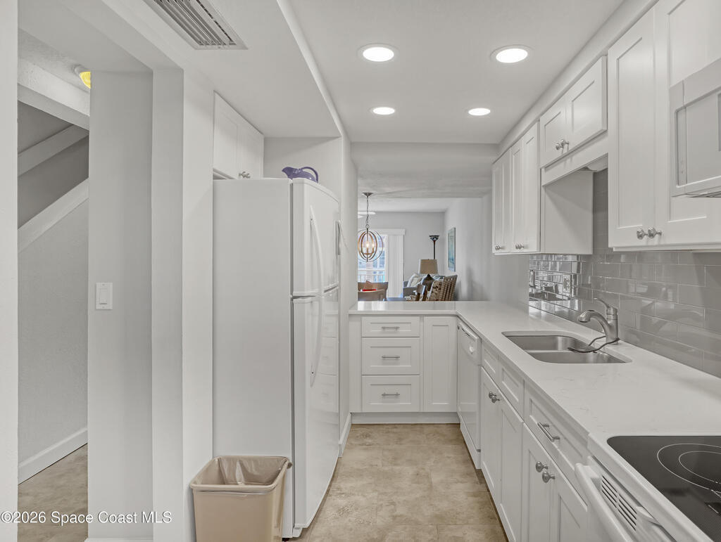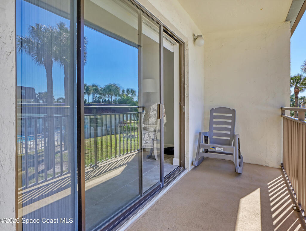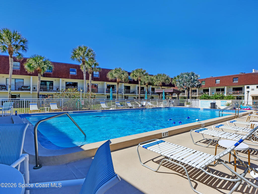Welcome to Paradise! Living up to it's moniker, this gorgeous two bedroom, two and a half bath condo is tastefully updated and just a two minute walk to Paradise Beach (aka the local's beach). Featuring an updated kitchen with LED lighting, quartz countertops, white cabinets, tile back splash & floors. impact rated windows and brand new a/c system, new interior paint, slider blinds, plantation shutters, and plenty of storage space throughout. Both bedrooms are spacious, with private full baths & walk-in shower in master suite. Enjoy sunshine, surfing, & great rocket launch viewing, walk to restaurants, and shopping. Sip your coffee in the morning on your private porch overlooking the beautifully maintained pool. From tennis courts, sauna and a shuffleboard court, activities abound. Offered turn-key furnished, bring your toothbrush and immediately begin to enjoy all that Florida beach life has to offer.