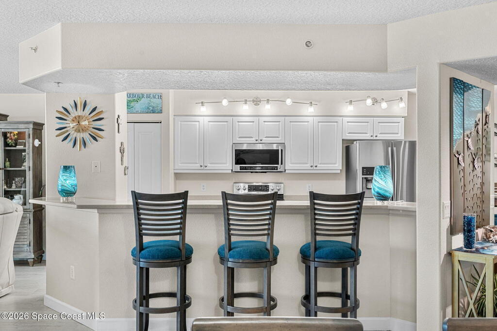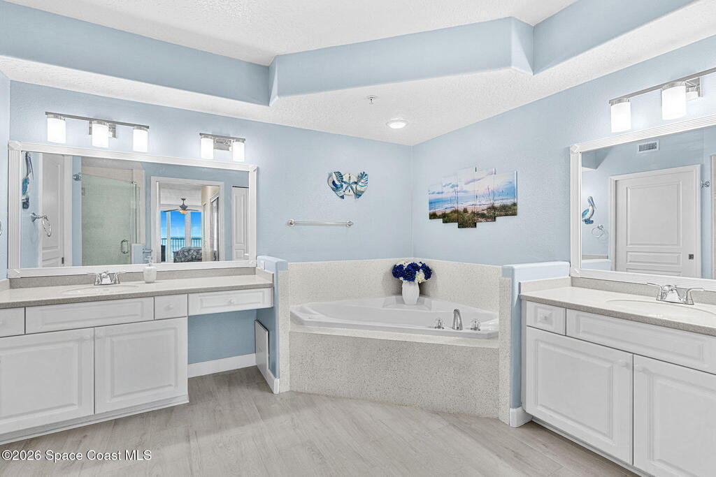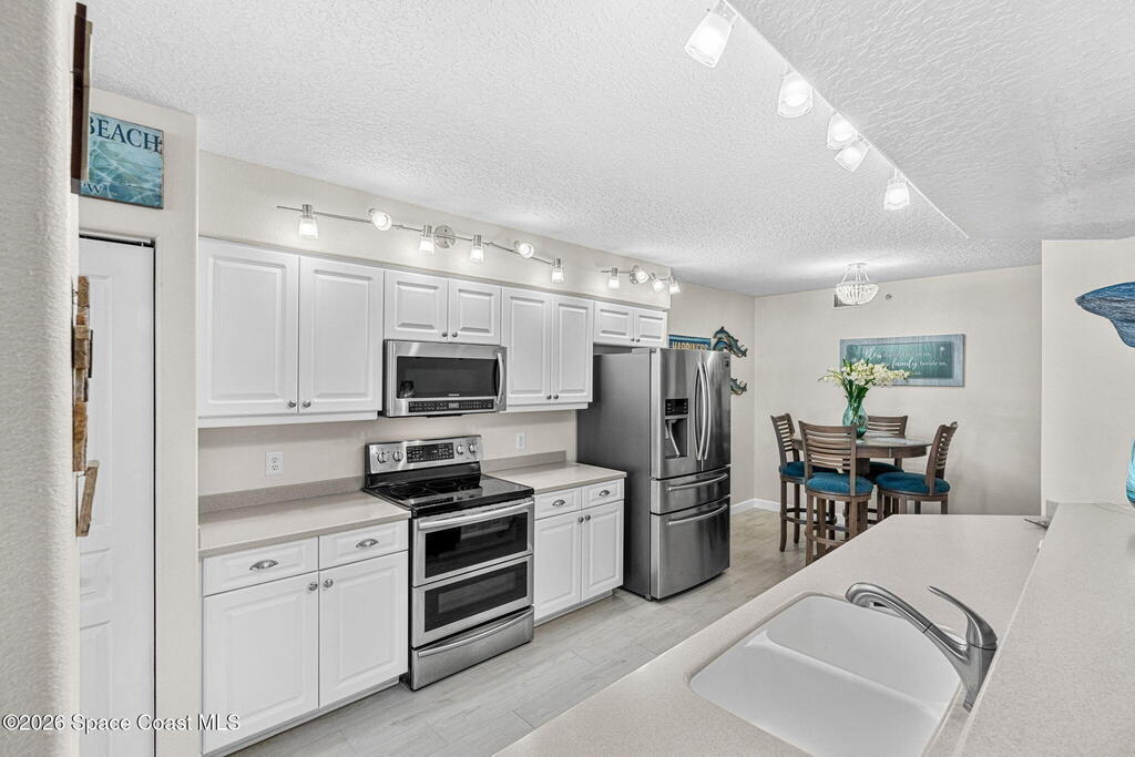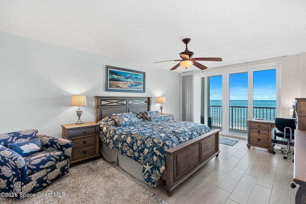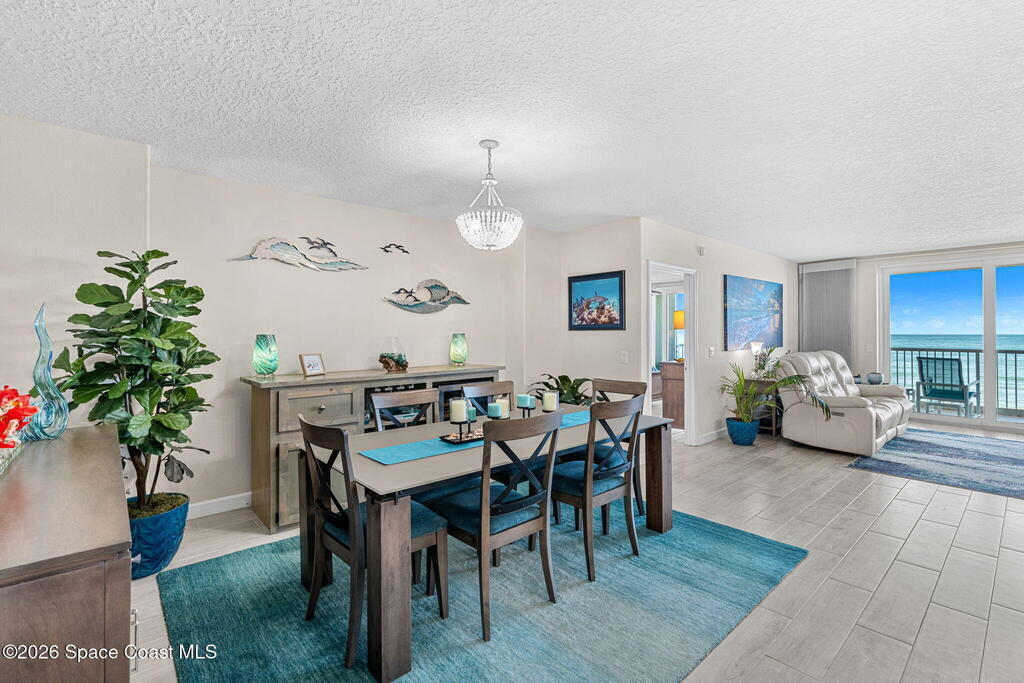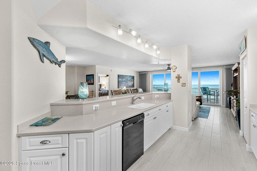 Oceanfront living on the third floor makes an immediate impression, capturing your attention the moment you enter as your eyes are pulled straight to the breathtaking view. Wide-plank, hardwood-look tile creates a crisp, modern foundation, while new sliders span the living & dining areas, filling the home with natural light, ocean breezes, & coastal energy. Electric blinds add refinement & the layout keeps the flow open, effortless, & intuitive.The kitchen stands confidently with Corian countertops, a raised gathering bar, an eat-in design, SS appliances (stove, microwave, and refrigerator), & a thoughtfully placed pantry. The expansive primary suite makes an impression with balcony access, dual closets, & an expansive bath featuring double sinks, a private water closet, a jetted tub, & a glass-enclosed shower with a bench. A full laundry room with tub & cabinetry, a powder room, & a glass wrapped guest bath elevate everyday convenience.