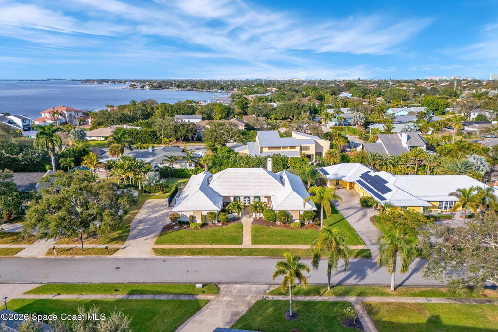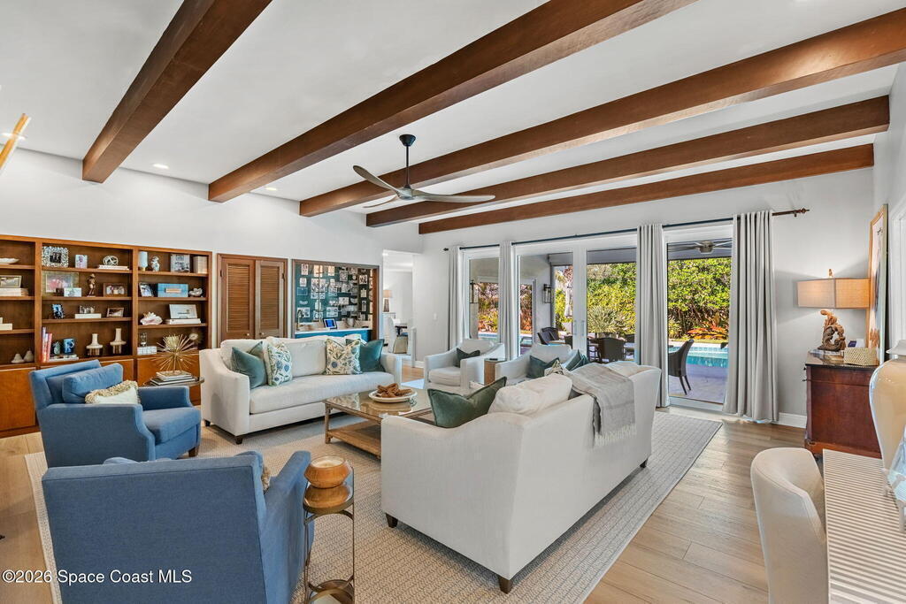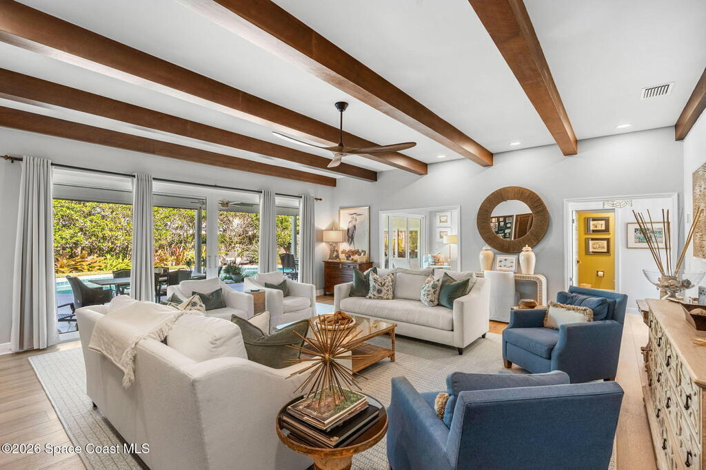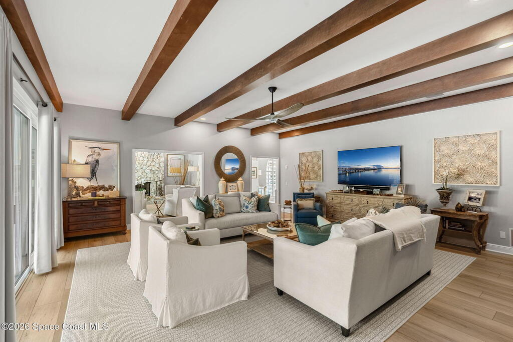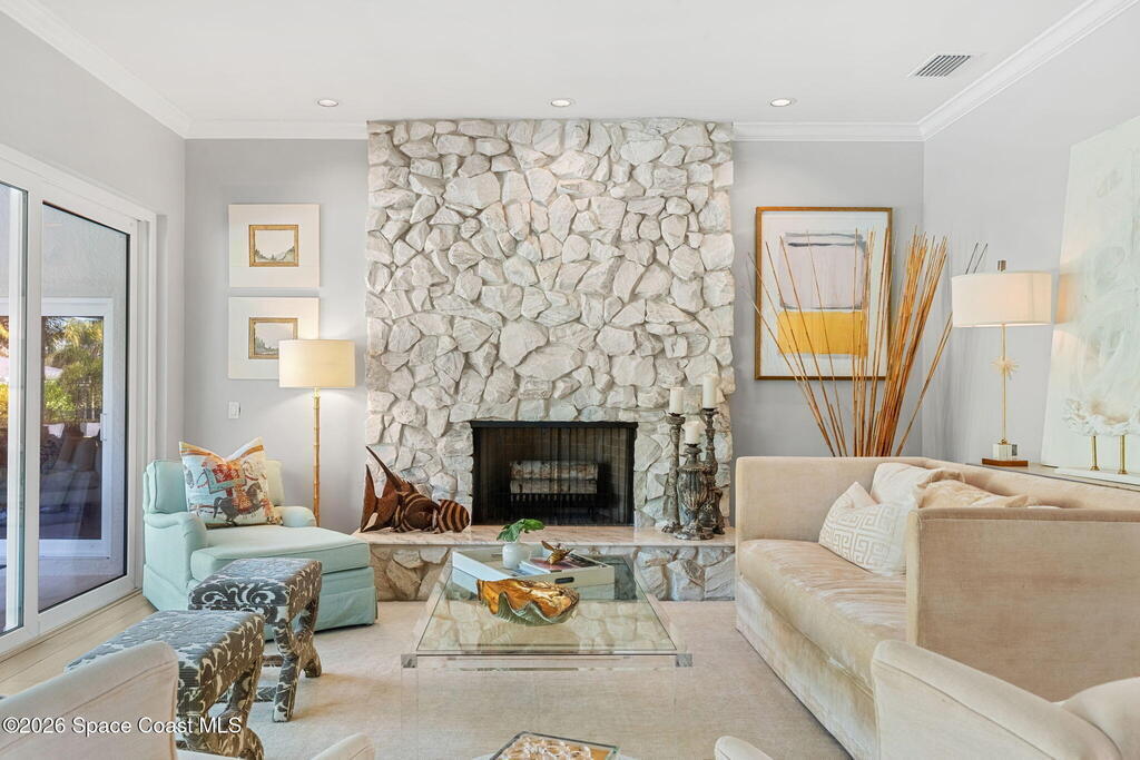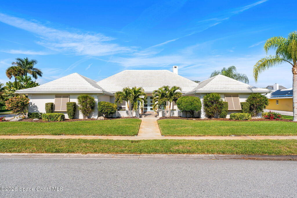 Located in the highly desirable estate section of Franklyn Avenue in Indialantic, this concrete block home has been thoughtfully improved with a focus on quality, durability, and everyday livability. Major upgrades include new impact-rated windows and doors, new Trane HVAC systems, and updated ductwork throughout.Set on a .42-acre lot, the property is framed by refreshed landscaping and subtle water features that create a sense of privacy without feeling closed off. Bimini shutters on select windows add a refined architectural detail, complementing the home's exterior. Inside, the home offers large, well-proportioned living spaces with new flooring, updated trim, and carefully selected lighting throughout. A fireplace anchors the main living area, adding warmth and character.