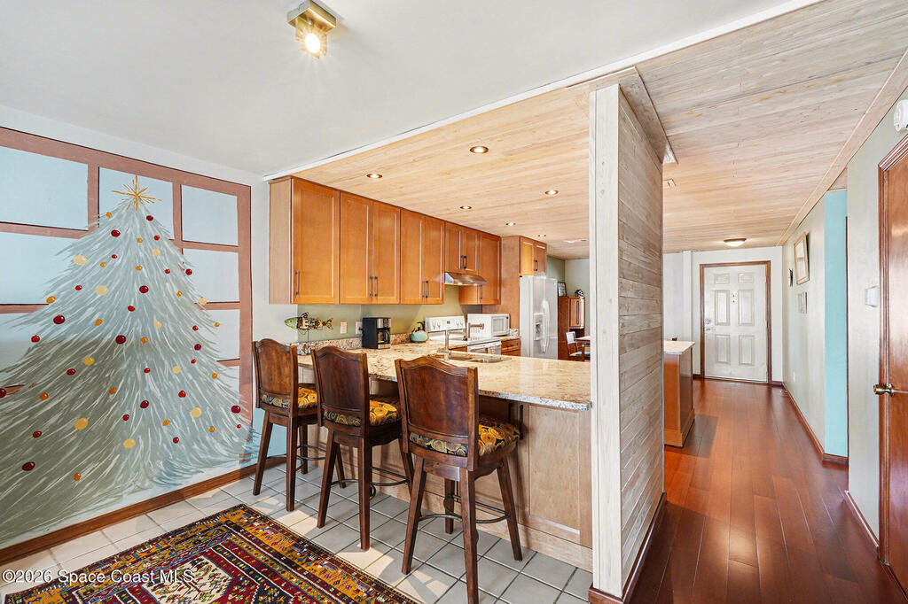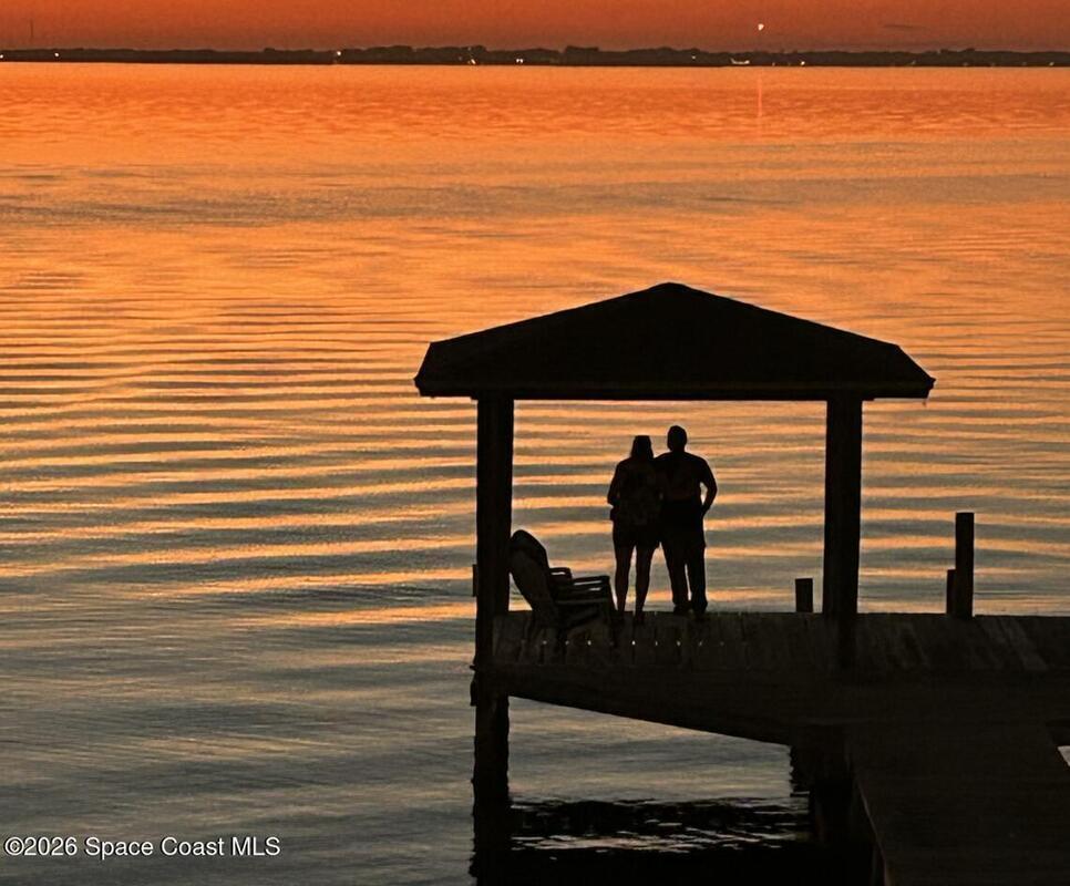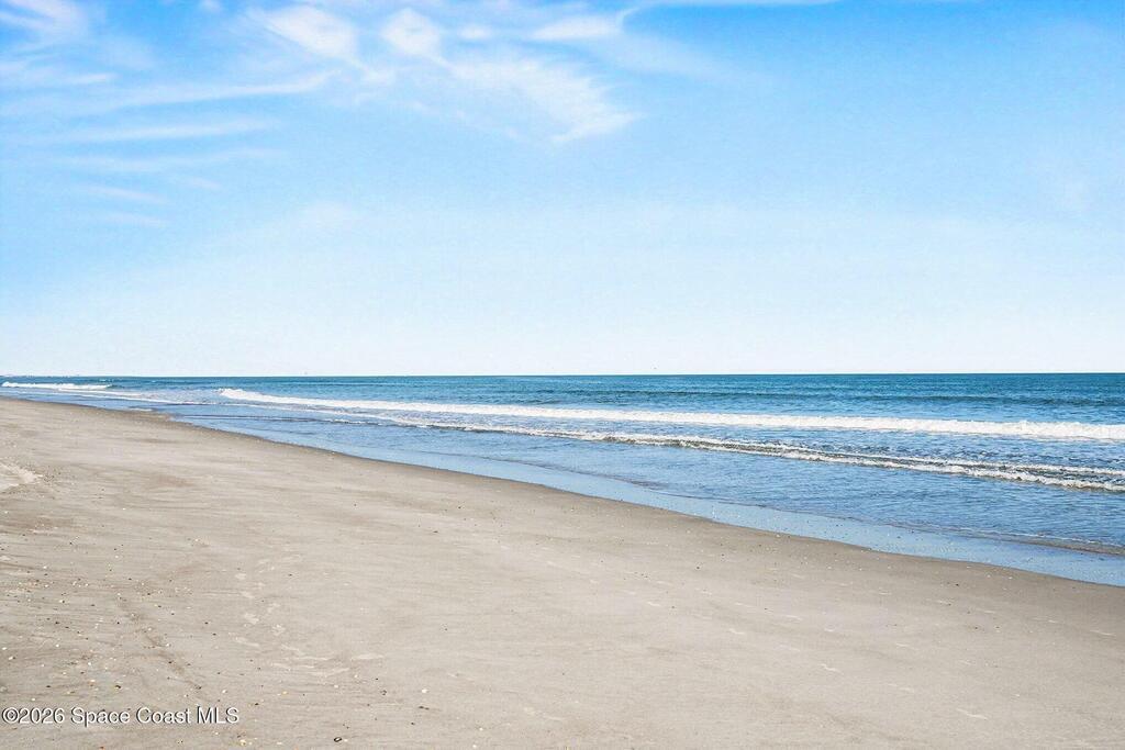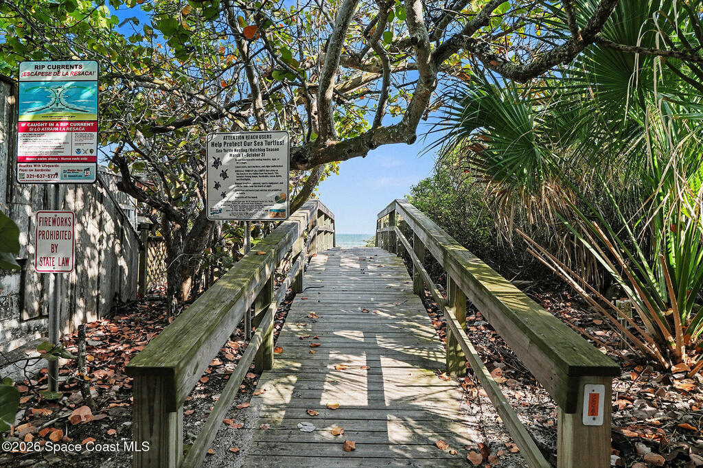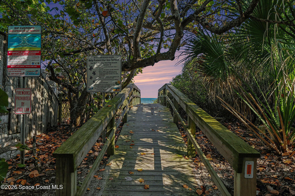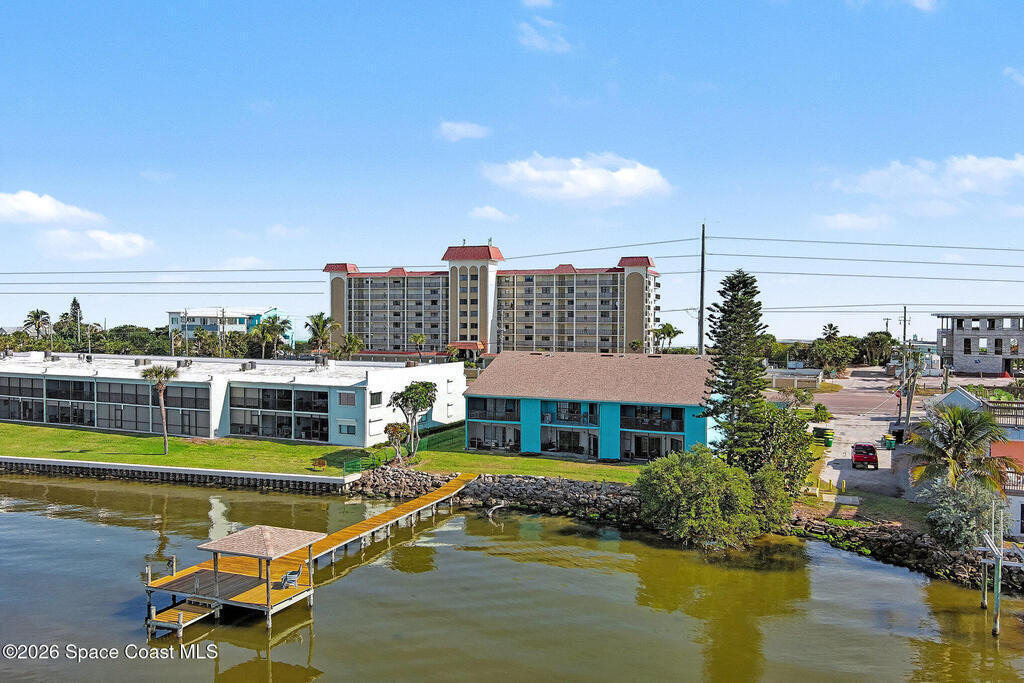 Enjoy the best of riverfront and ocean living from this comfortable, updated, and well-maintained second-floor condo. Take in expansive Banana River views from your balcony or walk just 300 yards across the street to enjoy the beach. A true nature and watersports paradise--watch dolphins and ospreys, explore the river or ocean by kayak or paddleboard, and take in spectacular sunsets over the water.The home features hurricane impact windows front and back, tile and wood flooring throughout, and a combined kitchen and dining area with custom cedar-planked ceilings, maple cabinetry, Brazilian Glacier White granite countertops, and seating for three at the breakfast bar. The living room and bedrooms include ceiling fans for added comfort. The primary suite offers a walk-in closet, attic access, and a custom bath with granite-topped maple vanity. Enjoy ocean sunrises and river sunsets--this is truly the best of Cocoa Beach living.