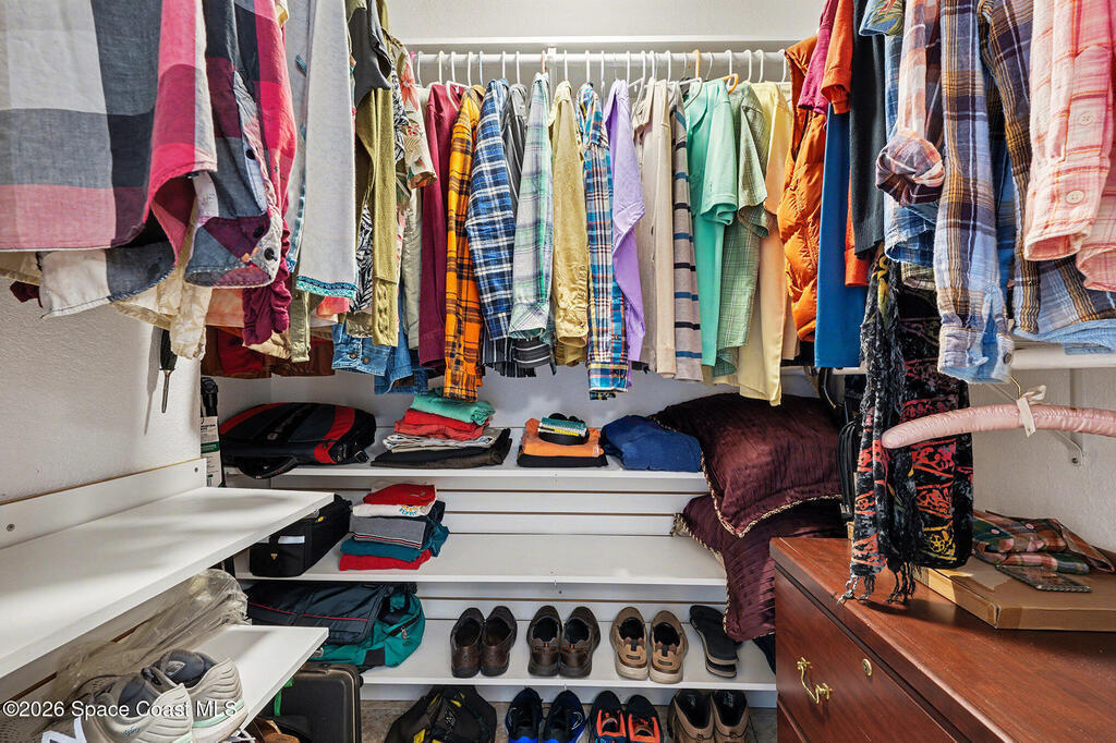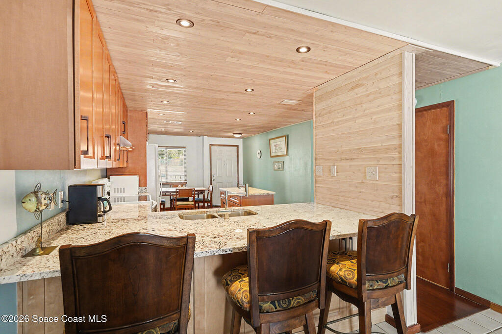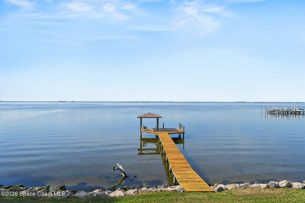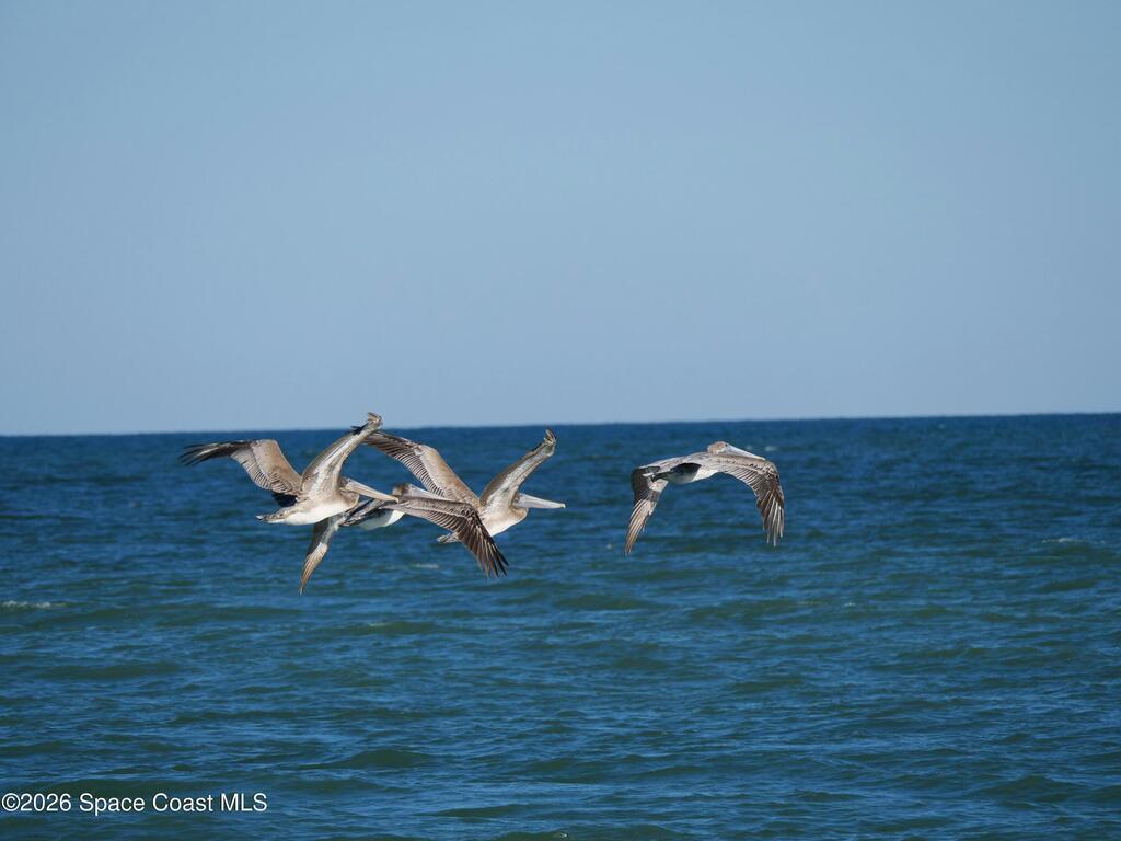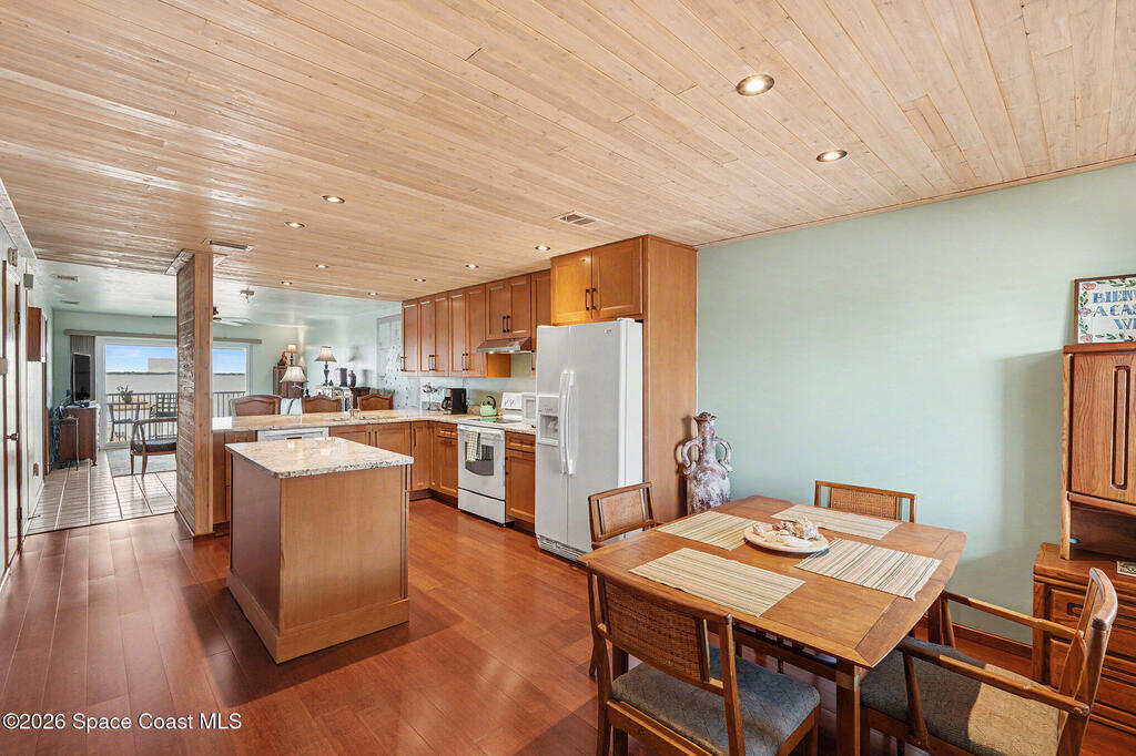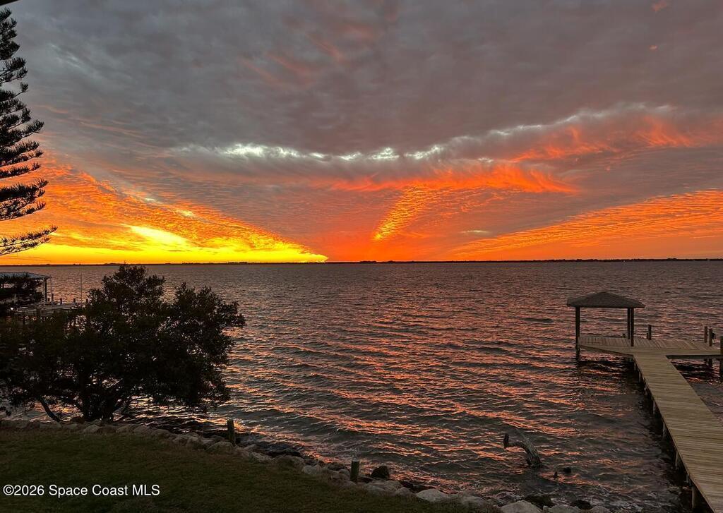 Enjoy the best of riverfront and ocean living from this comfortable, updated, and well-maintained second-floor condo. Take in expansive Banana River views from your balcony or walk just 300 yards across the street to enjoy the beach. A true nature and watersports paradise--watch dolphins and ospreys, explore the river or ocean by kayak or paddleboard, and take in spectacular sunsets over the water.The home features hurricane impact windows front and back, tile and wood flooring throughout, and a combined kitchen and dining area with custom cedar-planked ceilings, maple cabinetry, Brazilian Glacier White granite countertops, and seating for three at the breakfast bar. The living room and bedrooms include ceiling fans for added comfort. The primary suite offers a walk-in closet, attic access, and a custom bath with granite-topped maple vanity. Enjoy ocean sunrises and river sunsets--this is truly the best of Cocoa Beach living.