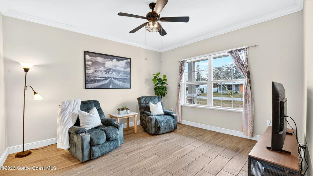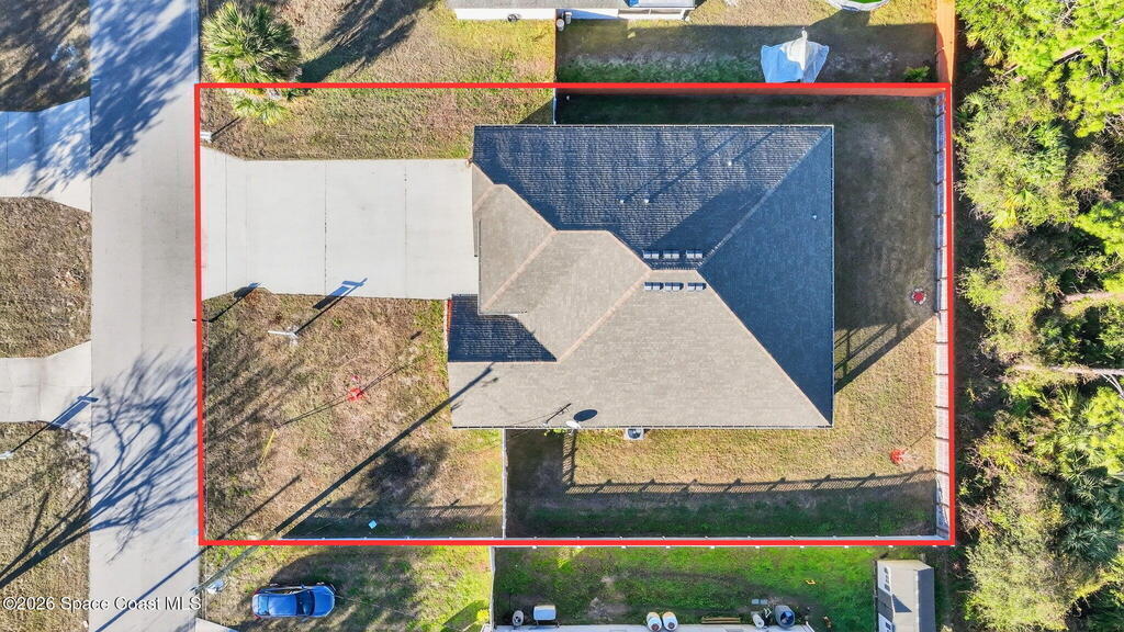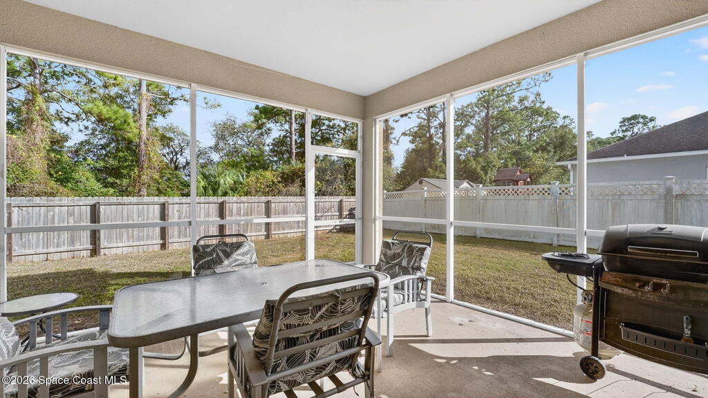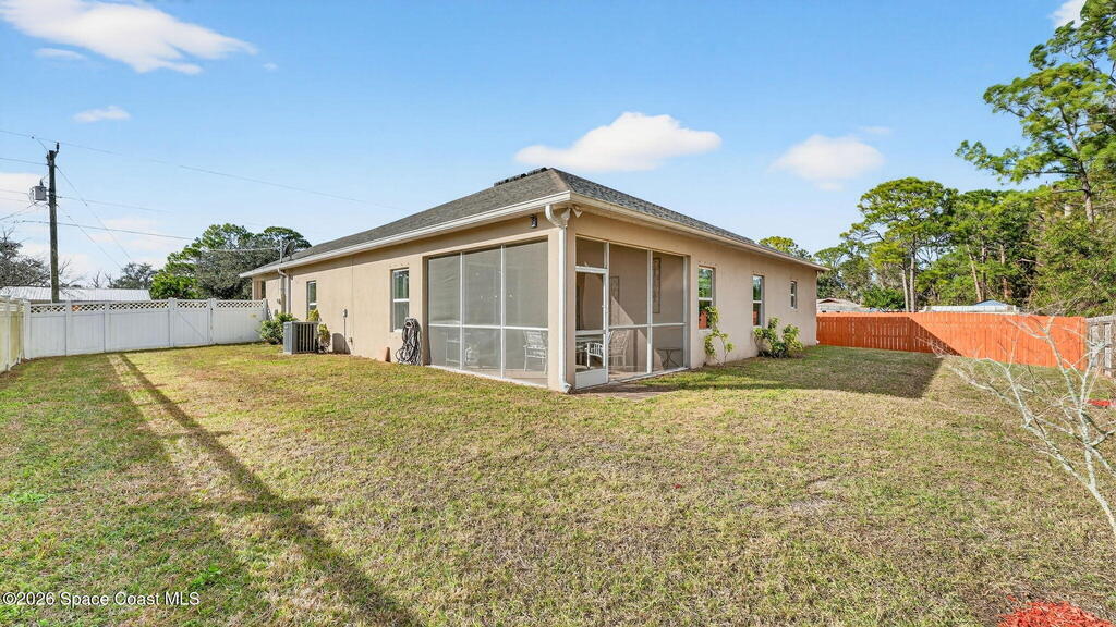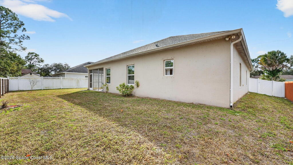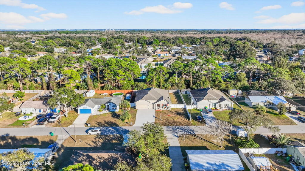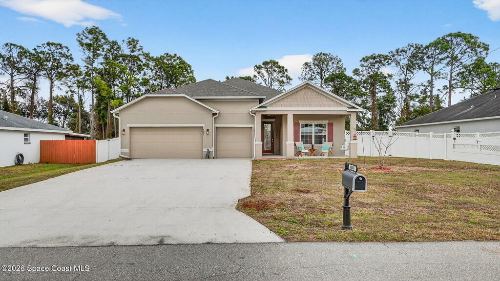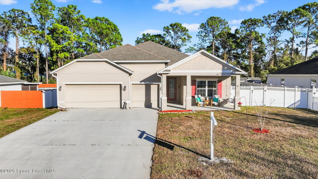 This is the home you've been waiting for! Built in 2019, this well-maintained home offers a 3-car garage, modern finishes, open-concept living & desirable Space Coast location. Wood-look tile flooring flows thru-out the main living areas, connecting living, dining, & kitchen spaces ideal for both everyday living & entertaining. The kitchen is thoughtfully designed w/42-inch cabinets, granite countertops & generous workspace. The spacious primary bedroom suite features tray ceilings, an oversized closet, & a beautiful bath w/tiled shower. Two additional guest bedrooms, guest bath & flex room provide plenty of space for family, guests or a home office. Situated on a .24-acre lot, the property offers a spacious outdoor setting w/fully fenced yard featuring vinyl fencing, providing privacy & room for pets, play or Future Pool. Conveniently located near I-95 for easy Orlando commute & just Mins from NASA, SpaceX & major aerospace employers. Mins to beaches, shopping, Local Eats & Schools!