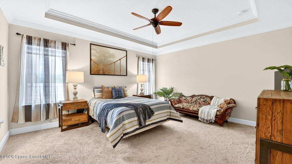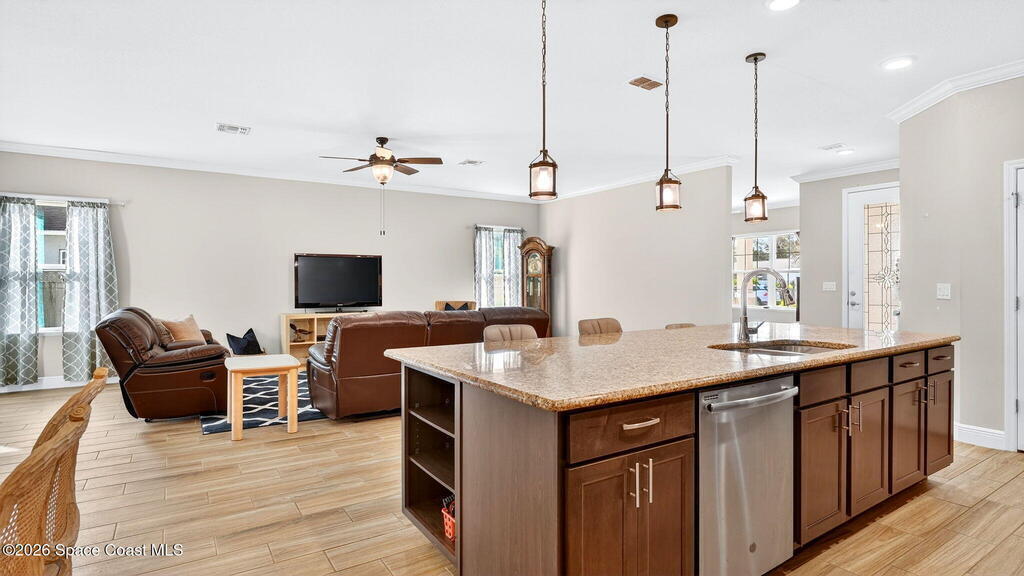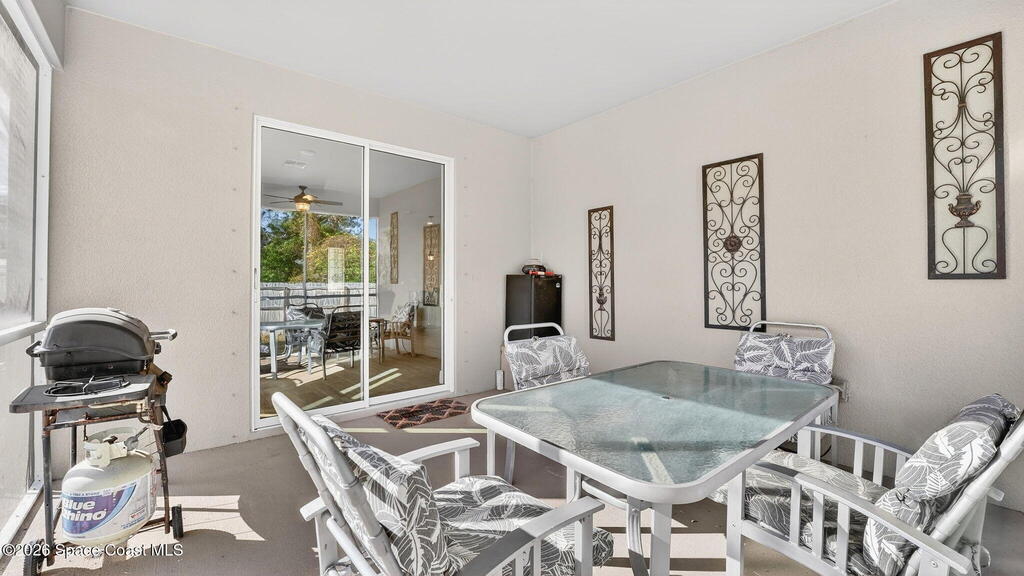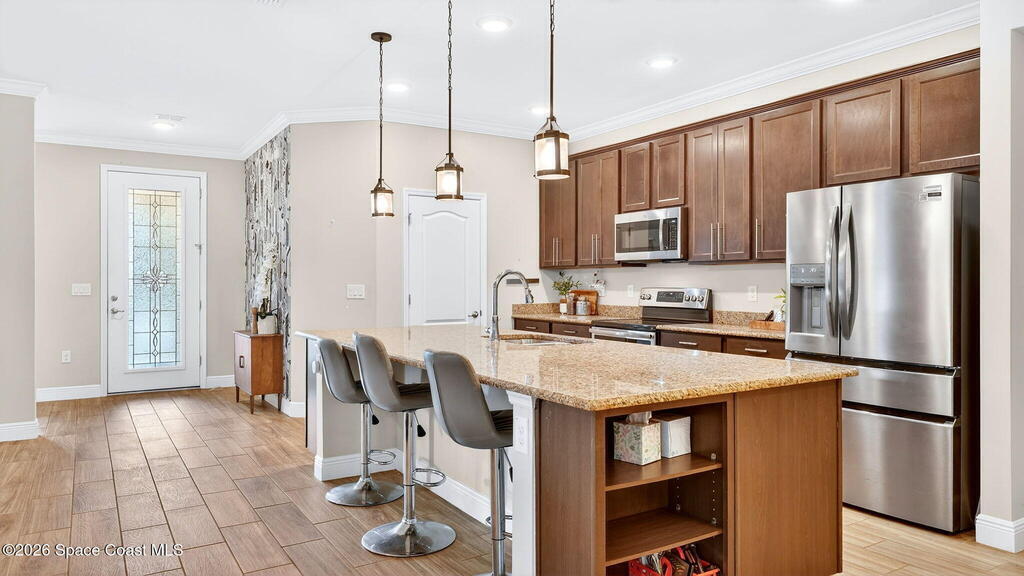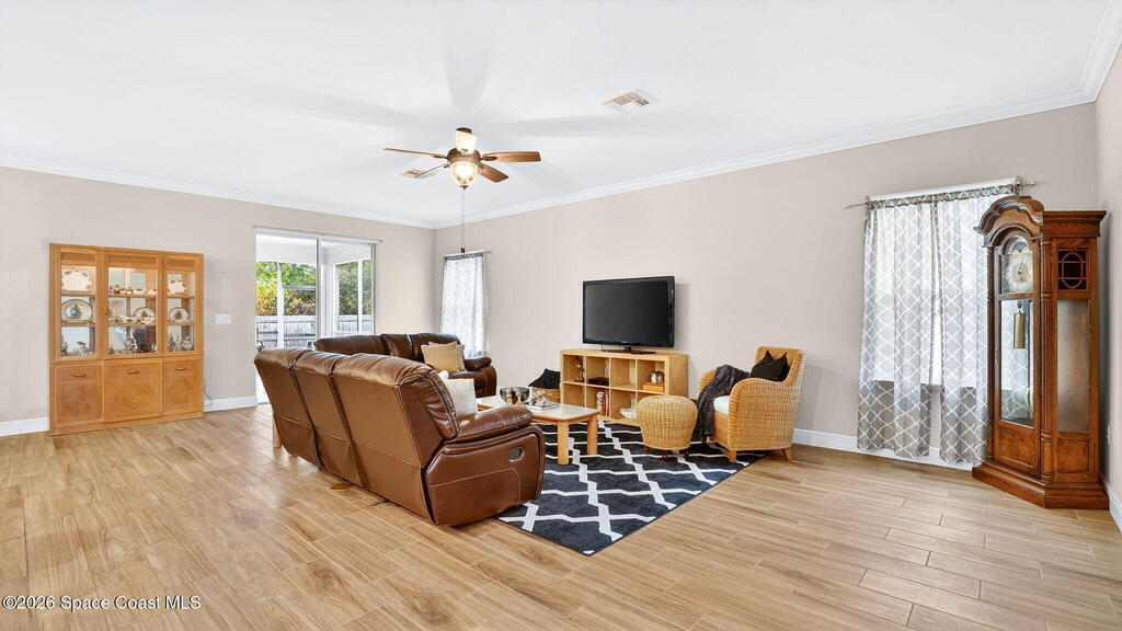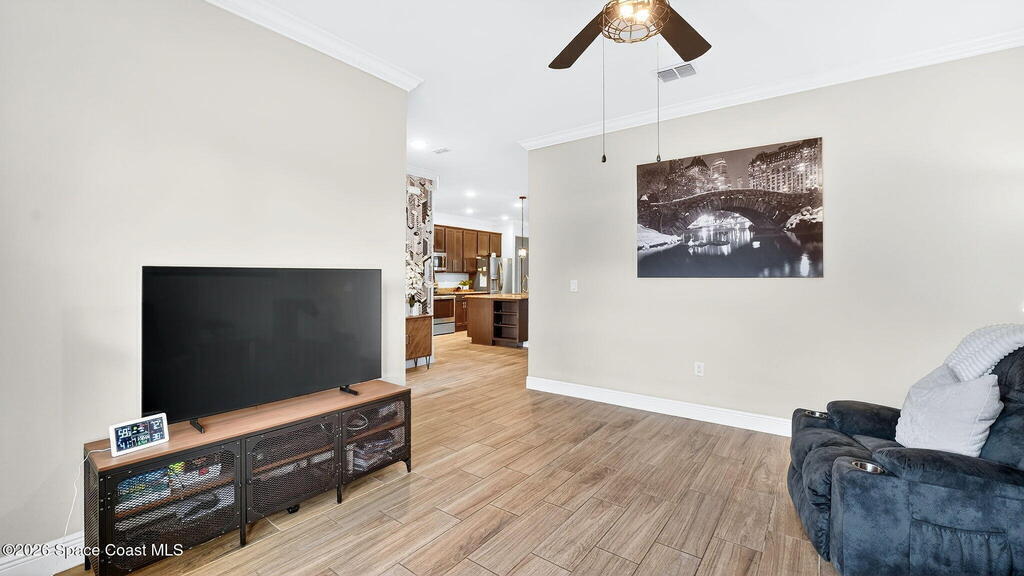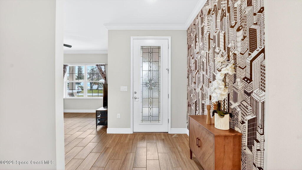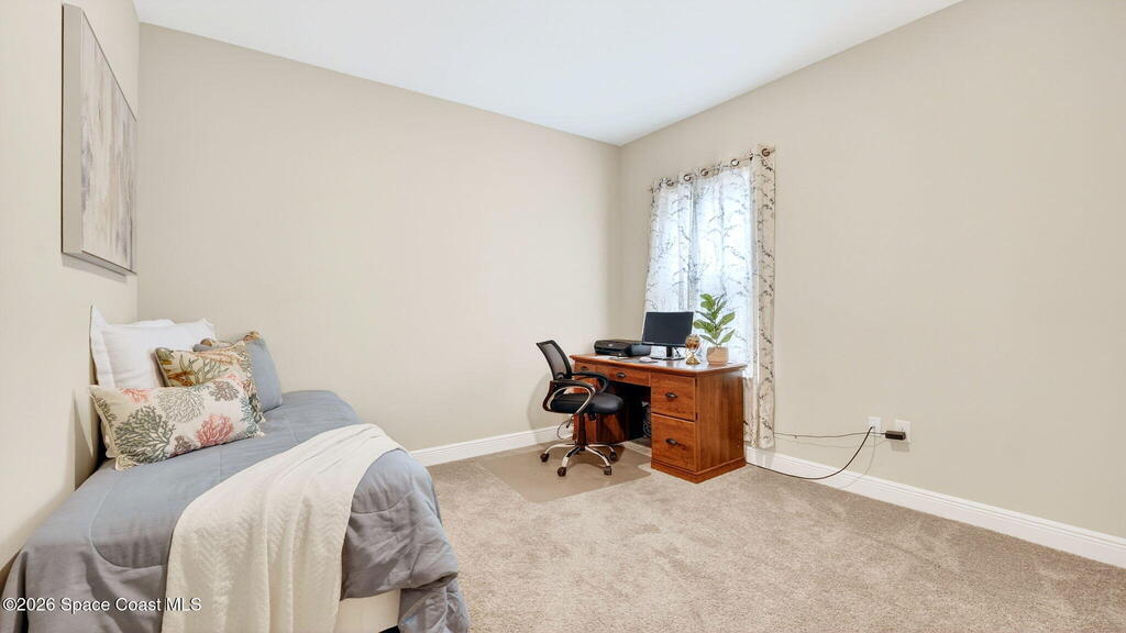 This is the home you've been waiting for! Built in 2019, this well-maintained home offers a 3-car garage, modern finishes, open-concept living & desirable Space Coast location. Wood-look tile flooring flows thru-out the main living areas, connecting living, dining, & kitchen spaces ideal for both everyday living & entertaining. The kitchen is thoughtfully designed w/42-inch cabinets, granite countertops & generous workspace. The spacious primary bedroom suite features tray ceilings, an oversized closet, & a beautiful bath w/tiled shower. Two additional guest bedrooms, guest bath & flex room provide plenty of space for family, guests or a home office. Situated on a .24-acre lot, the property offers a spacious outdoor setting w/fully fenced yard featuring vinyl fencing, providing privacy & room for pets, play or Future Pool. Conveniently located near I-95 for easy Orlando commute & just Mins from NASA, SpaceX & major aerospace employers. Mins to beaches, shopping, Local Eats & Schools!