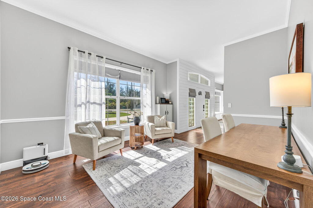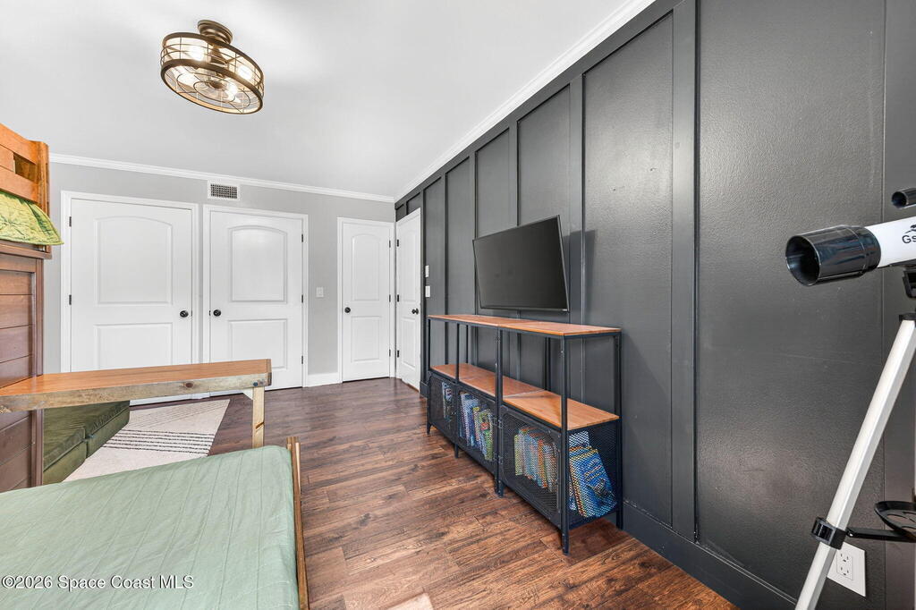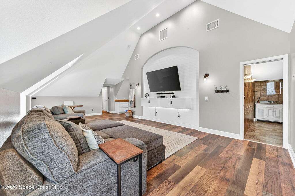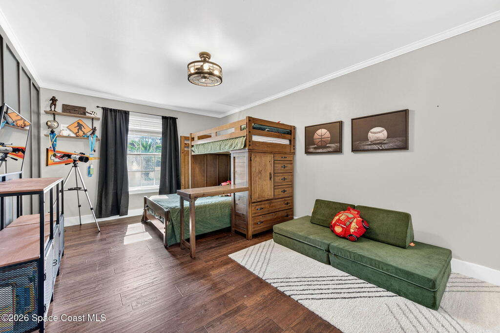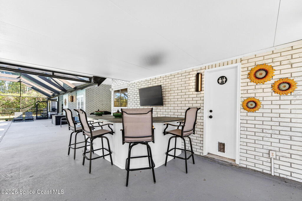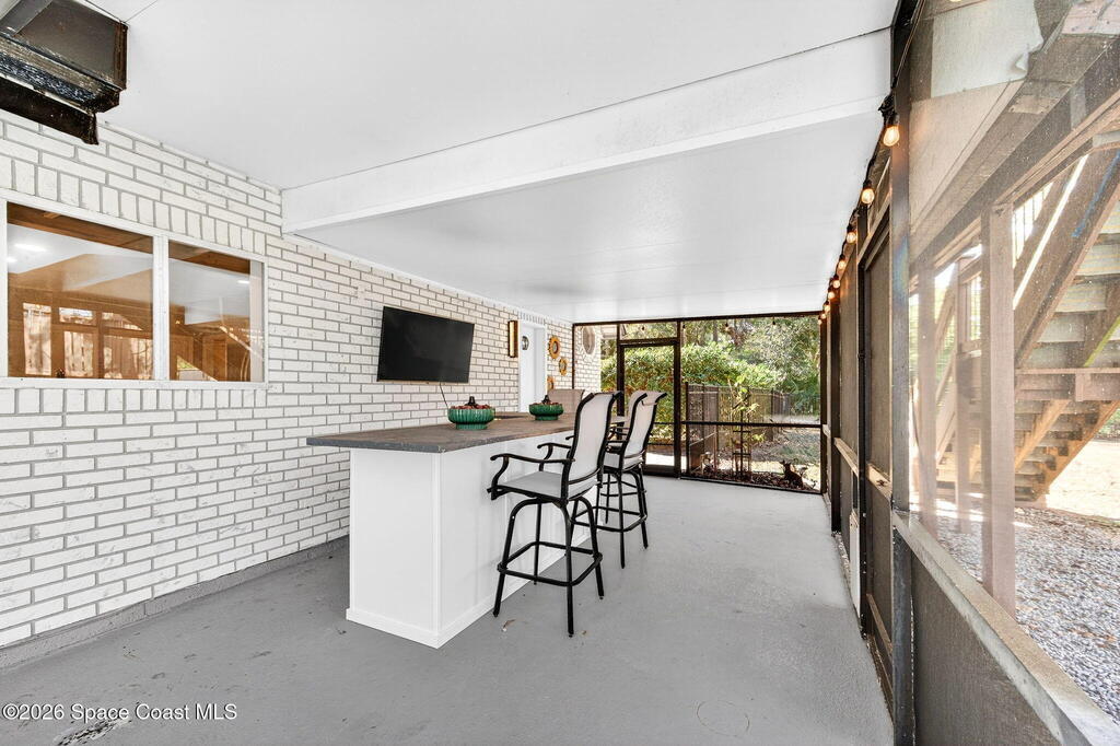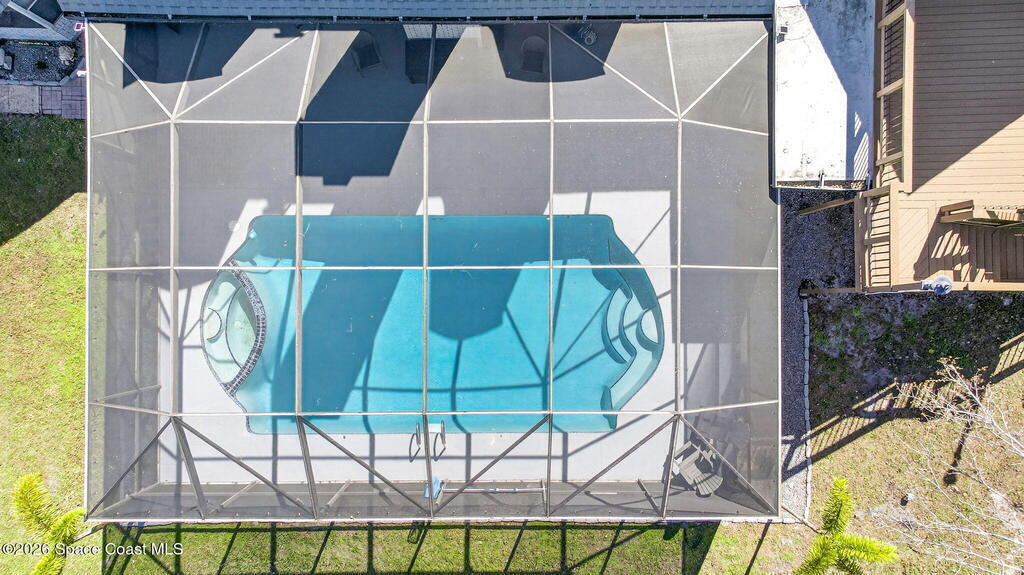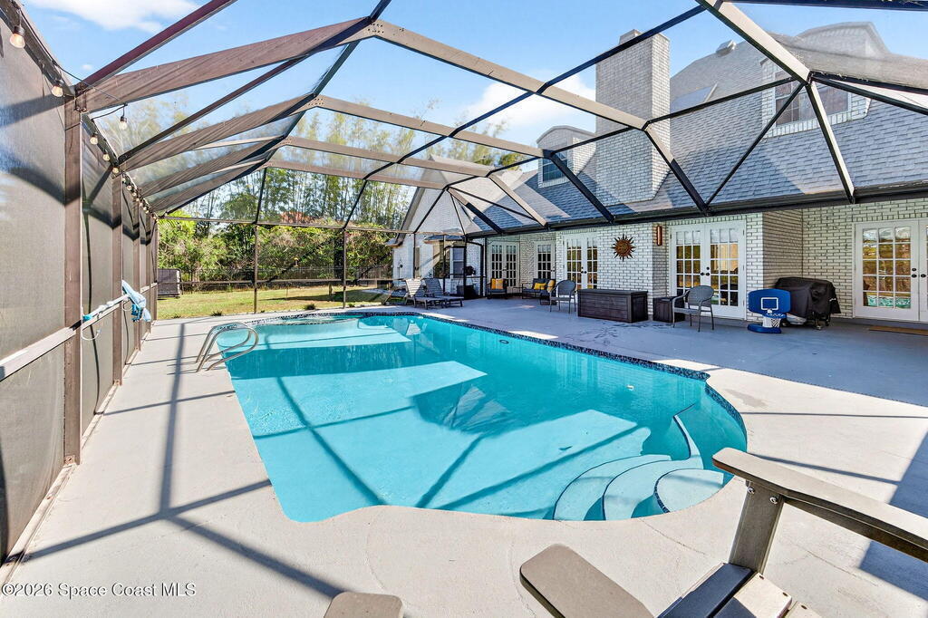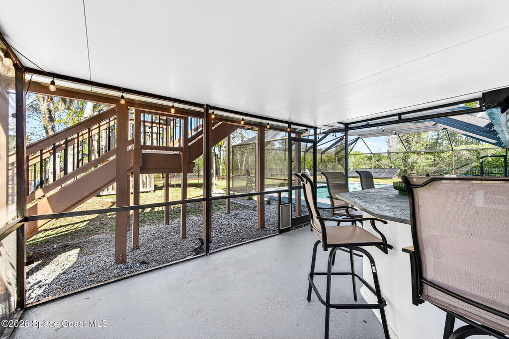 Situated on a 1 acre lot, this 5000+ SF modern farmhouse style pool home is located in the well regarded Rambling Acres subdivision in NW Titusville. The 1st floor offers 4 bedrooms, a formal living room, formal dining room, family room with electric fireplace, updated gourmet eat in kitchen with granite countertops, stainless steel appliances & a beverage fridge plus a mud room & laundry room off of the kitchen with a seperate entrance. The 2nd level includes a family room, kitchenette, game room, 1 bedroom with an ensuite bathroom, an additional full guest bathroom & a private entrance with an exterior deck that overlooks the backyard. Exterior features include a screened in solar heated chlorine pool, fully fenced yard with a shed and a playground backing up to a wooded area where wildlife resides. Under the lanai there is an outdoor entertainment area with a bar. There are so many upgrades to note to include a new roof with solar vents in 2025.
