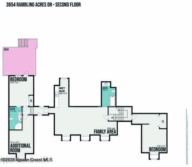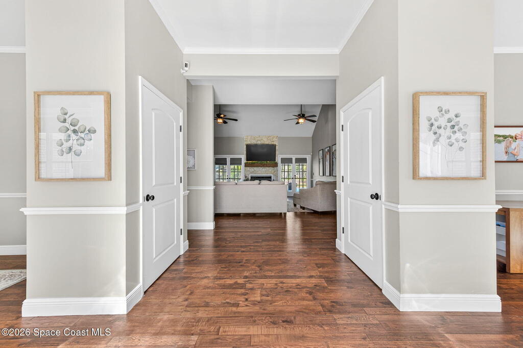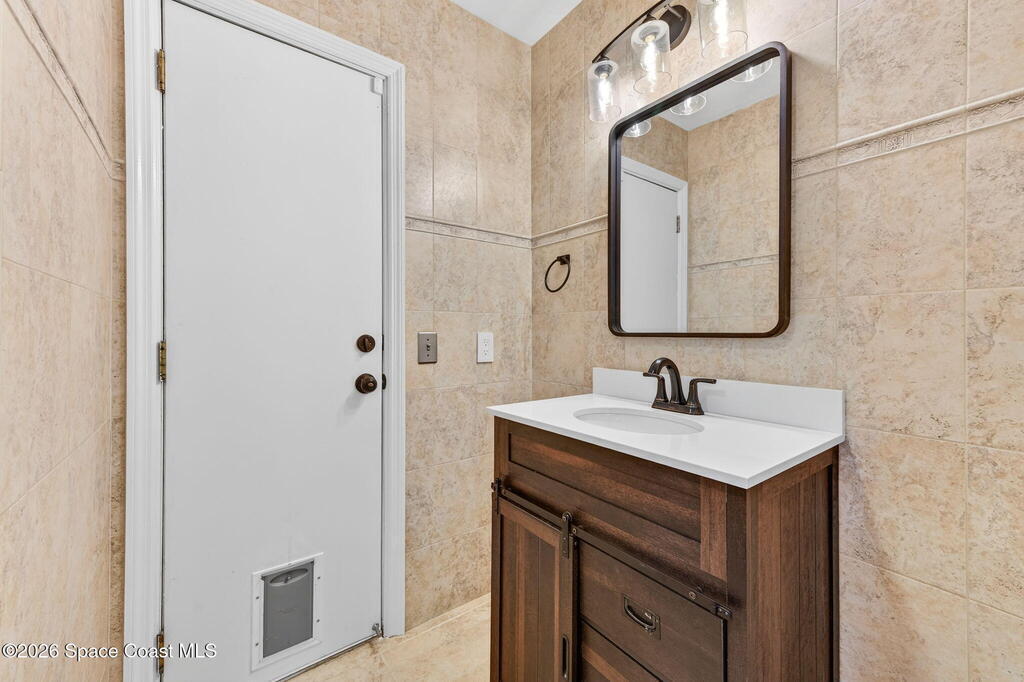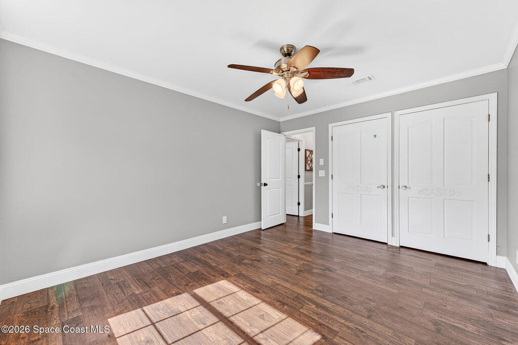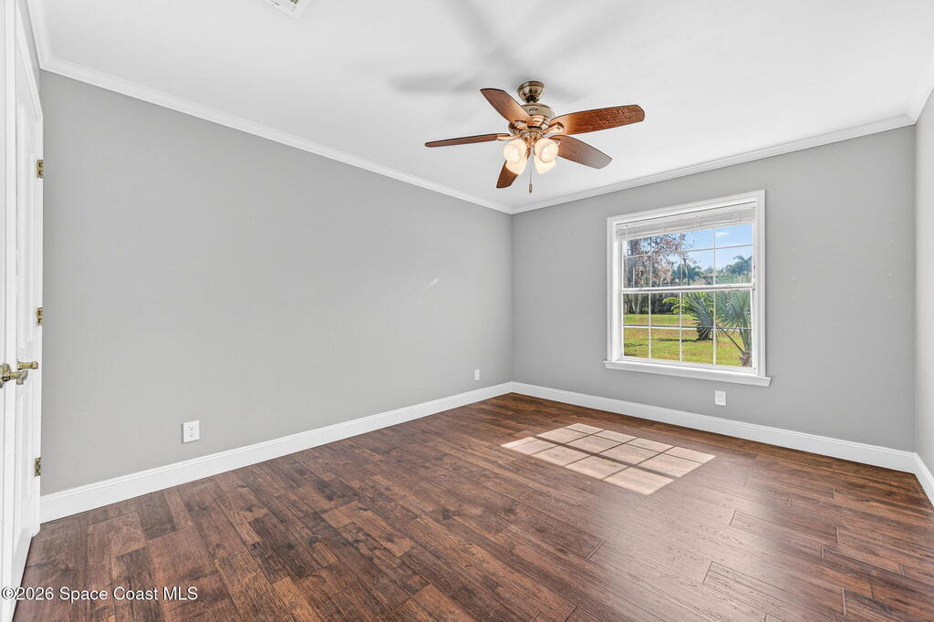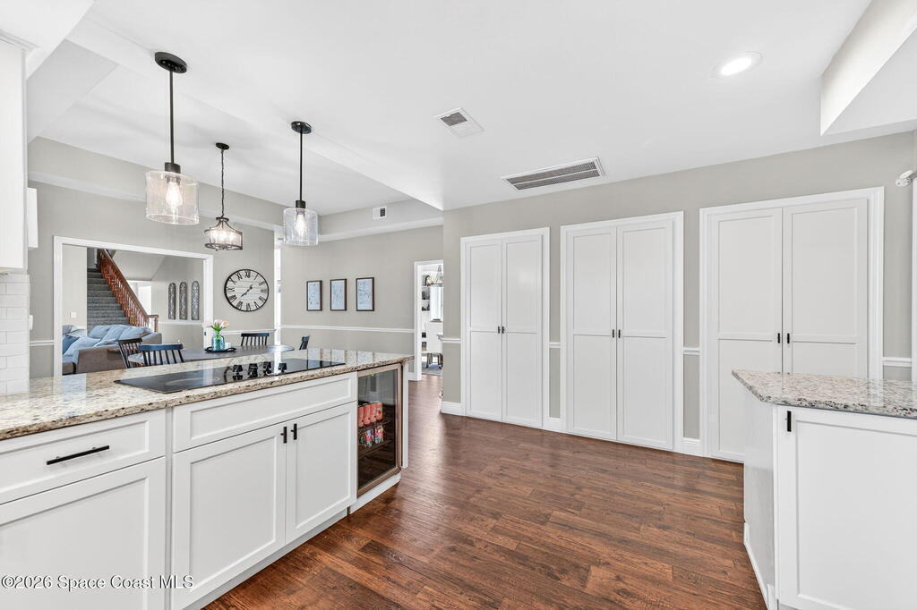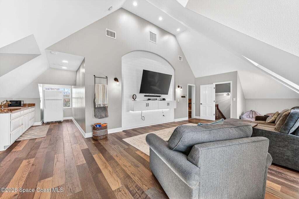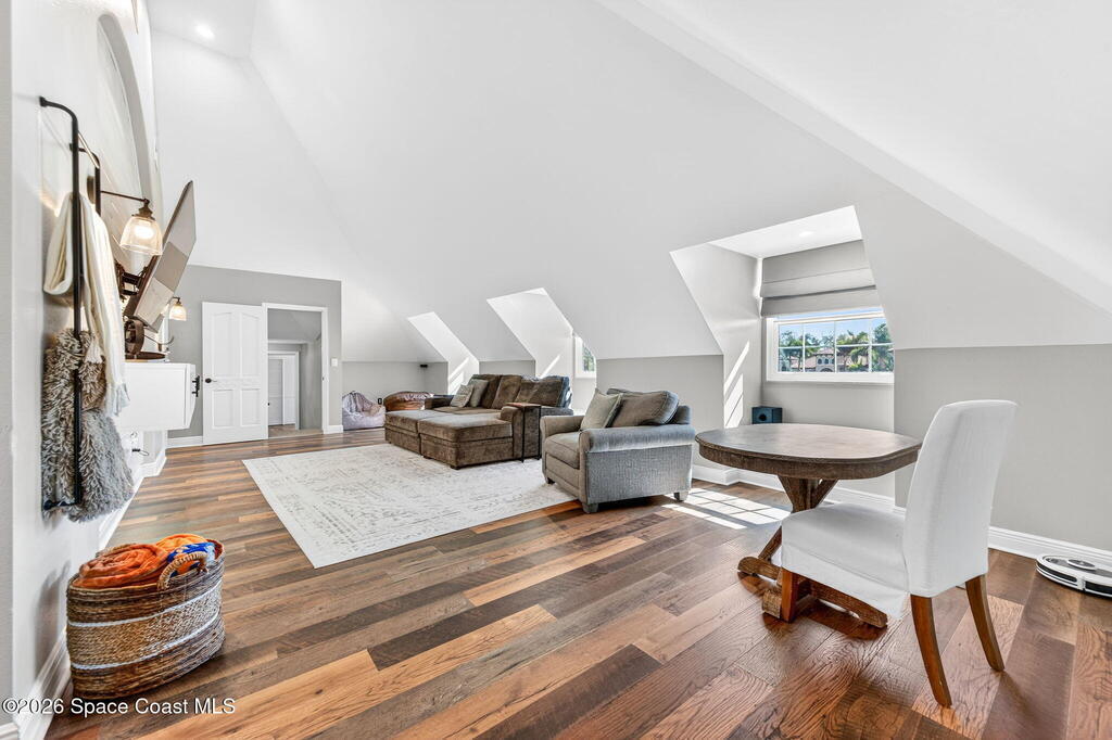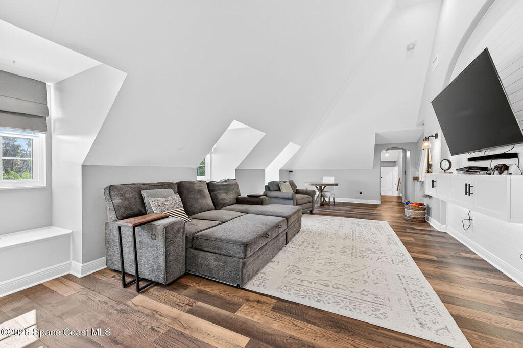 Situated on a 1 acre lot, this 5000+ SF modern farmhouse style pool home is located in the well regarded Rambling Acres subdivision in NW Titusville. The 1st floor offers 4 bedrooms, a formal living room, formal dining room, family room with electric fireplace, updated gourmet eat in kitchen with granite countertops, stainless steel appliances & a beverage fridge plus a mud room & laundry room off of the kitchen with a seperate entrance. The 2nd level includes a family room, kitchenette, game room, 1 bedroom with an ensuite bathroom, an additional full guest bathroom & a private entrance with an exterior deck that overlooks the backyard. Exterior features include a screened in solar heated chlorine pool, fully fenced yard with a shed and a playground backing up to a wooded area where wildlife resides. Under the lanai there is an outdoor entertainment area with a bar. There are so many upgrades to note to include a new roof with solar vents in 2025.