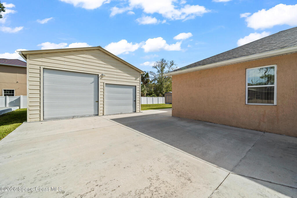 Welcome to this 3-bedroom, 2-bath residence where refined craftsmanship meets exceptional functionality with NO HOA!! The home features a 2-car oversized garage along with a separate, fully equipped garage/workshop complete with a car lift & 100 amp sub panel which offers a rare and highly desirable amenity for collectors, hobbyists, or those seeking premium versatility. An extended driveway provides generous parking, while hurricane impact windows deliver both security and peace of mind. Inside, the kitchen is highlighted by custom wood finishes, creating a warm yet upscale aesthetic that blends timeless character with modern appeal. Outdoors, the expansive covered back porch serves as a private retreat, and a 50 amp for hot tub hook-up, ideal for relaxing or entertaining in a serene setting. Perfectly positioned near shopping and dining, this peaceful property offers privacy and convenience without HOA restrictions.