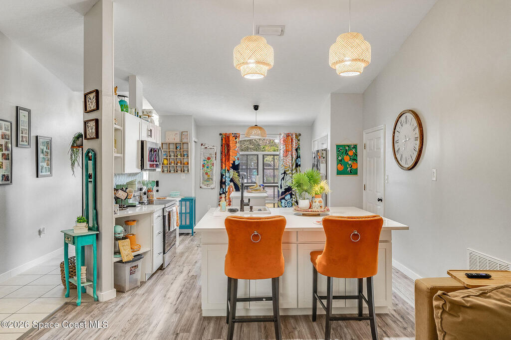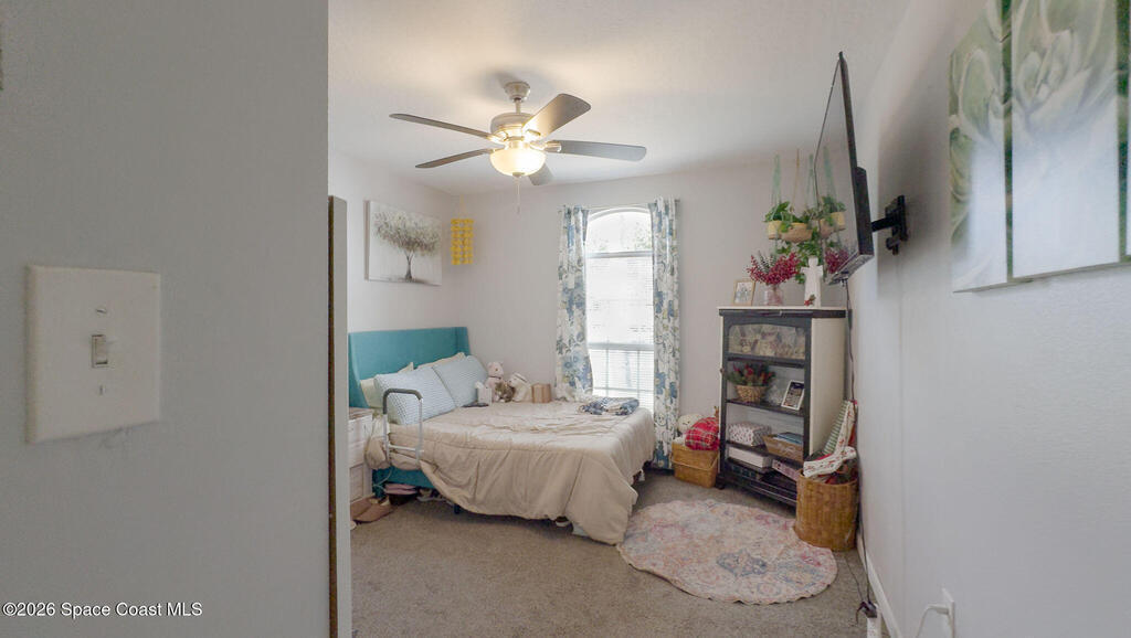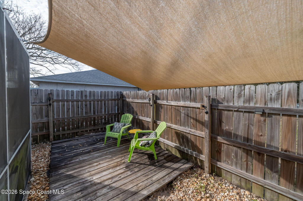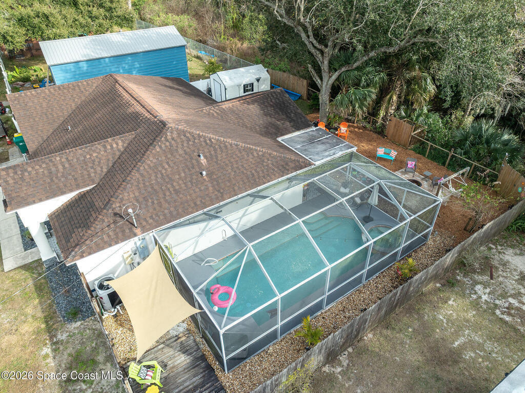Gorgeous 3-bedroom, 2-bath pool home that has been meticulously maintained. The kitchen features newer stainless steel appliances, two pantries, and a large picture window that fills the space with natural light. Vaulted cathedral ceilings enhance the open great room, with sliders leading to the Florida room under air. The split floor plan offers comfortable, open living, and all bathrooms include solid surface countertops. Step outside to a screened, heated pool and spa with a sitting area--ideal for entertaining, relaxing, or enjoying added privacy. The backyard also features a paver patio with fire pit and swings, plus a storage shed and separate shop. A bonus room adds flexible living space. The property backs up to unbuildable natural beauty and offers incredible rocket launch views right from your door. Conveniently located near major roadways, schools, shopping, and nearby tech employers--this is Florida living at its best!
