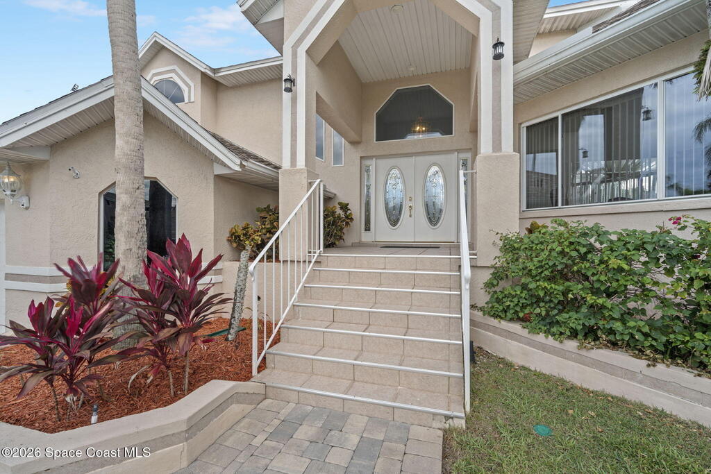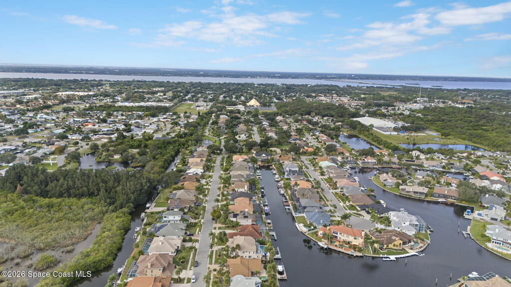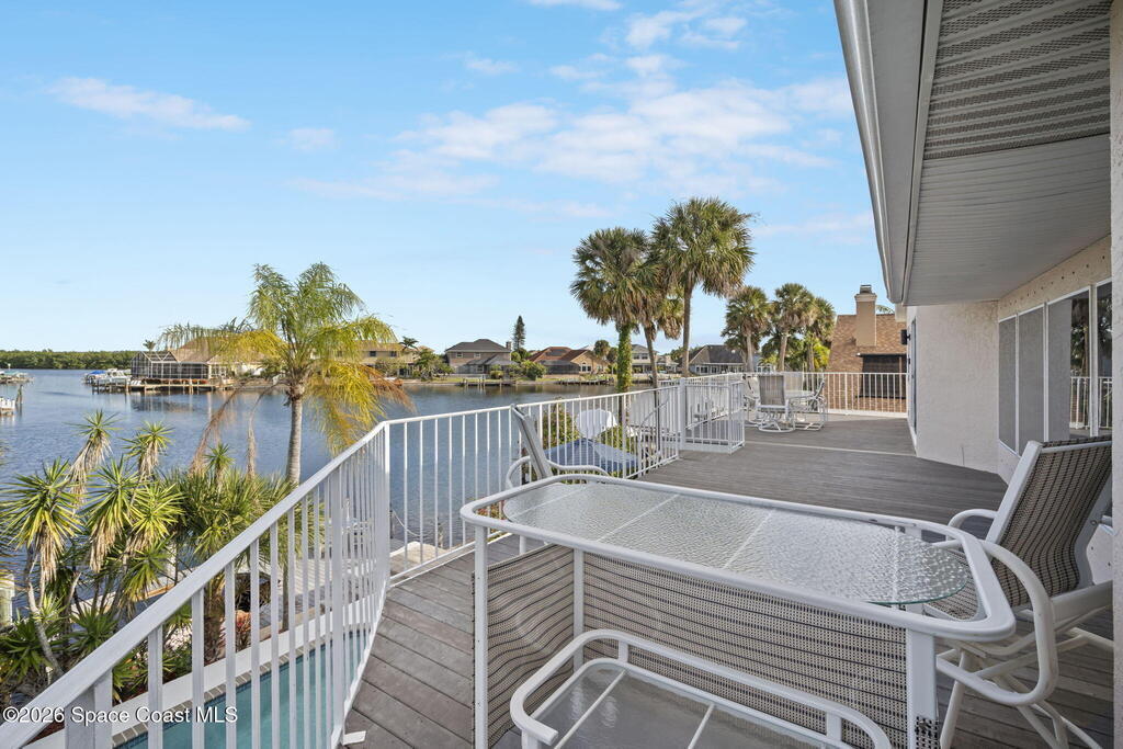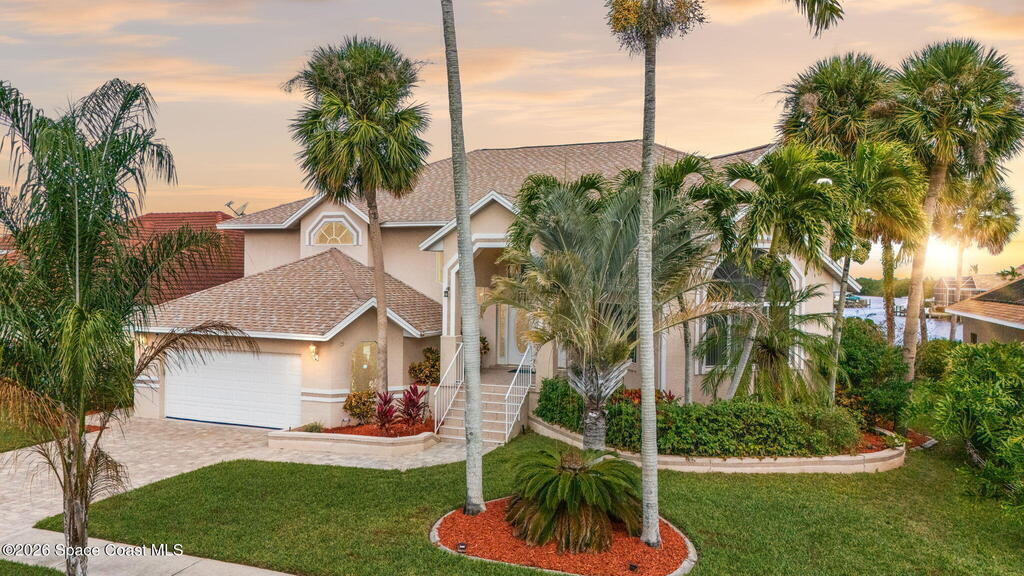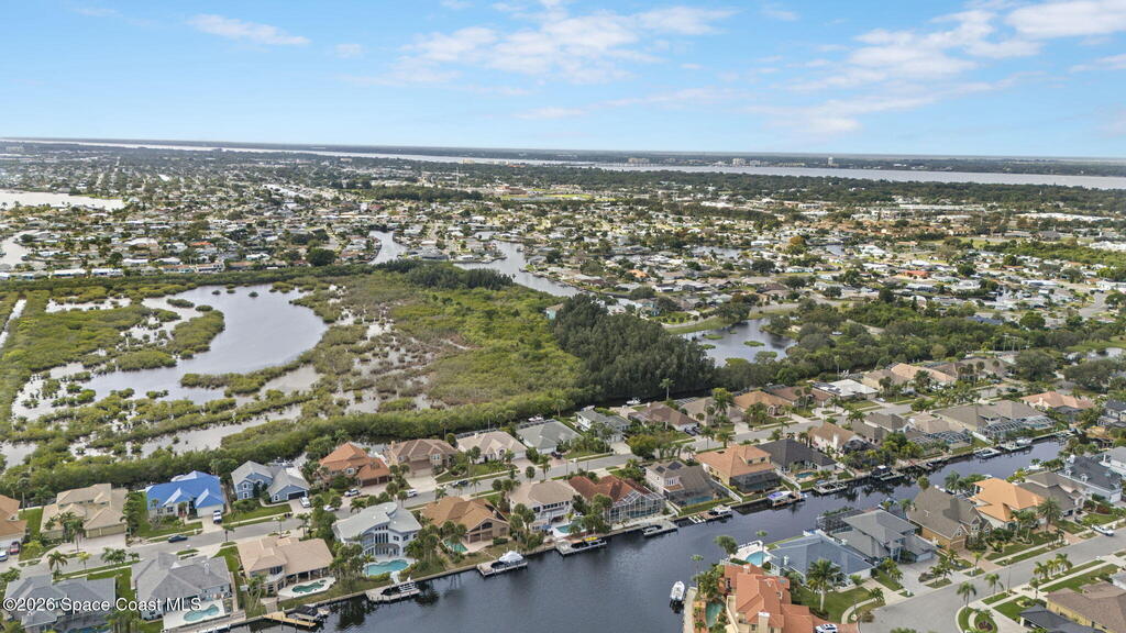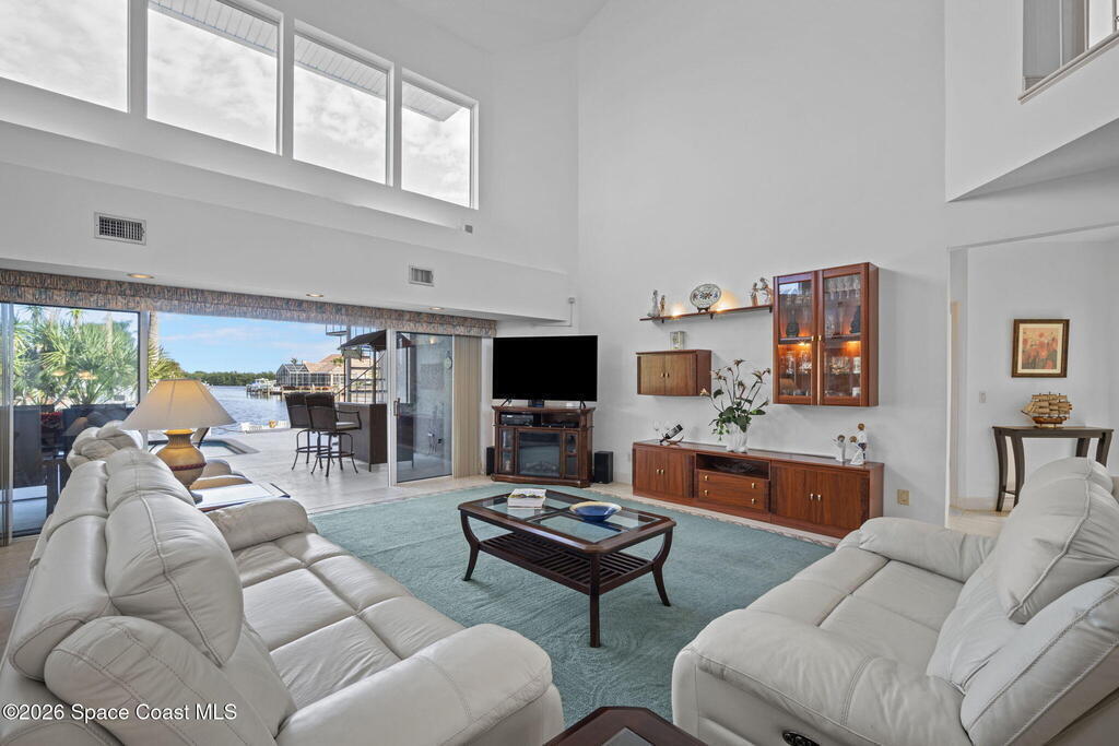 Located in the heart of Central Merritt Island on a deepwater canal with easy access to the Banana River, Indian River, and Atlantic Ocean, this waterfront home offers the ideal coastal lifestyle. The neighborhood features manicured landscaping, sidewalk-lined streets, and quiet dead-end roads. 1994 Sykes Creek Drive is grand and extremely well maintained. Inside, soaring 20-foot ceilings and a spacious family room are perfect for entertaining. The expansive kitchen offers ample counter space, storage, and beautiful Sykes Creek views. Natural light pours in through walls of windows and a dramatic oversized slider, creating seamless indoor-outdoor living. Step outside to a tropical backyard with covered lanai, pool with spillover spa, outdoor kitchen, generous seating areas, and a private dock just steps away. Water views continue in the primary suite with vaulted ceilings, private balcony, and spa-like bath ready for your personal touch. Three additional bedrooms share two full baths!