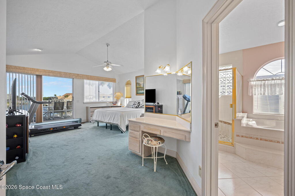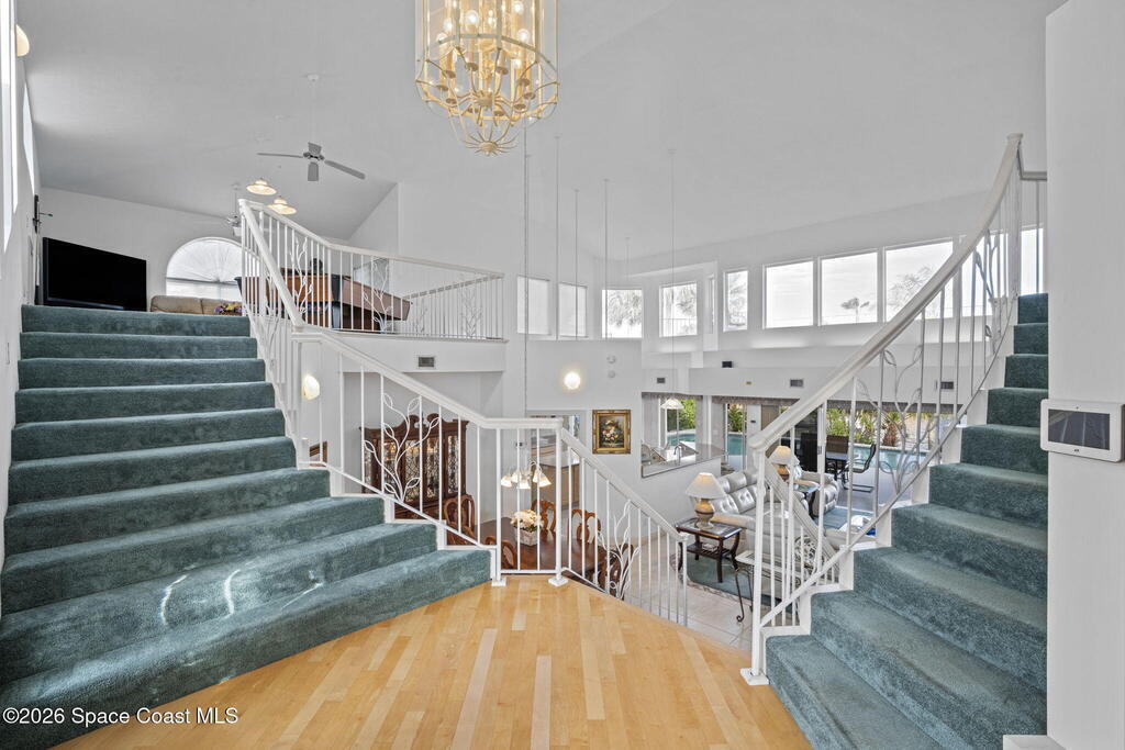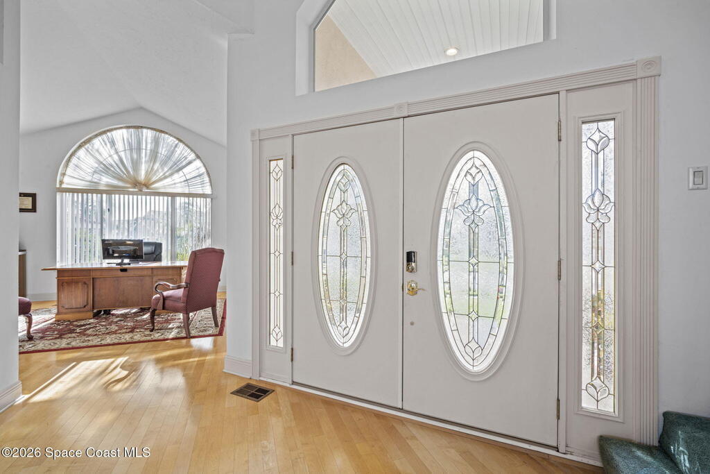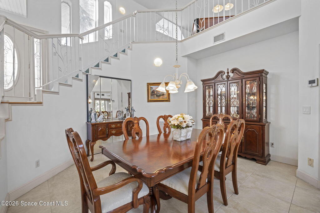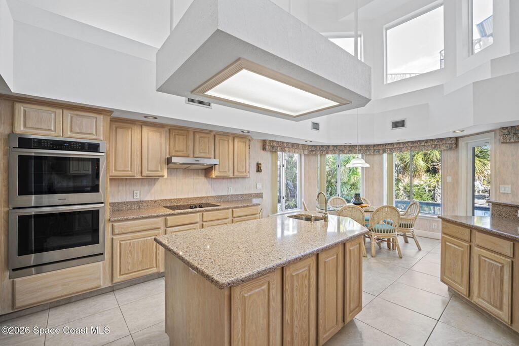Located in the heart of Central Merritt Island on a deepwater canal with easy access to the Banana River, Indian River, and Atlantic Ocean, this waterfront home offers the ideal coastal lifestyle. The neighborhood features manicured landscaping, sidewalk-lined streets, and quiet dead-end roads. 1994 Sykes Creek Drive is grand and extremely well maintained. Inside, soaring 20-foot ceilings and a spacious family room are perfect for entertaining. The expansive kitchen offers ample counter space, storage, and beautiful Sykes Creek views. Natural light pours in through walls of windows and a dramatic oversized slider, creating seamless indoor-outdoor living. Step outside to a tropical backyard with covered lanai, pool with spillover spa, outdoor kitchen, generous seating areas, and a private dock just steps away. Water views continue in the primary suite with vaulted ceilings, private balcony, and spa-like bath ready for your personal touch. Three additional bedrooms share two full baths!